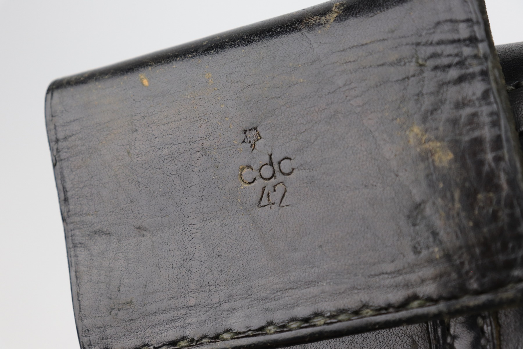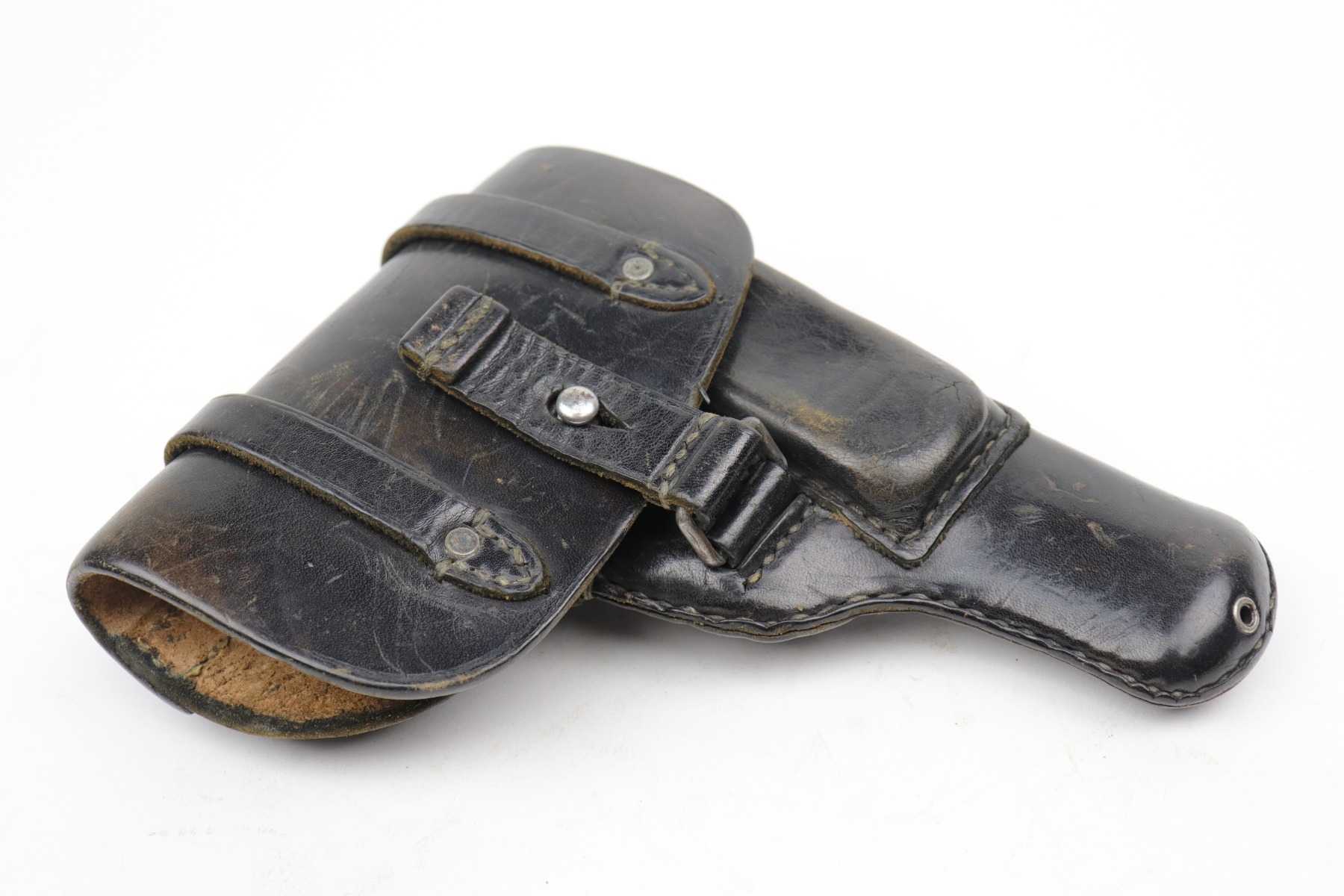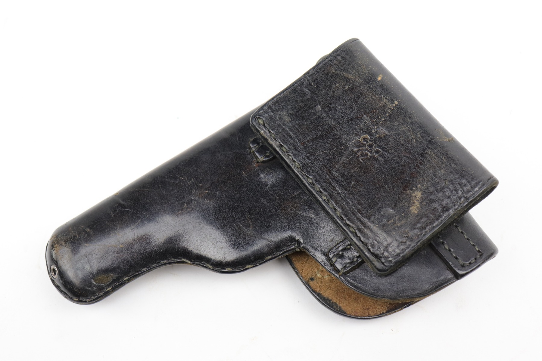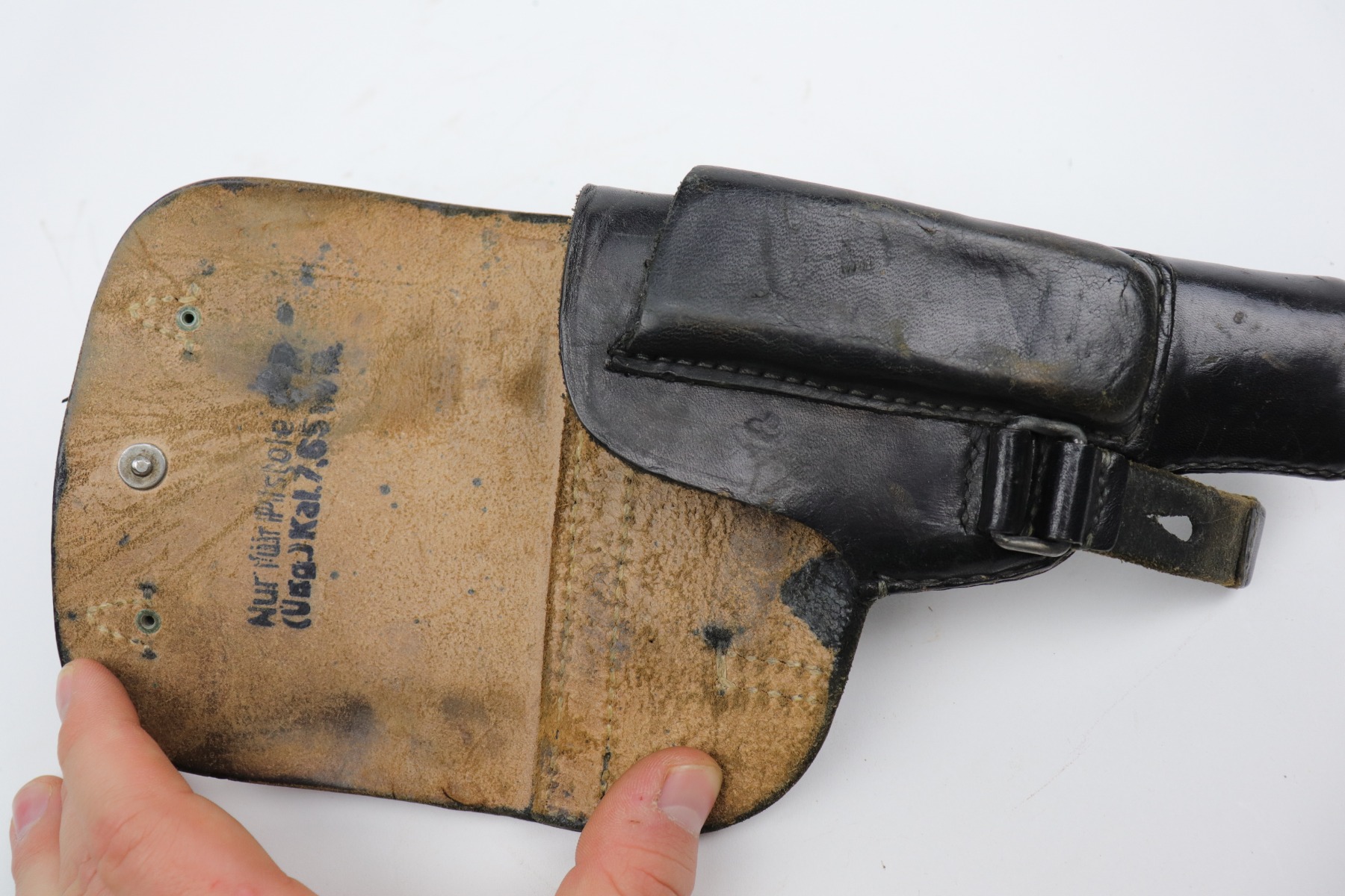 10/14/20 – This is a very nice example of a Luftwaffe-marked dropping-style black leather holster, appropriate for a Luftwaffe-contract Walther PP. It is dated 1942 and makers marked on the back. The ink stamp on the inside is visible but ink-stained on the top right corner. The leather is pretty nice, but there are scuffs and minor dings throughout.