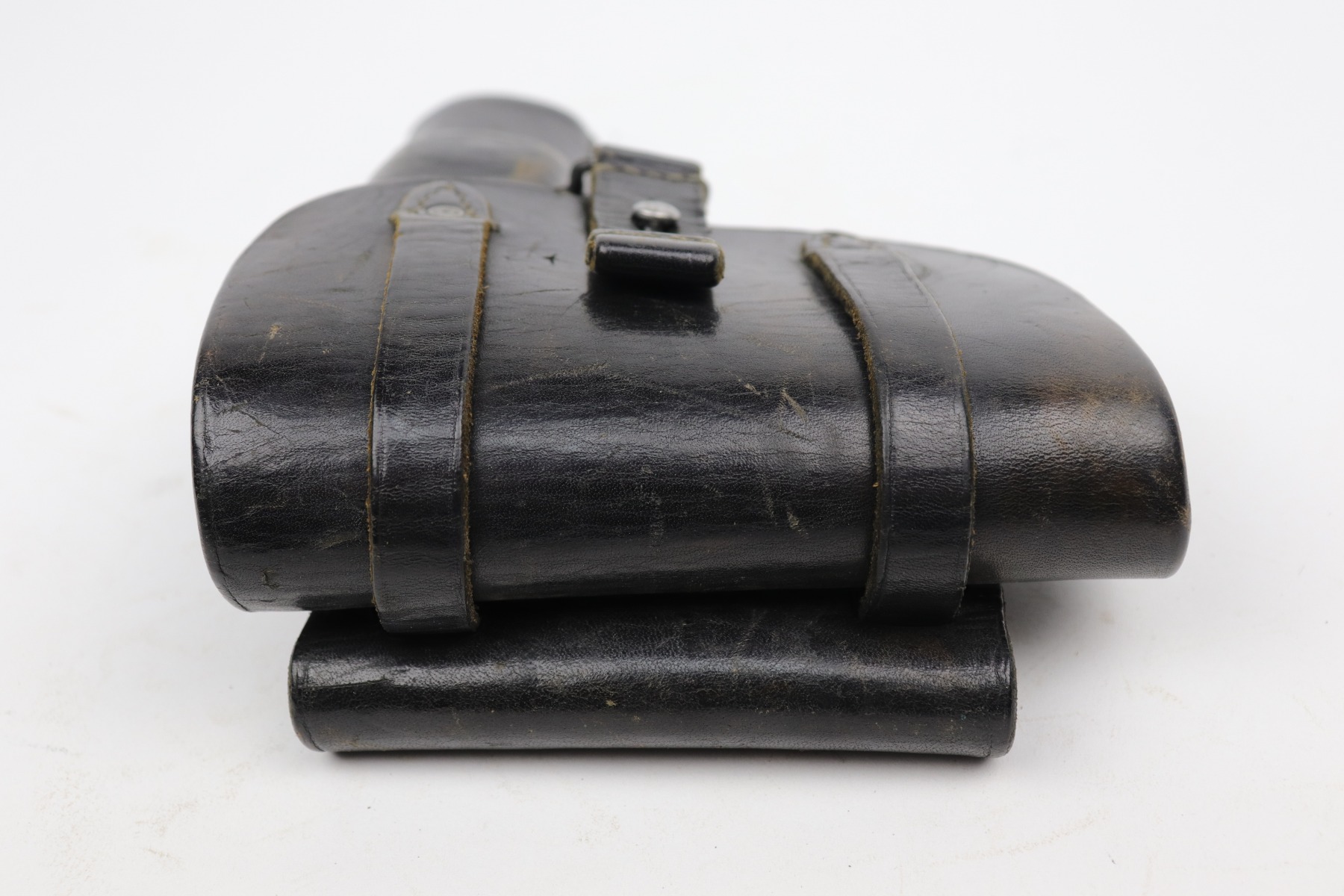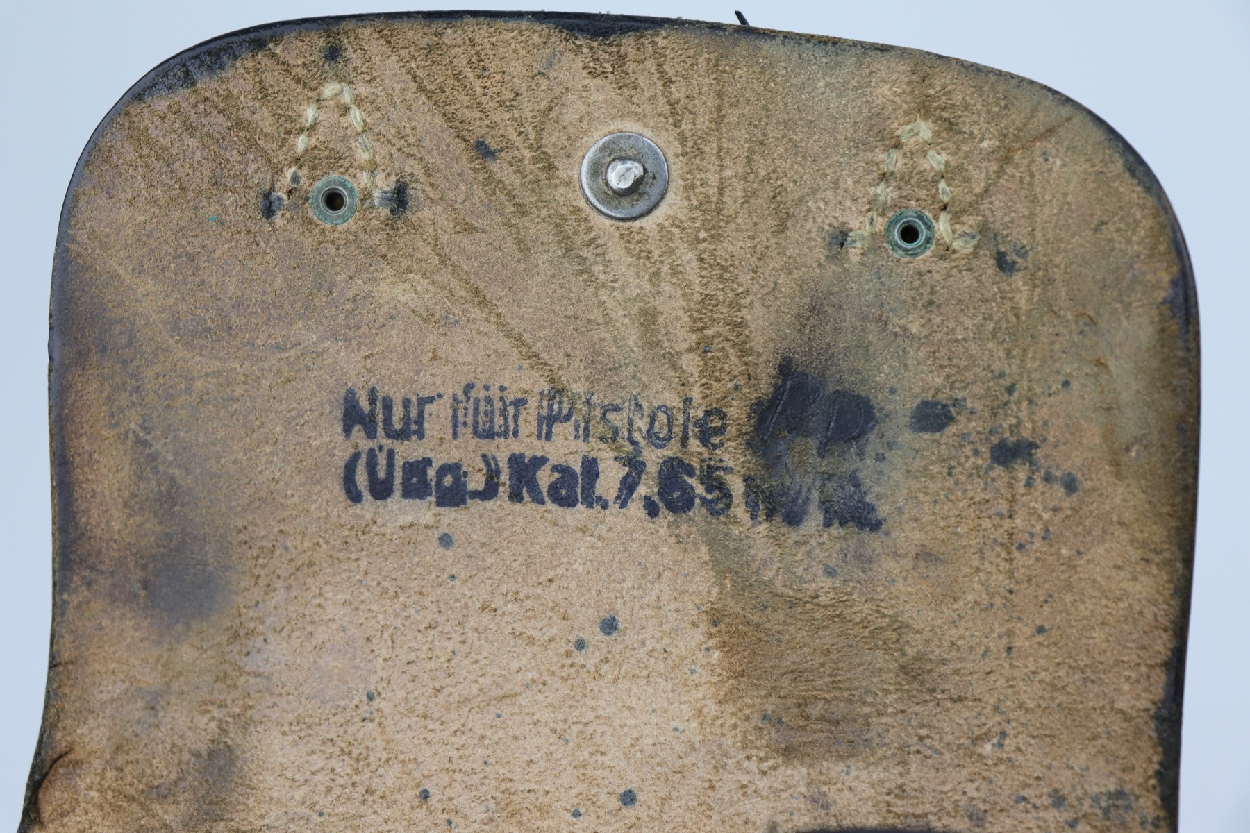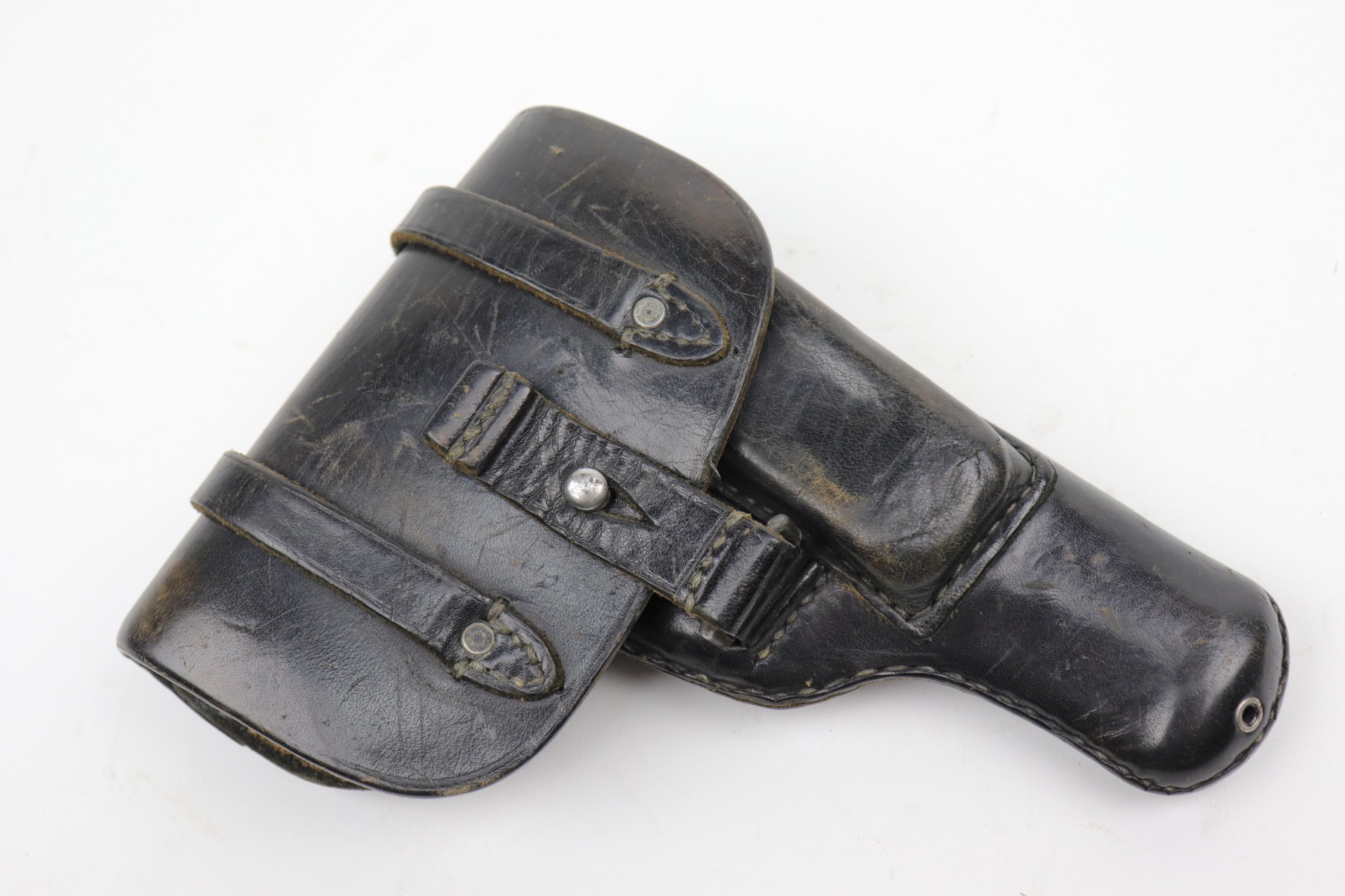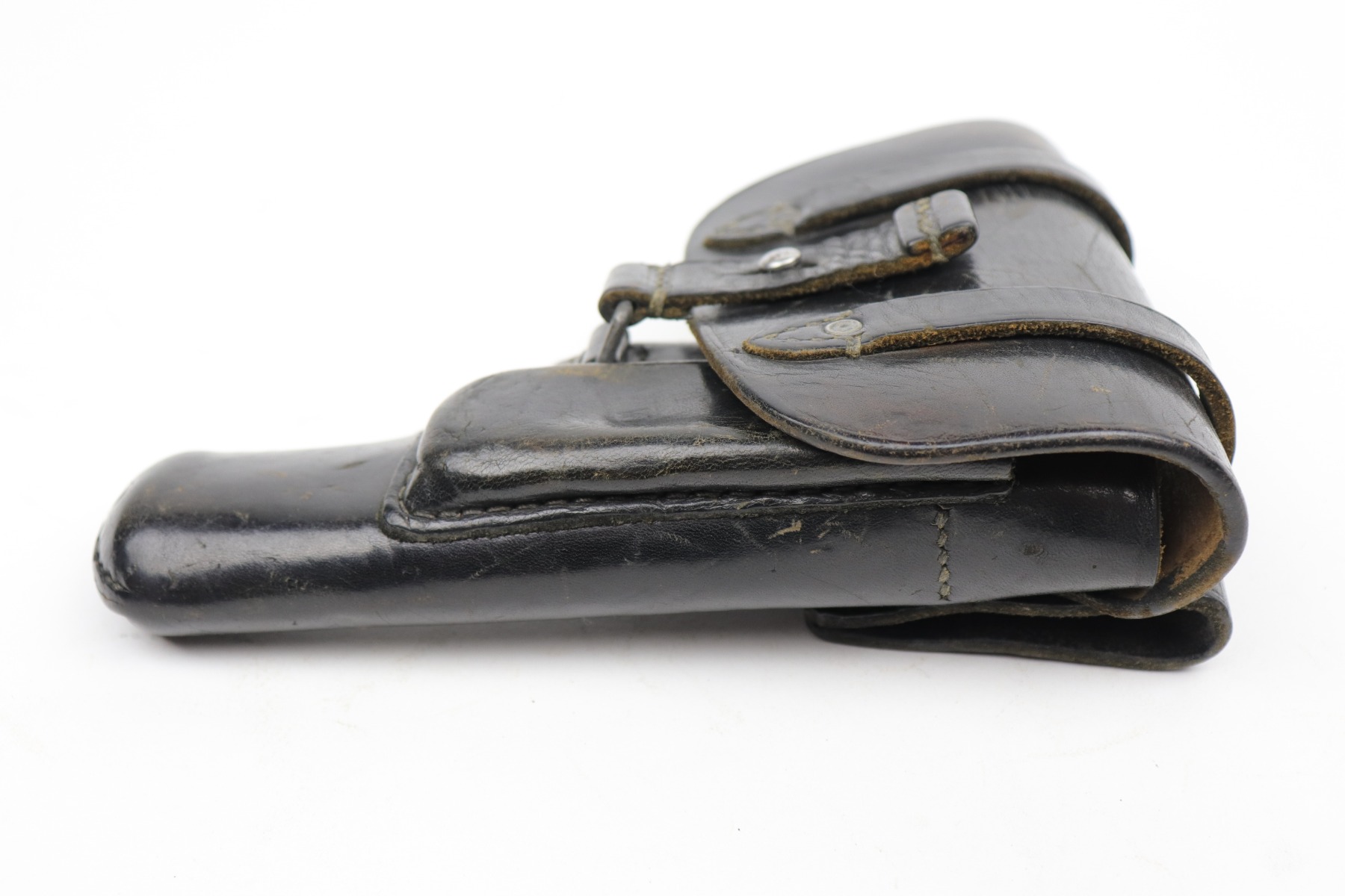 10/14/20 – This is a very nice example of a Luftwaffe-marked dropping-style black leather holster, appropriate for a Luftwaffe-contract Walther PP. It is dated 1942 and makers marked on the back. The ink stamp on the inside is visible but ink-stained on the top right corner. The leather is pretty nice, but there are scuffs and minor dings throughout.