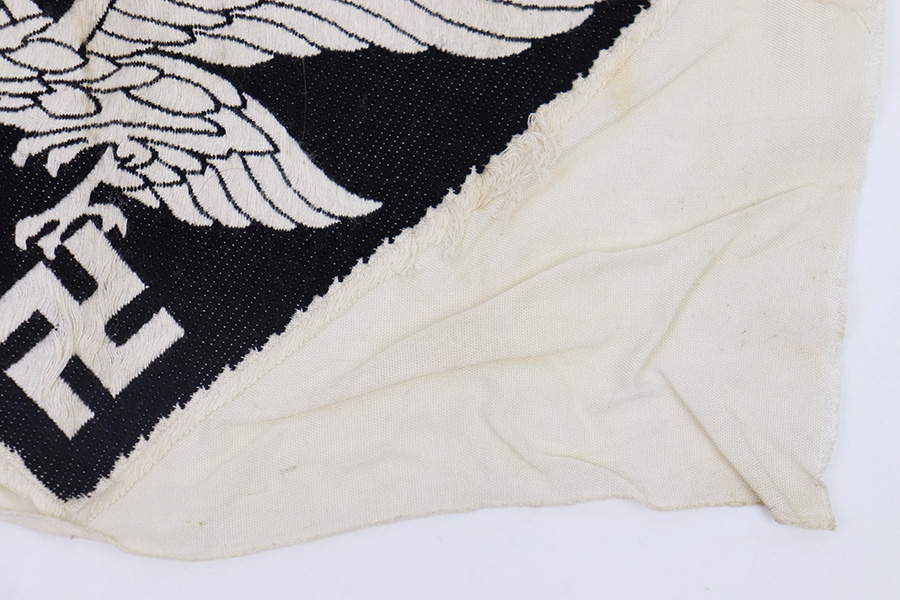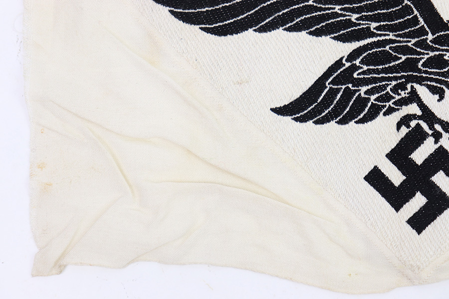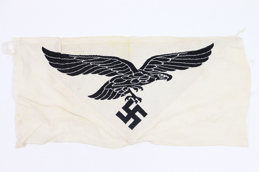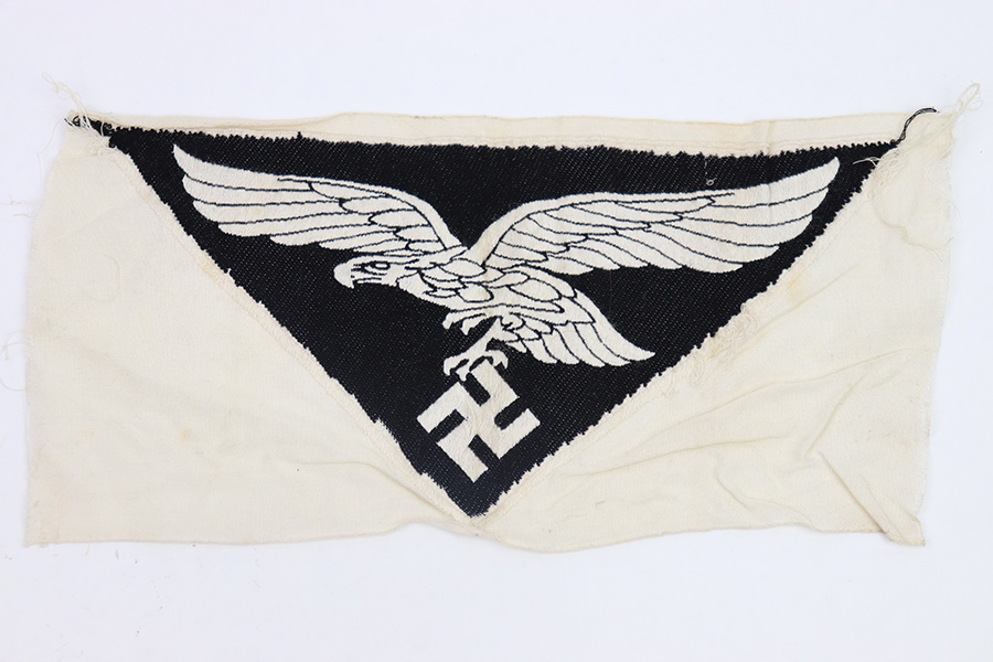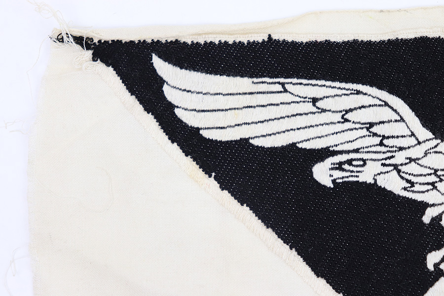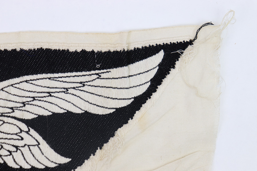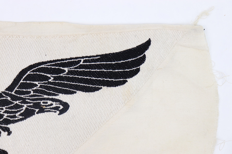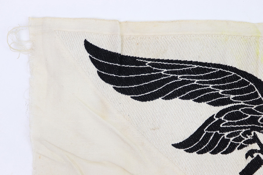 9/23/22 – This is the front Luftwaffe Eagle logo taken from a WW2 German Sport Shirt. The cloth cut-out section is about 11 x 5.5 inches. Great condition with some mild yellowing but overall very clean with a distinctly sewn eagle.
