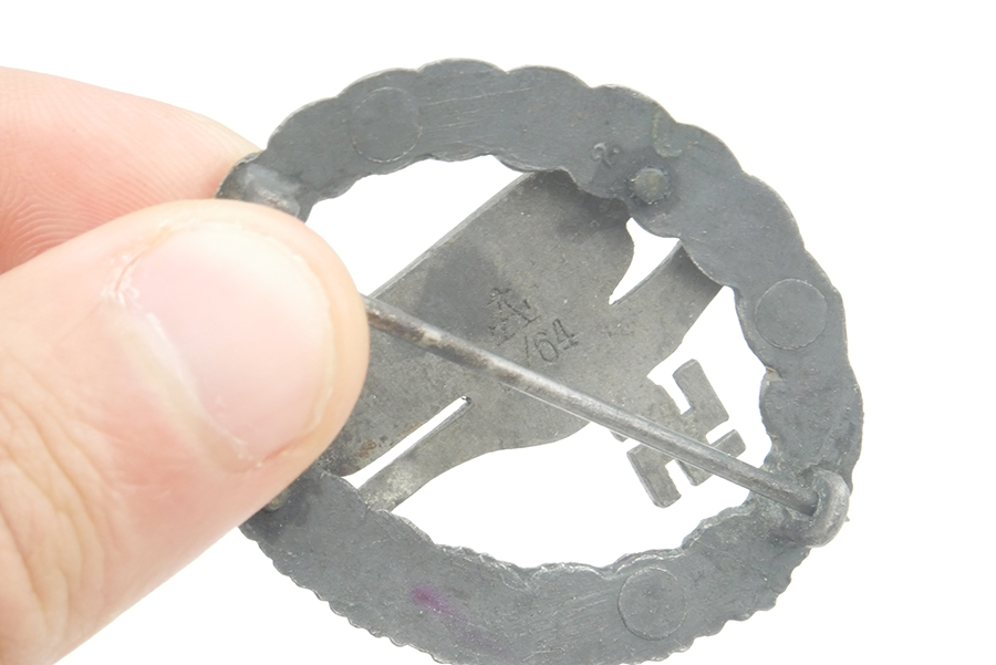 6/19/24 – This is an original, late WW2 production Luftwaffe Paratrooper (Fallschirmjager) badge. The medal is 2-piece construction made from die cast Zinc. This example is featured in the resource book “German Luftwaffe & Heer Army Paratrooper badges of WWII 1936-45”. The book cites this example as a “Type J”, shown on pages 96 and 97. The book mentions vertical and horizontal lines surrounding the catch. These are raised seams, and evidence the reverse die was comprised of several pieces. These seams are found on this example as well, making this a “textbook” example. Great condition with a majority of the black/grey finish on the wreath still intact. The book calls this “brennlack” finish. The eagle has excellent detail, just some mild patina. Well marked on the reverse of the eagle, and has a “2” marking on the wreath. Functional pin and catch. All original and authentic.