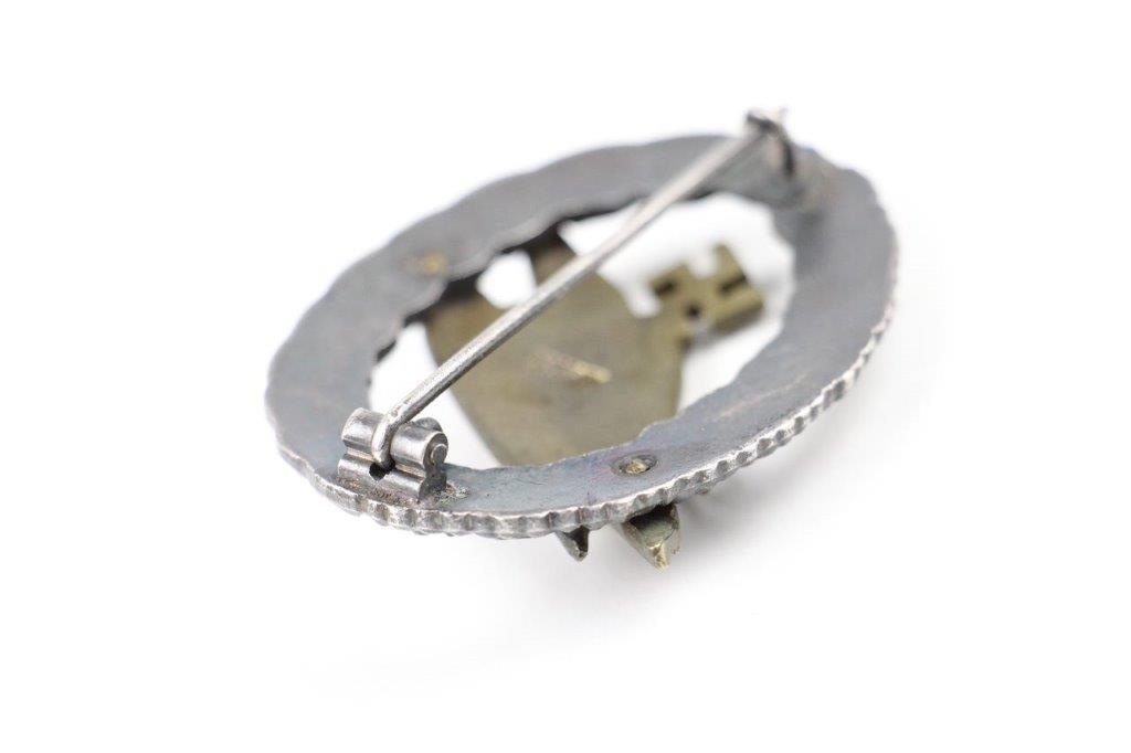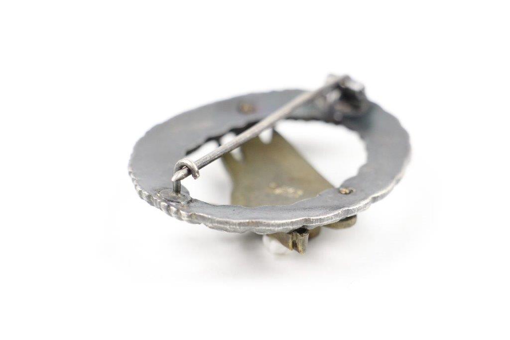 3/25/24 – This is an original, WW2 wartime production German Paratrooper (Fallschirmjager) badge. The medal is two piece construction, made from wartime zinc material. The badge shows natural dark surface patina and mild aging throughout. This is mostly high edge wear and both the wreath and eagle still retain a fair amount of original finish. The reverse of the eagle is maker marked “G.H. OSANG”. No other markings or stamps. Original closure clasp intact and functional.