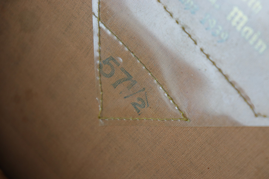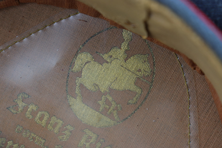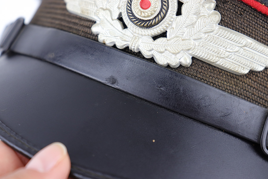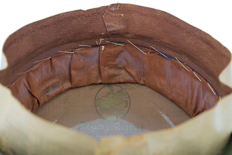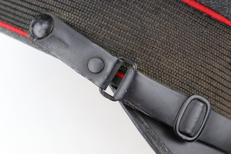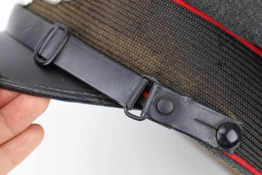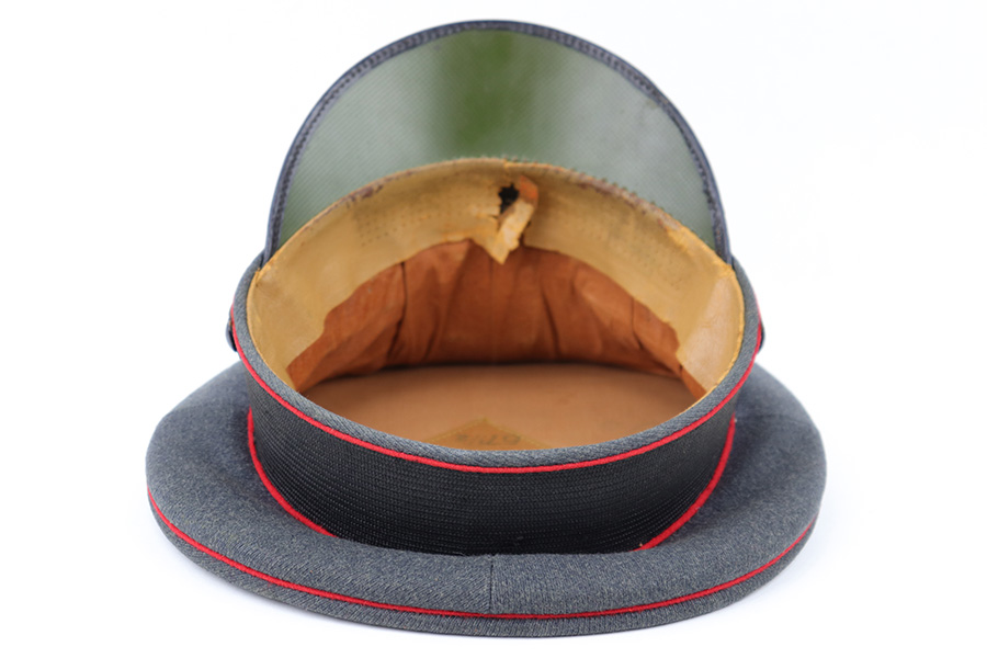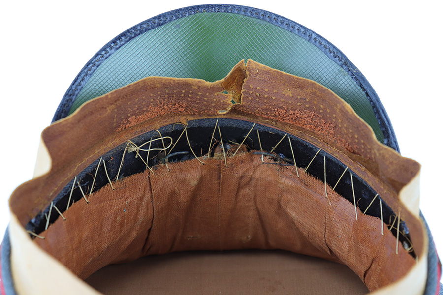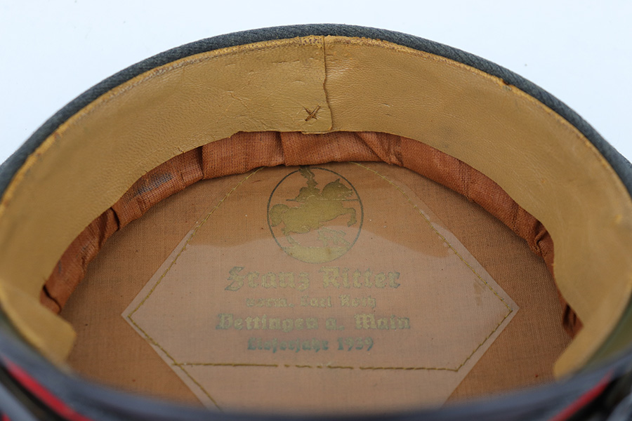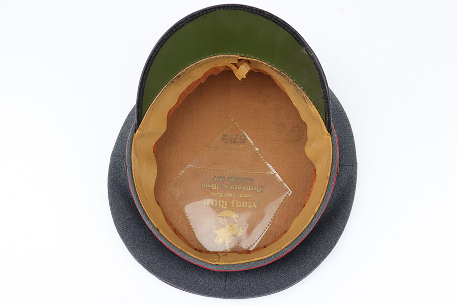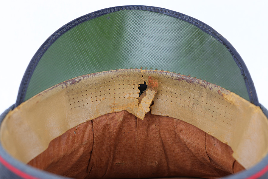 6/15/23 – This is an original WW2 Luftwaffe Flak Artillery Visor Cap. The cap has an excellent exterior with minty condition blue-gray exterior wool with clean red piping. The exterior black visor band is tight and excellent overall, but there is some mild surface discoloration around the front. The attached aluminum cockade and Luftwaffe eagle are in great condition with excellent detail. The leather chin strap and visor have a dull lacquered finish, likely from a previous owner trying to clean or buff the exterior, but this is a minor takeaway. The visor interior has a nice diamond pattern and dark green color. The interior leather headband has a small rip / hole in the front as shown, but otherwise is in good condition. The interior crown is in great shape, with some mild surface stains. The celluloid cover is intact and maker marking is easily visible. Size marked 57.5, which is a desirable larger size.