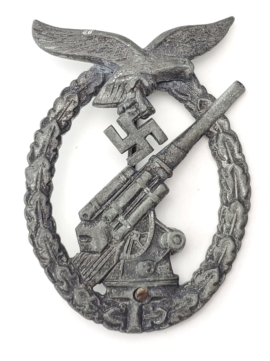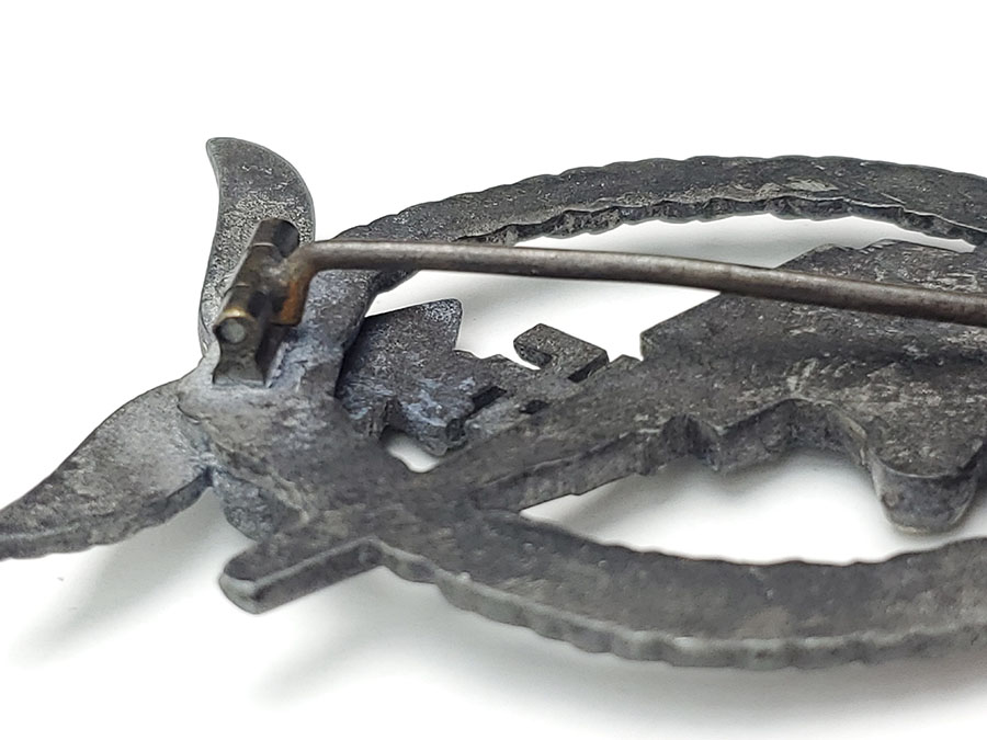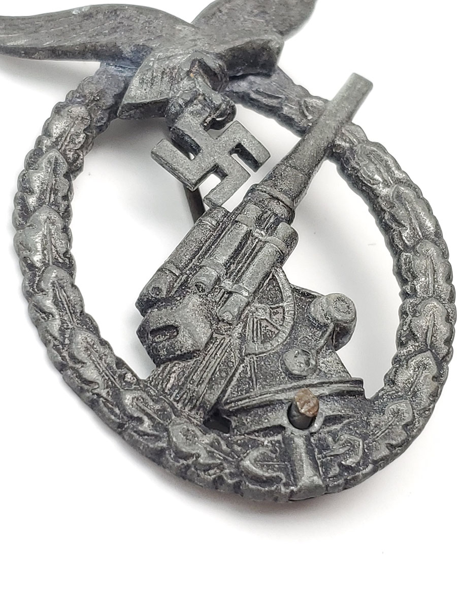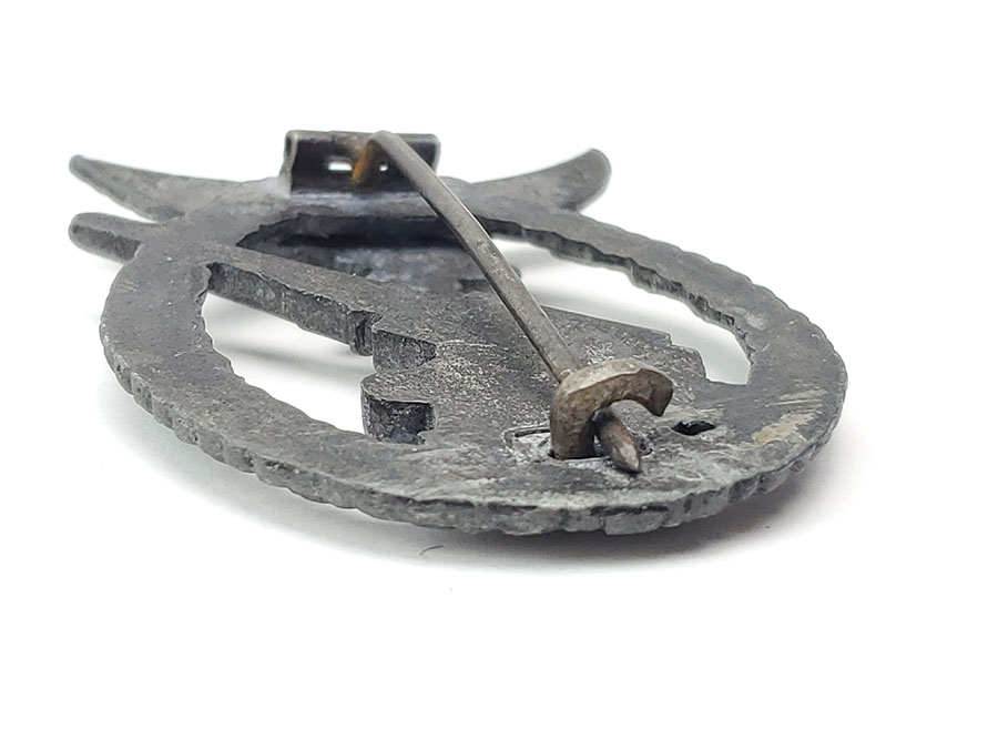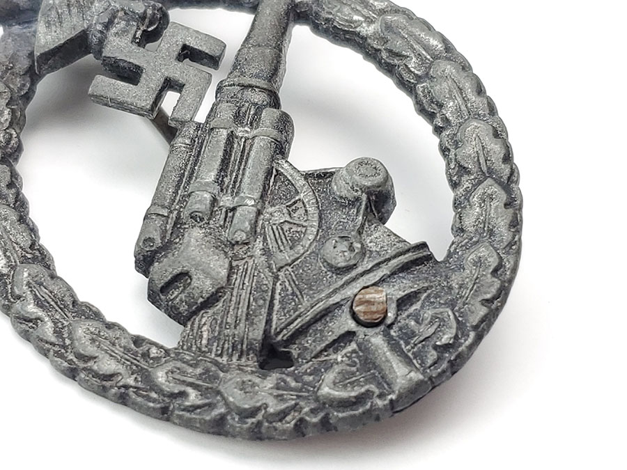 9/1/20 – This is a later wartime example of a Luftwaffe Flak Gunner Badge. The badge is zinc construction with a magnetic clasp. The hook can be seen from the front, and rotates to release the pin. There is some light patina throughout, but overall in good condition.