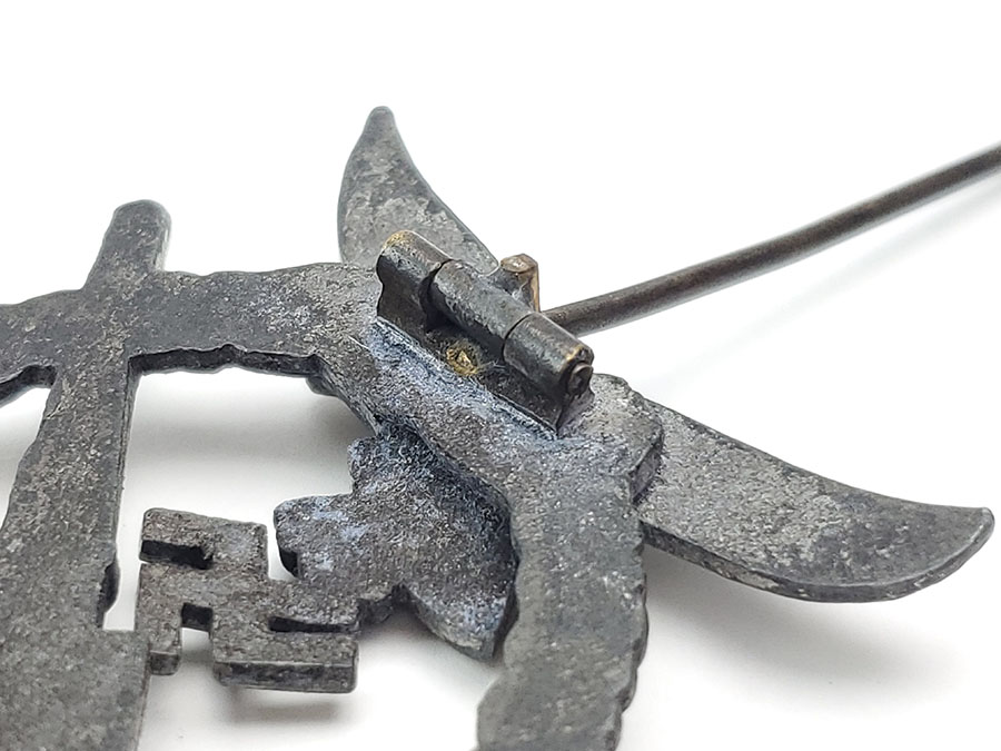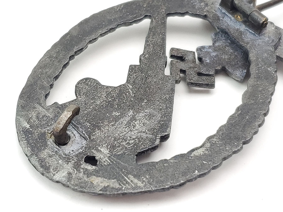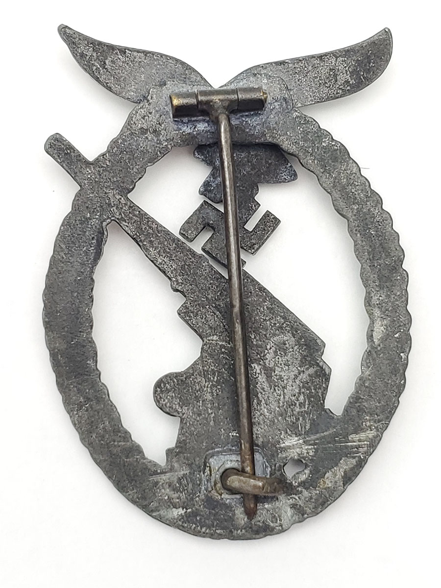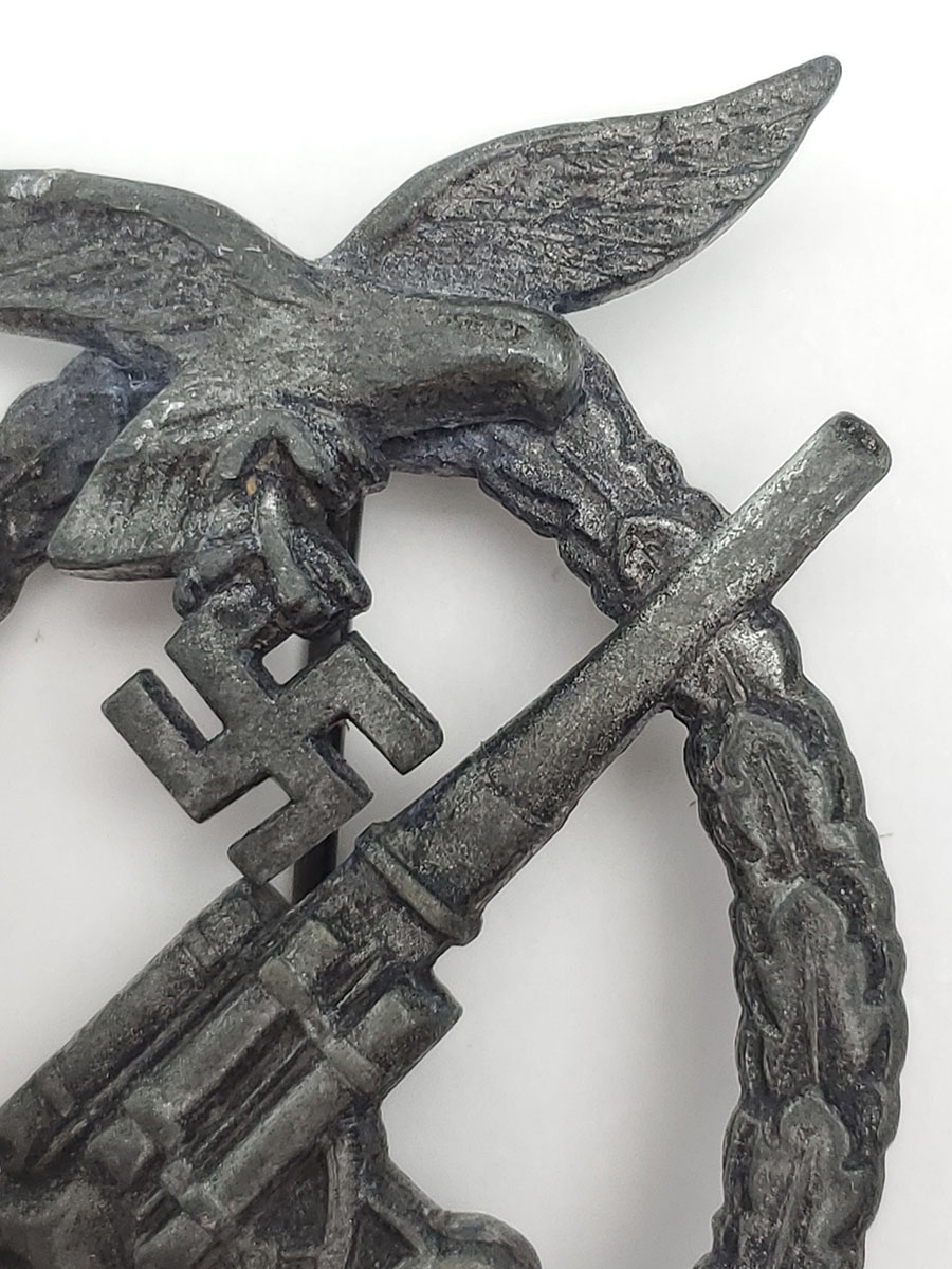 9/1/20 – This is a later wartime example of a Luftwaffe Flak Gunner Badge. The badge is zinc construction with a magnetic clasp. The hook can be seen from the front, and rotates to release the pin. There is some light patina throughout, but overall in good condition.