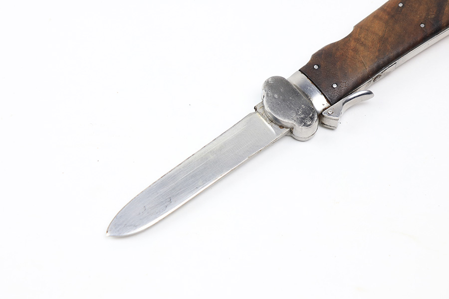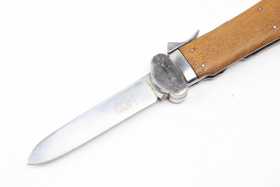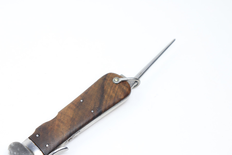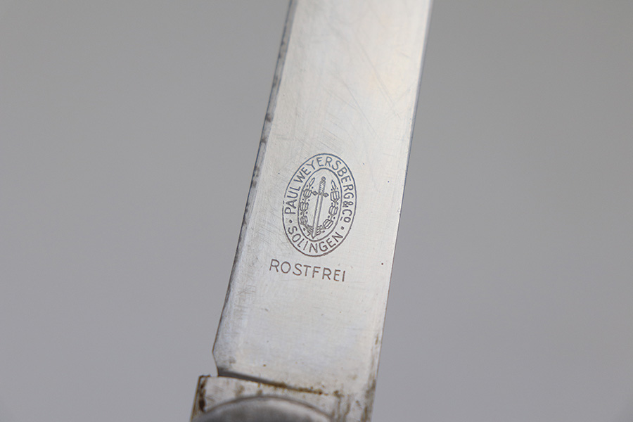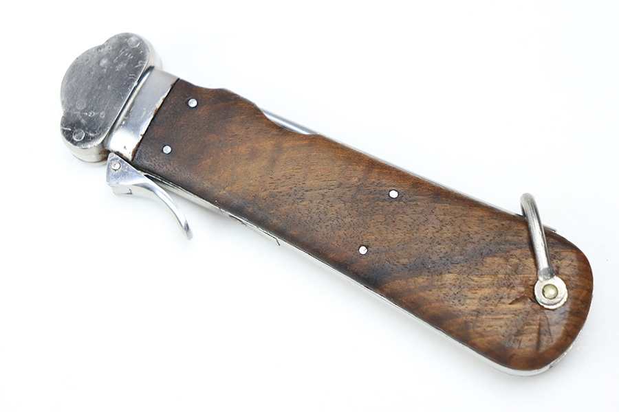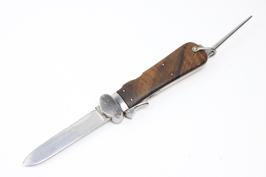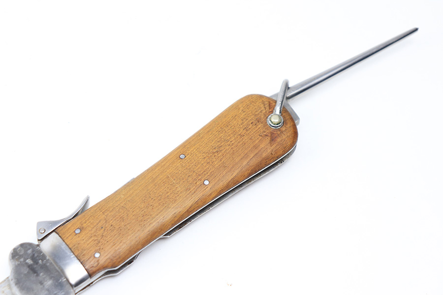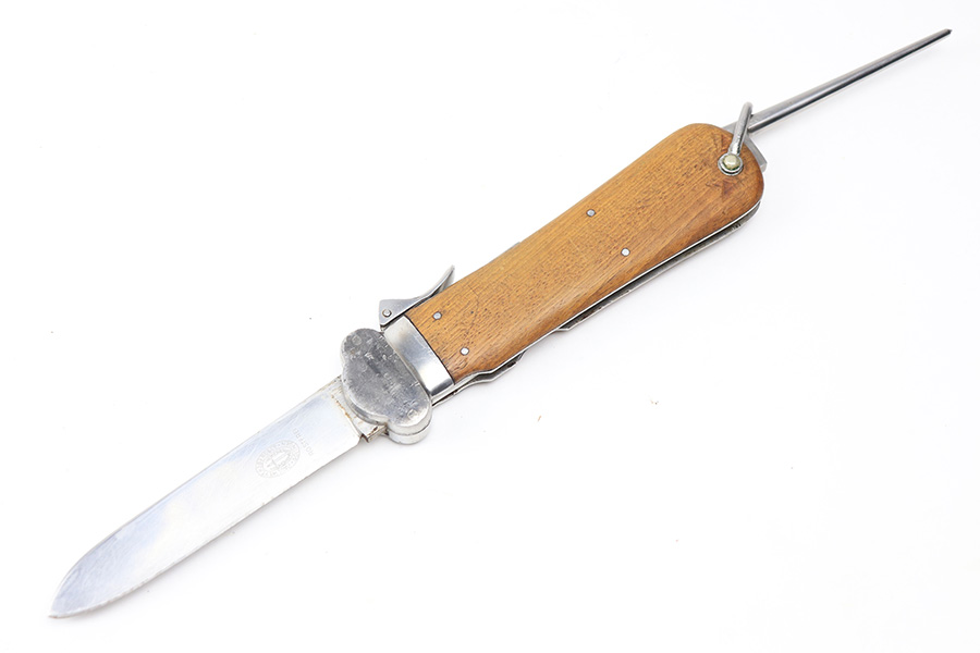 1/5/22 – This is an original Luftwaffe Gravity knife. The knife is maker stamped by Rostfrei on the blade. The blade is generally in great condition with some light signs of sharpening along the edge as well as surface scratches from previous use. The blade falls out and returns without issue, but when “closed”, the blade does still stick out very slightly (only the tip). This is likely related to the damage on the right side of the knife, just under the release lever. The knife is still functional however. The helmet pick is Luftwaffe stamped at the base with an eagle/5. There is some mild cosmetic wear but no major rust or pitting.