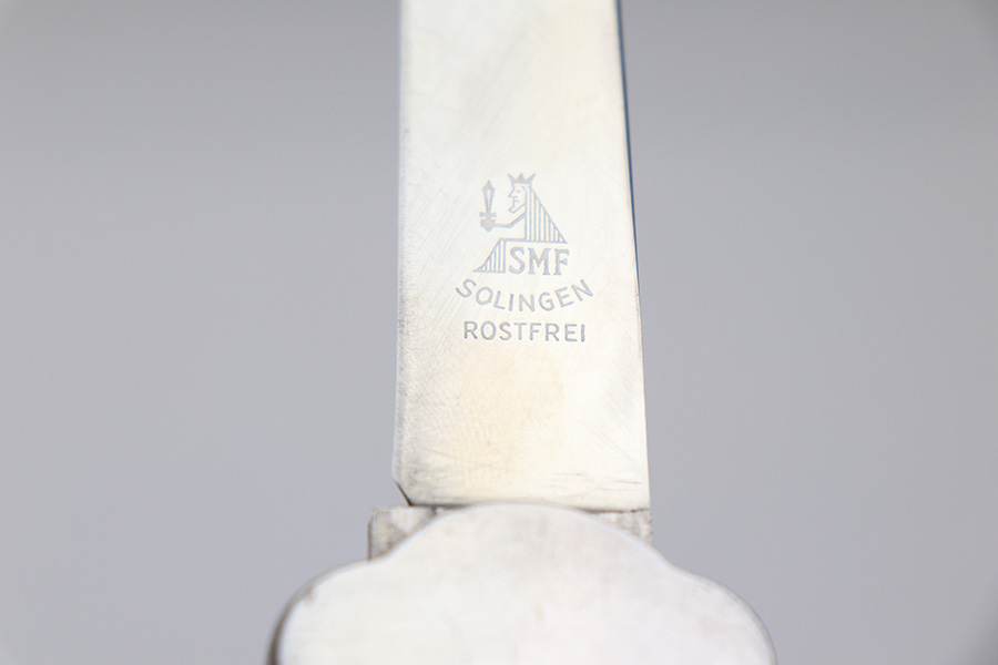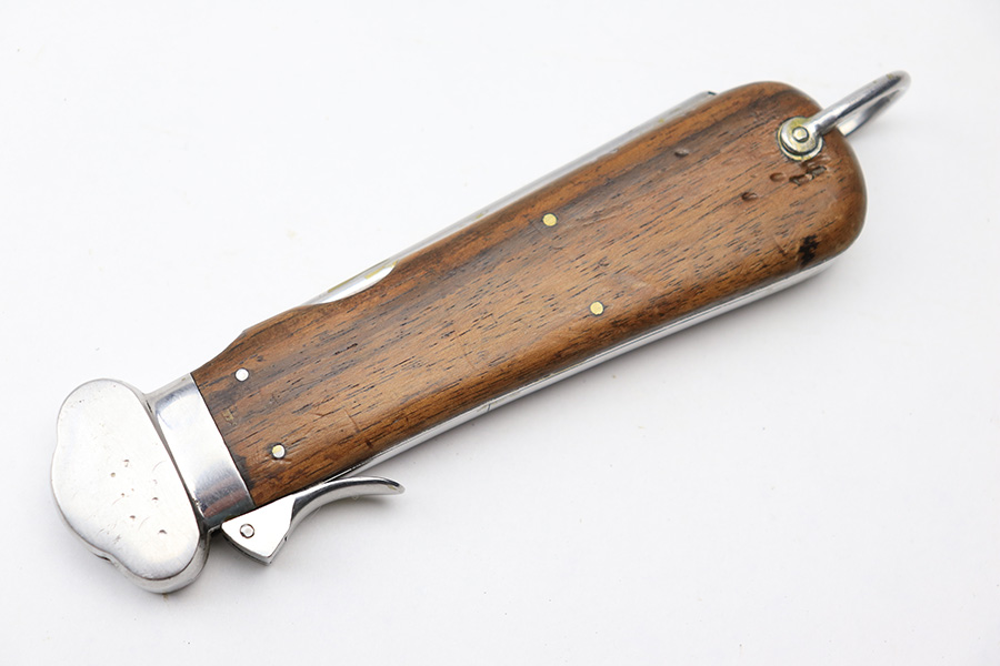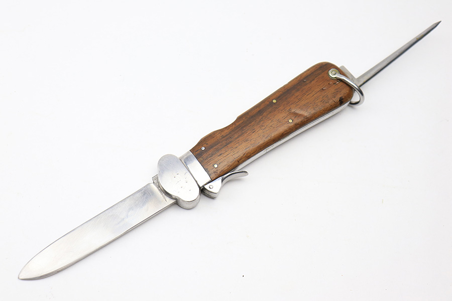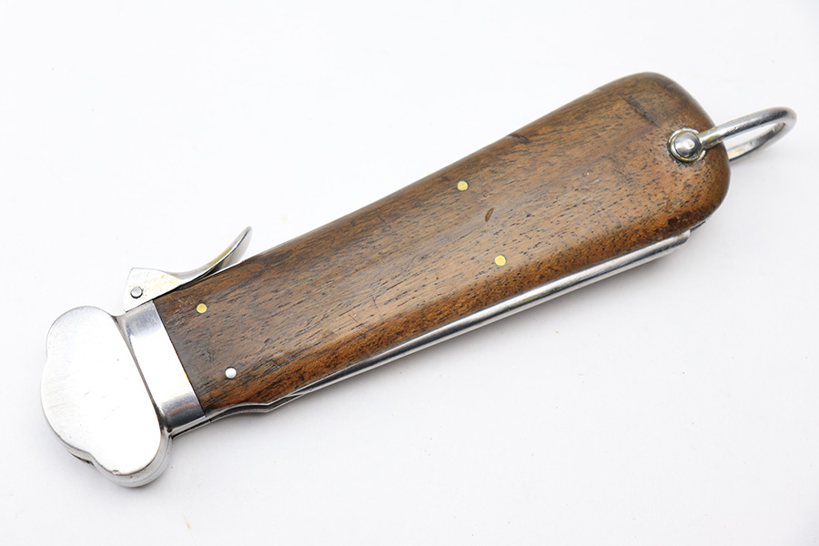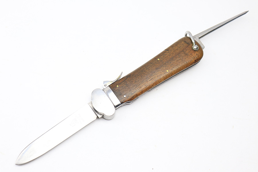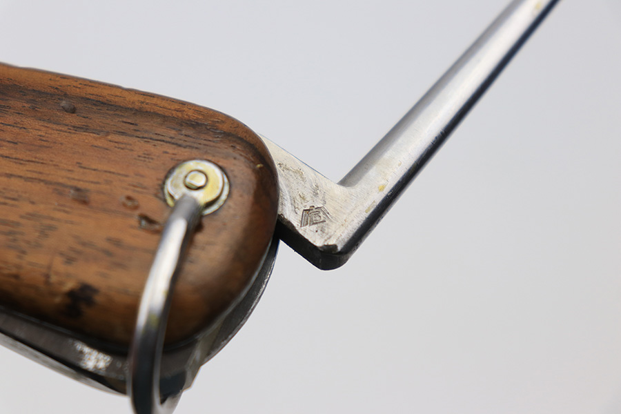 3/16/22 – This is an original Luftwaffe Gravity Knife from WW2. The blade is maker stamped by SMF and in great condition. The blade shows mild signs of sharpening and some light surface scratches throughout. The mechanism functions properly, with the blade locking in both positions without issue. The wood handle has no cracks or chips, but there are a few minor indents in the wood near the lanyard loop. There also is a light layer of preservative coating on the wood. The lever is matching numbered “15” on the small parts. The base of the pick piece is Luftwaffe proof stamped.