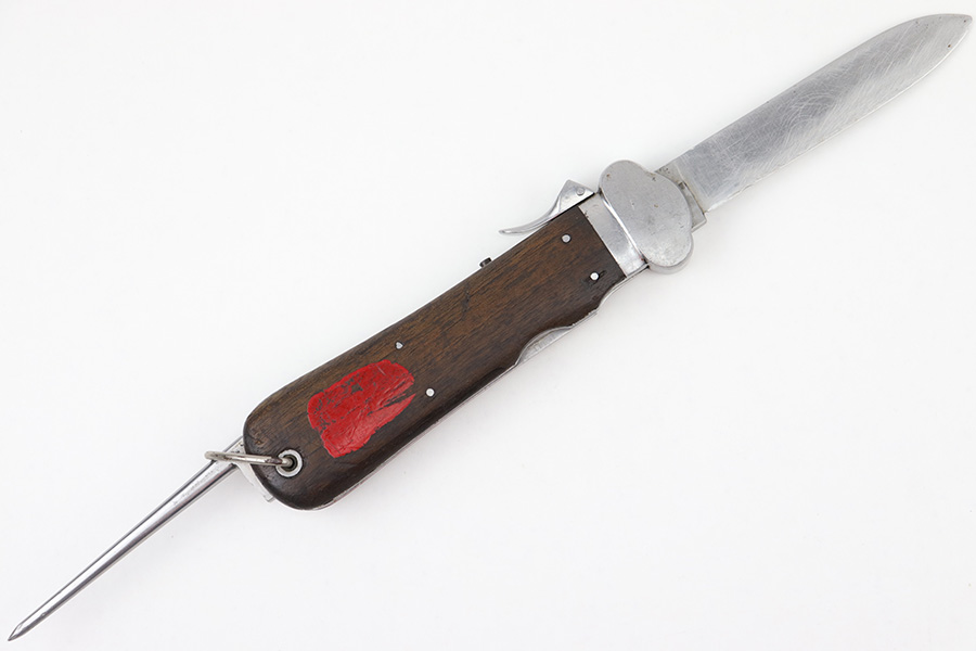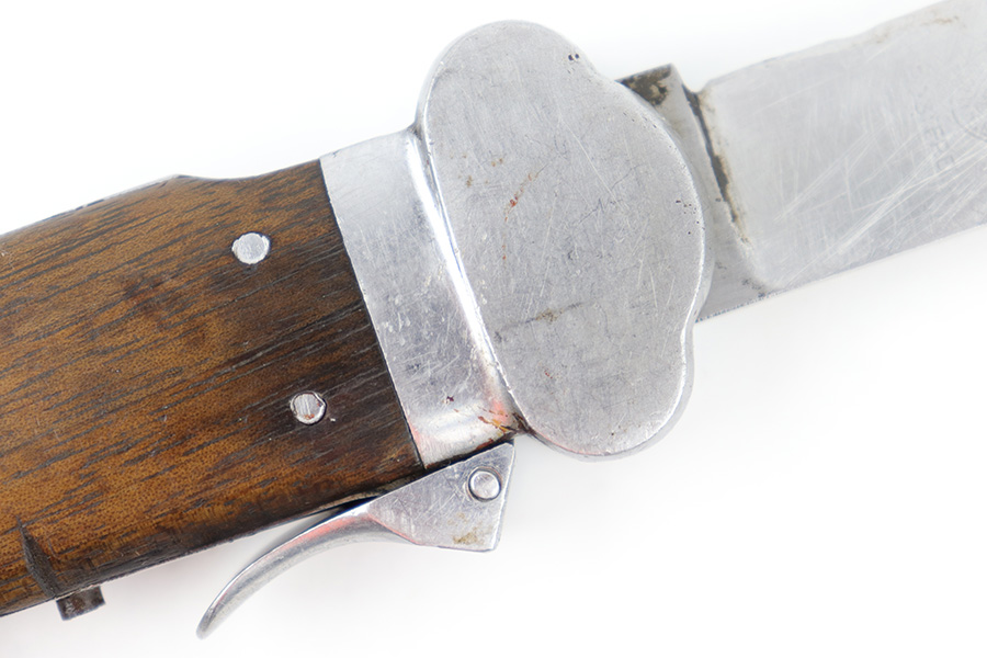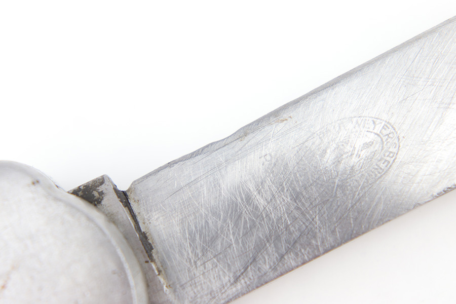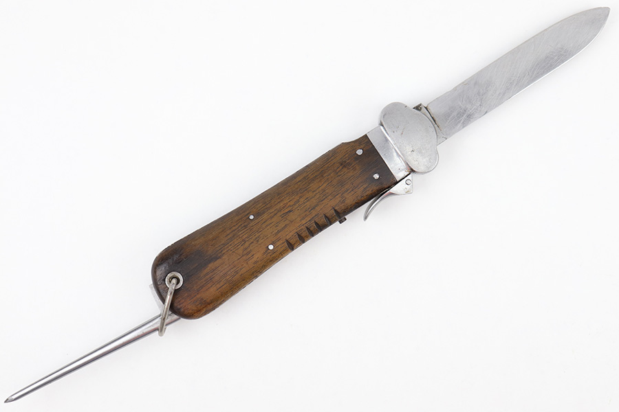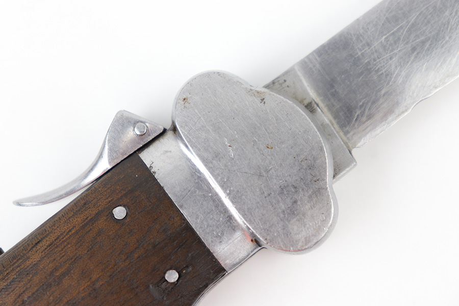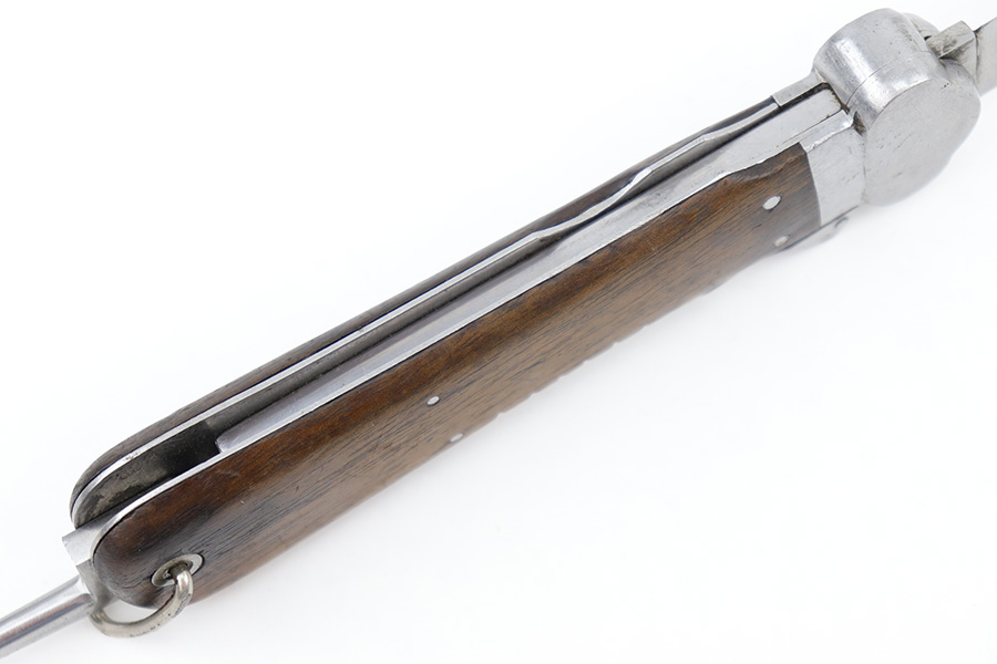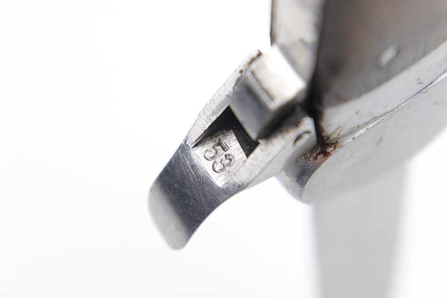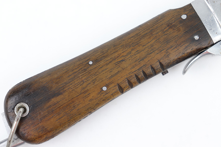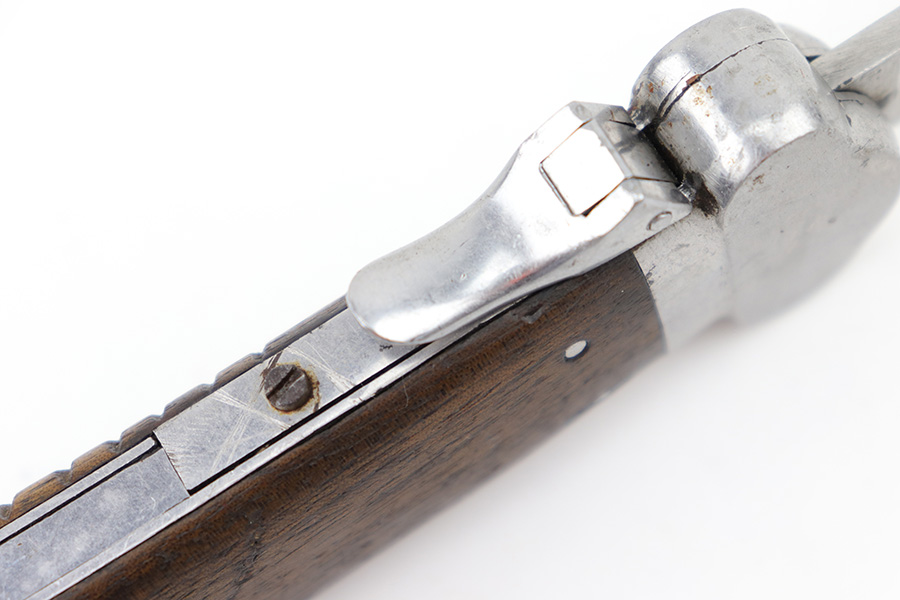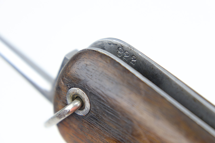 6/20/23 – This is an original WW2 Luftwaffe Gravity Knife by Paul Weyersberg. The knife is functional with smooth action and tight lockup. The blade shows signs of sharpening and honest use wear which is mostly light surface scratches. The maker stamp is faint and faded, yet still visible. The metal mouth of the blade and frame / release lever all shows mild surface patina and light scratches but no major issues. The release lever is matching numbered “53” on the lever and base, with the base having an added screw which appears to be a period ‘field repair’. The wood handle has 6 notches intentionally added to one side. The wood shows signs of handling throughout but no cracks or chips. The spike piece is Luftwaffe proof stamped, and the interior base of the handle / spike housing is numbered 822. A nice example with honest use wear (likely saw action).