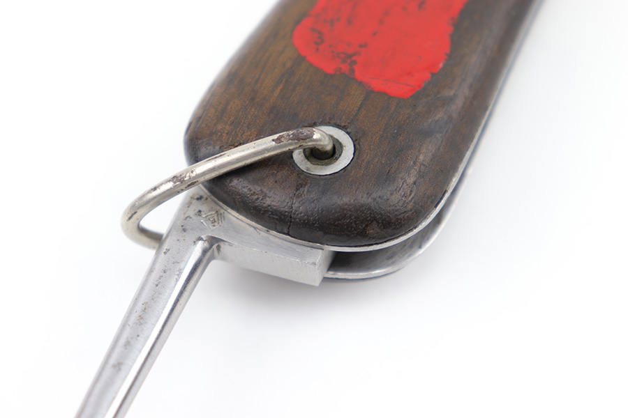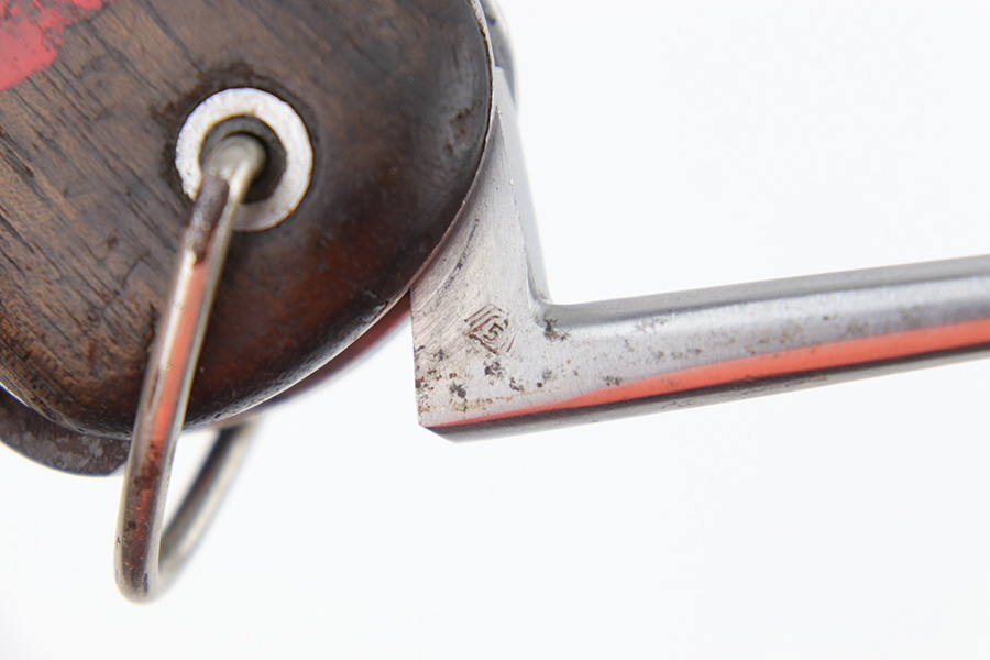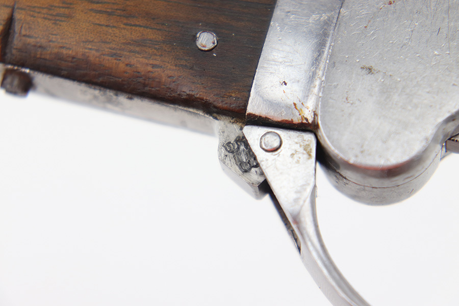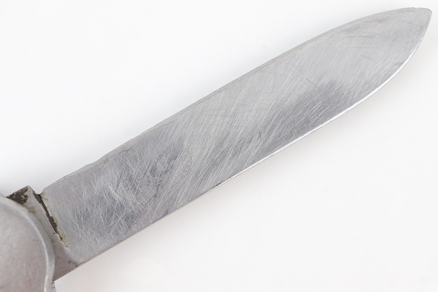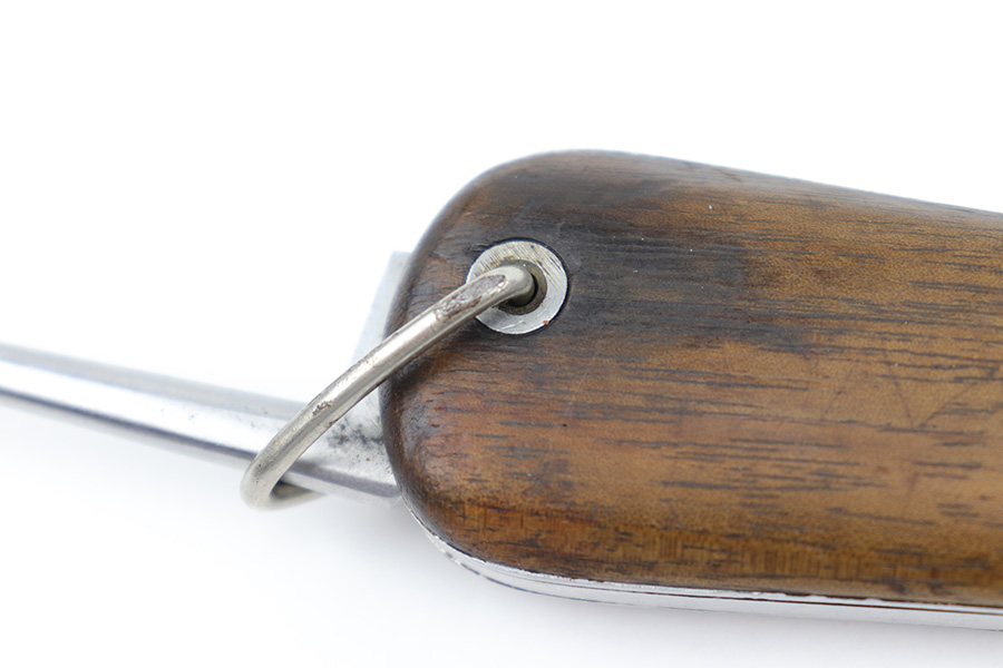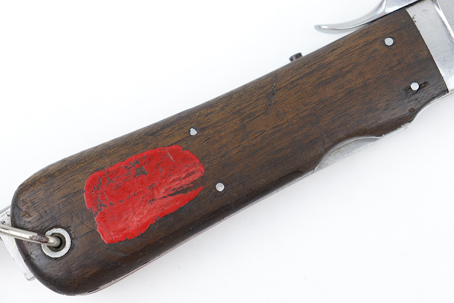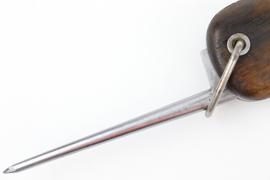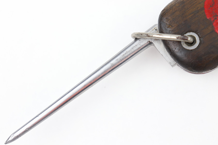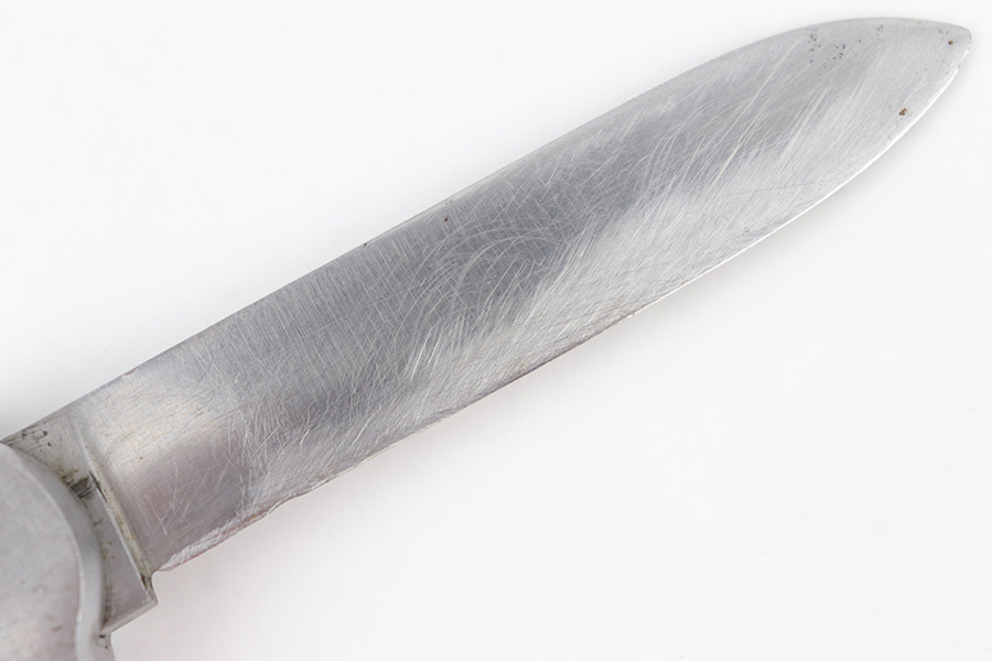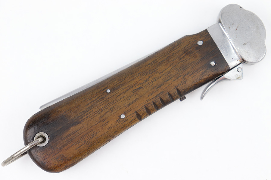 6/20/23 – This is an original WW2 Luftwaffe Gravity Knife by Paul Weyersberg. The knife is functional with smooth action and tight lockup. The blade shows signs of sharpening and honest use wear which is mostly light surface scratches. The maker stamp is faint and faded, yet still visible. The metal mouth of the blade and frame / release lever all shows mild surface patina and light scratches but no major issues. The release lever is matching numbered “53” on the lever and base, with the base having an added screw which appears to be a period ‘field repair’. The wood handle has 6 notches intentionally added to one side. The wood shows signs of handling throughout but no cracks or chips. The spike piece is Luftwaffe proof stamped, and the interior base of the handle / spike housing is numbered 822. A nice example with honest use wear (likely saw action).