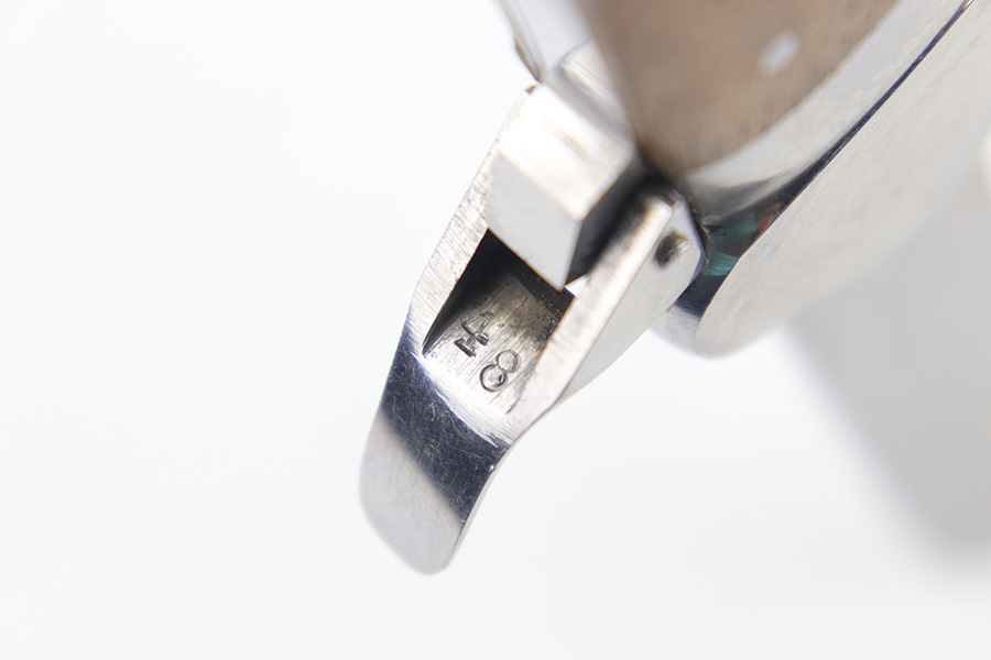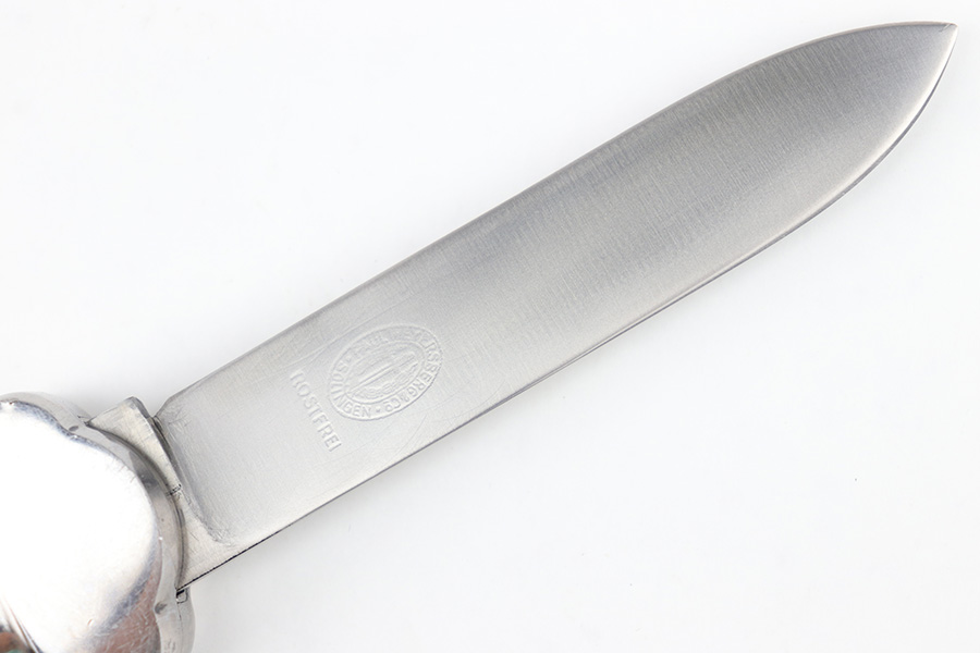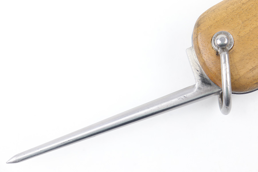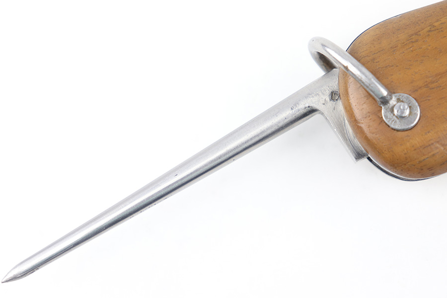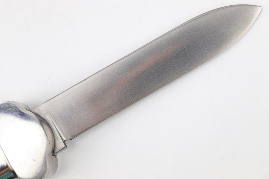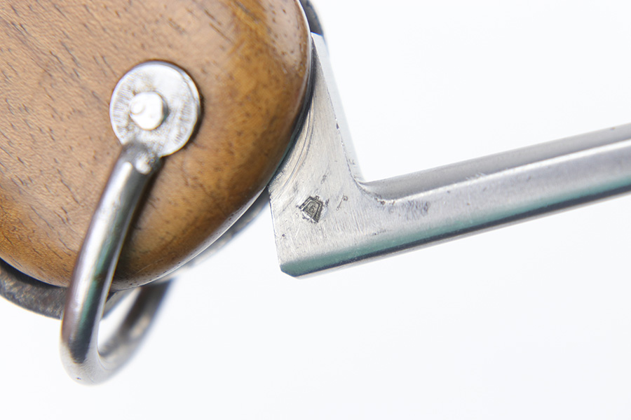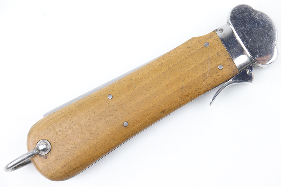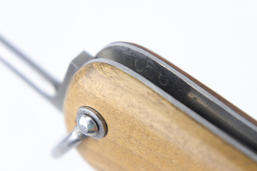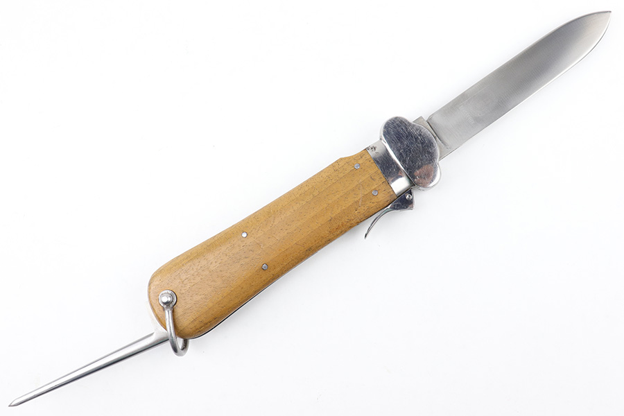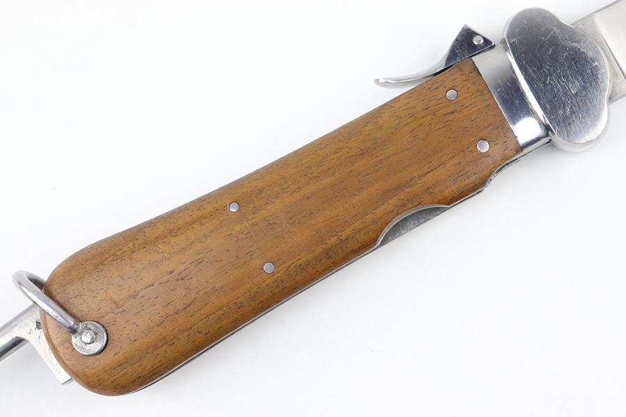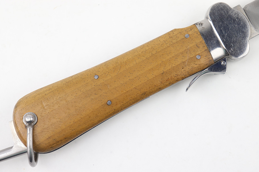 7/14/23 – This is an excellent example of an original WW2 Luftwaffe Gravity Knife. The knife features a clean blade, light brown wood handle, smooth action / functionality, and a matching numbered release handle and side bar. The interior handle / metal frame of the blade is mismatching however (this is very common, and still considered correct). The fold-out spike is Luftwaffe proof stamped on the base. The blade is very clean with visible cross-graining throughout and only some very light surface scratches and evidence of light buffing / cleaning. The handle has no cracks or chips. The metal frame and mouth of the handle has some light surface patina and a few spots of speckling discoloration, but is in overall excellent condition.
