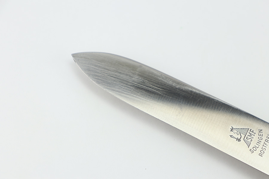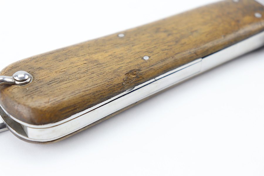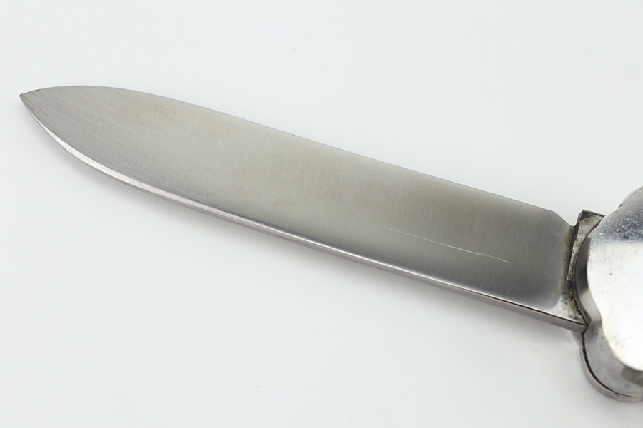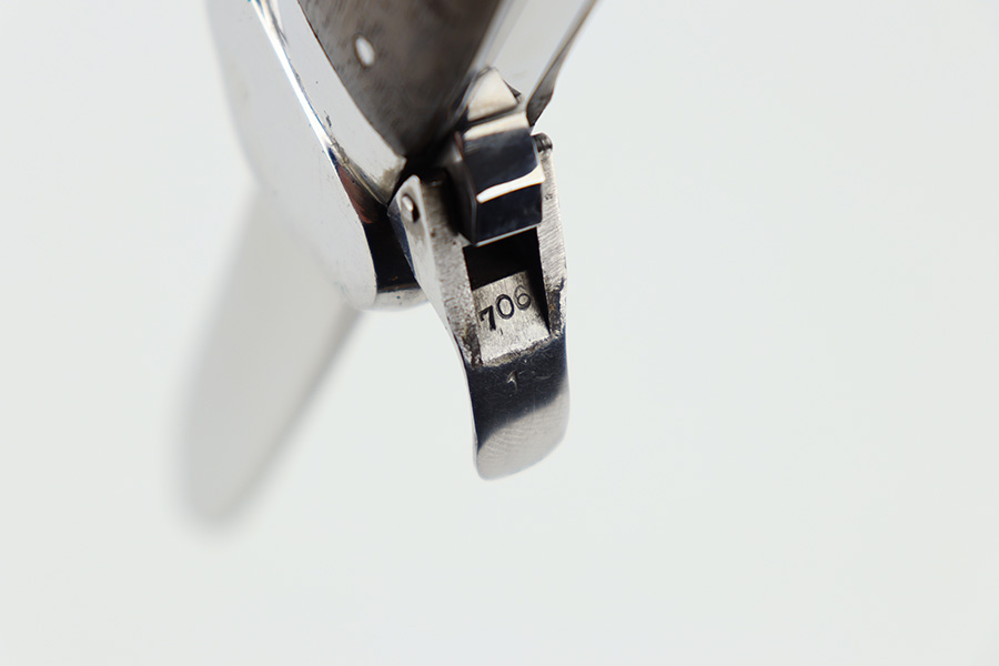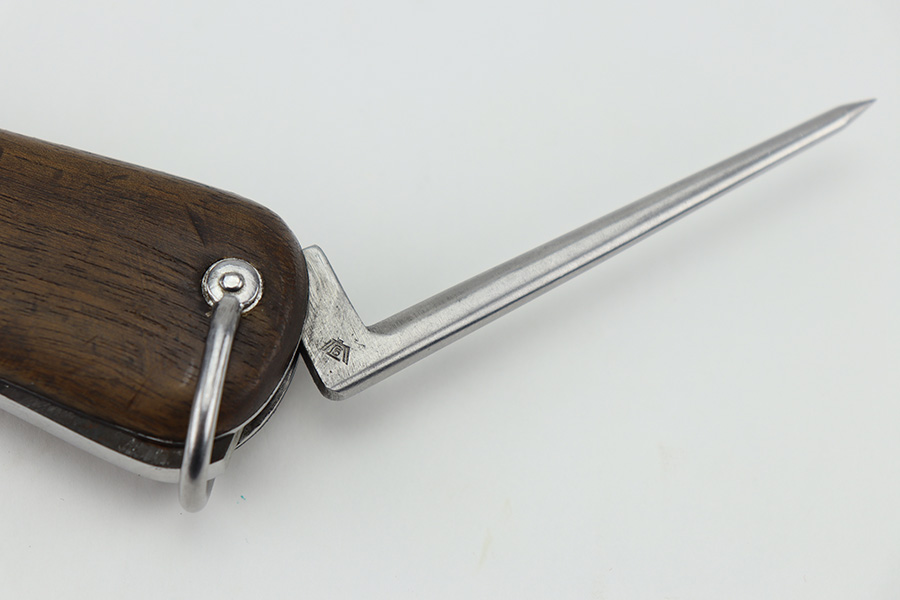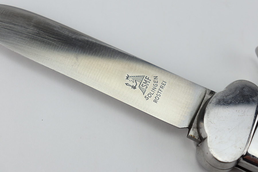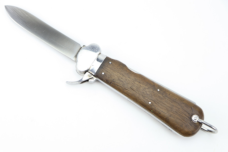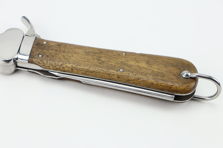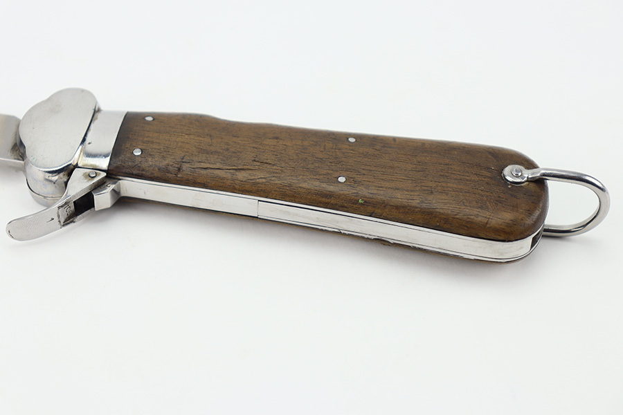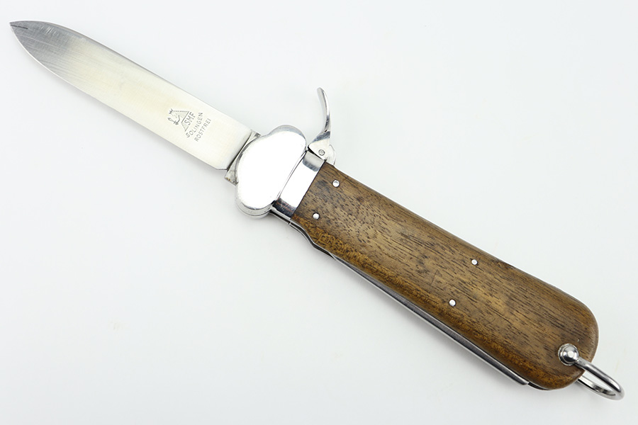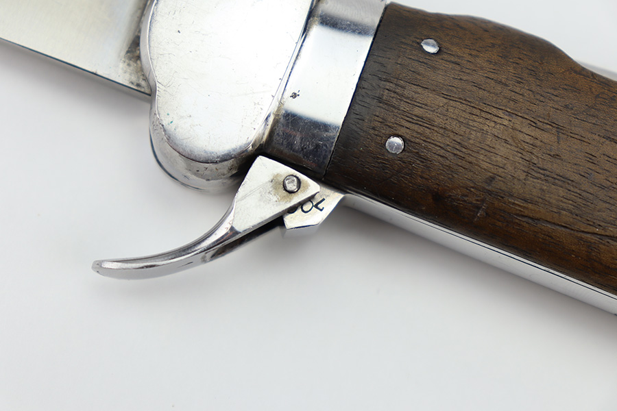11/17/23 – This is an original WW2 Luftwaffe Gravity Knife. This example is in excellent overall condition with a clean blade that shows cross-graining throughout, and a crisp maker marking by SMF. There’s some light surface scratches on the blade, mostly near the tip. Little to no discoloration. Smooth action and functional release lever. The release lever and side bar are matching numbered 706. The wood handle has a small dent / chip on one side, but is excellent otherwise. The fold-out pick piece is clean and waffen proof stamped at the base.