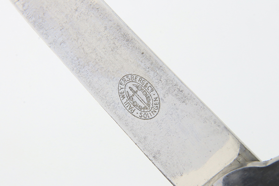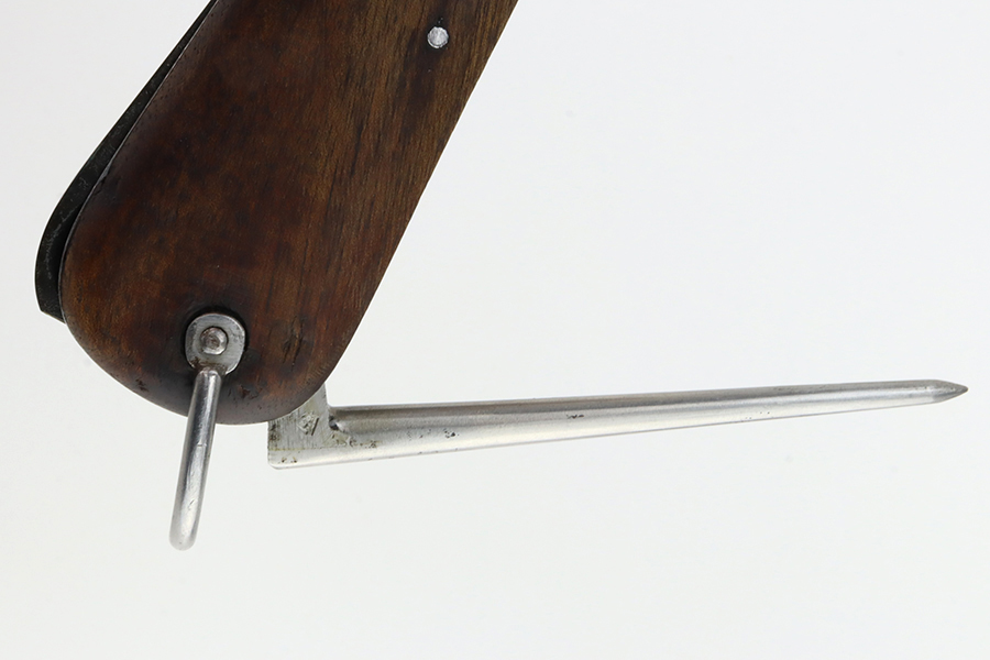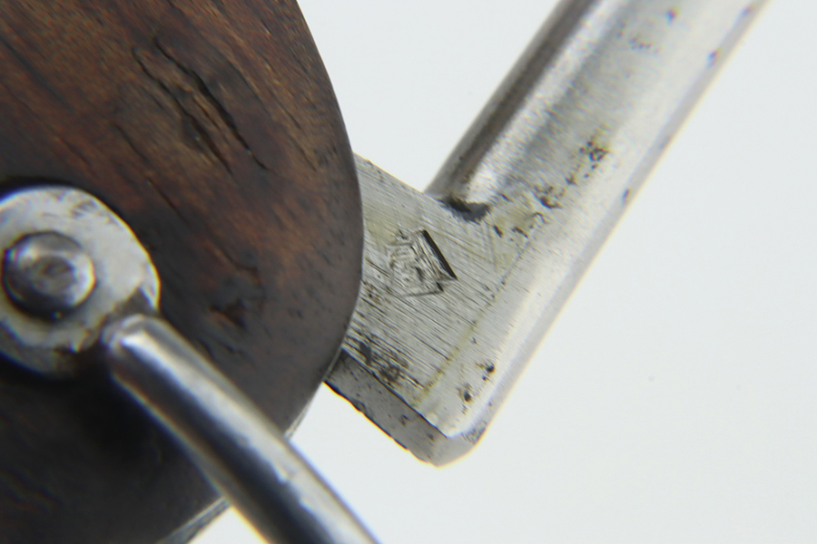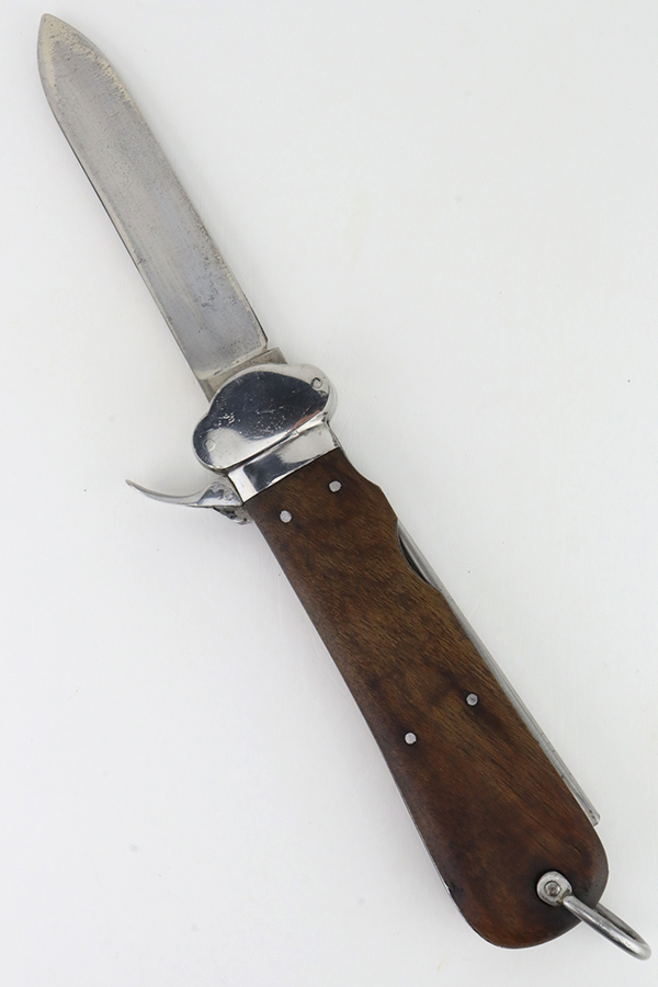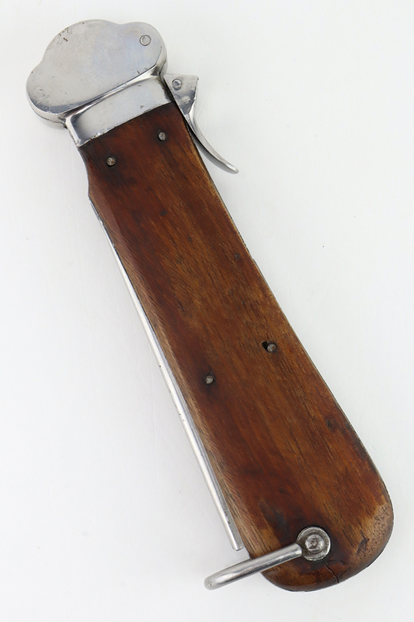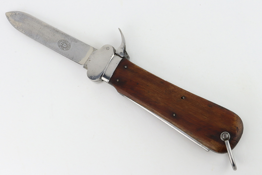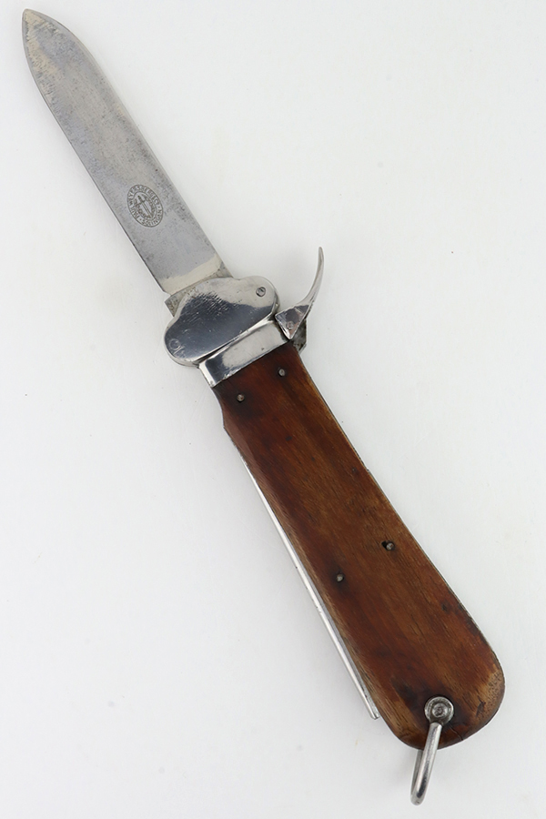 1/12/24 – This is an original WW2 Luftwaffe Gravity Knife by Paul Weyersberg. This example is in excellent overall condition with a clean blade. The action works well, but the blade does stick just a little bit coming out. Excellent wood grips. The pick piece is smooth functioning and Luftwaffe proof stamped on the base.