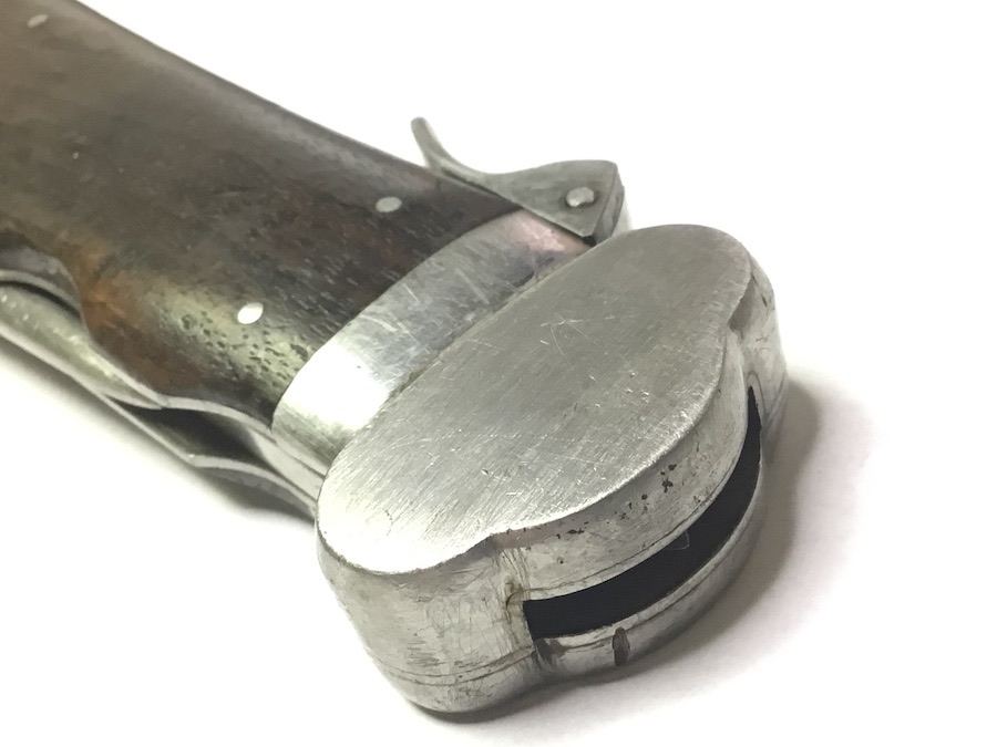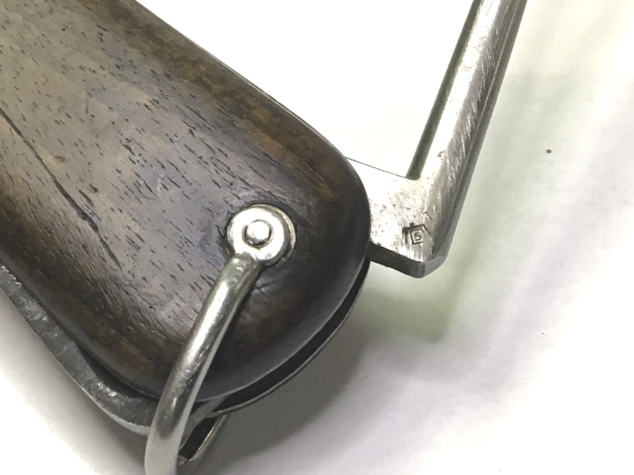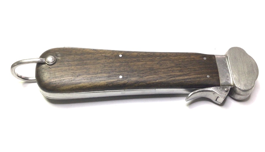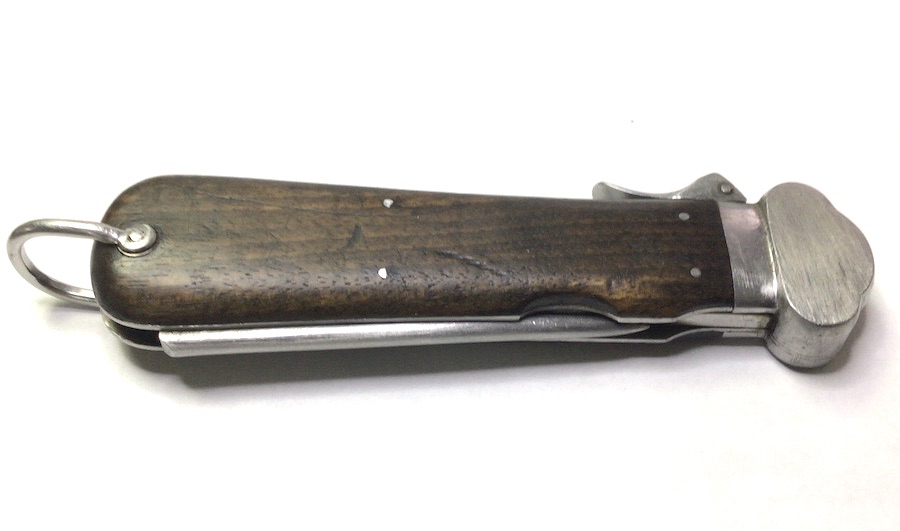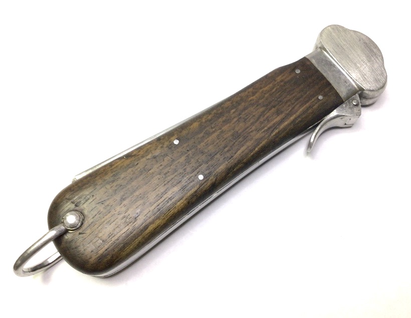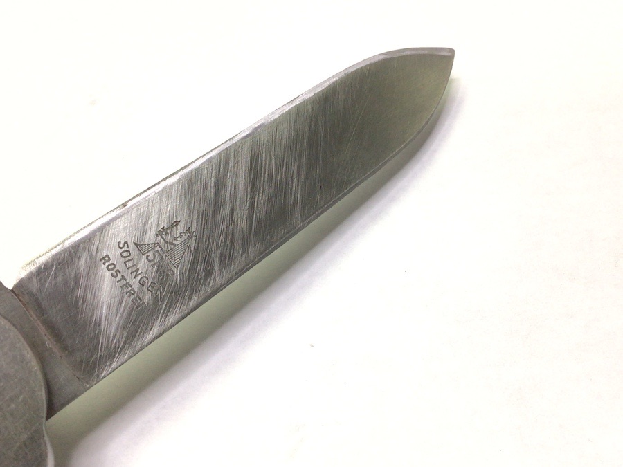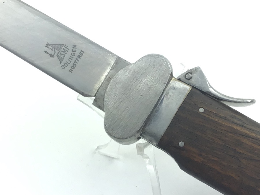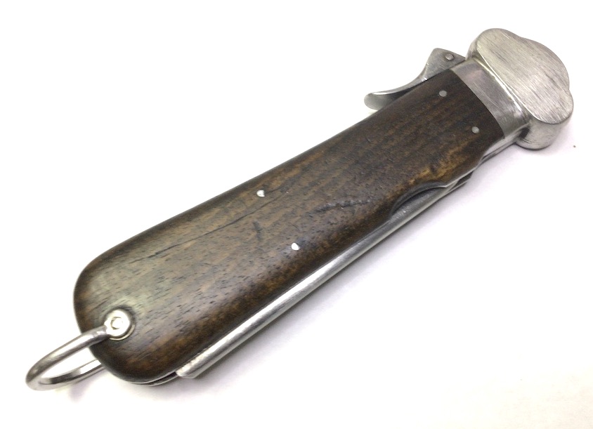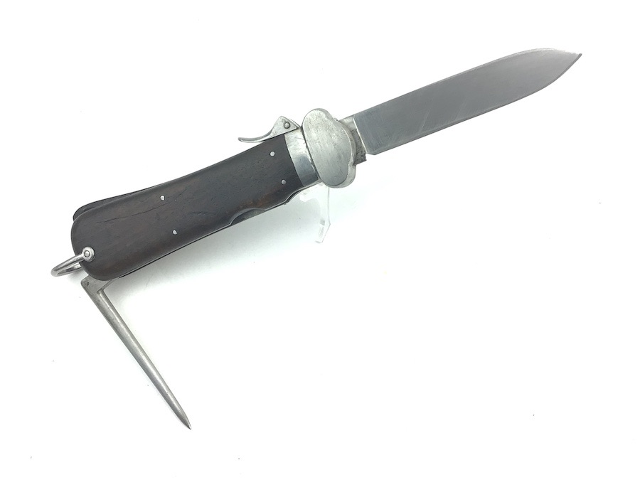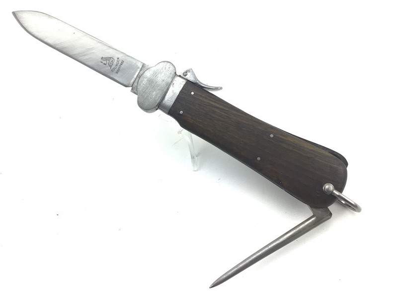 9/24/24 – Original and great condition. WW2 Luftwaffe Gravity Knife by Solingen Rostfrei. Stamped with a Luftwaffe eagle/5 proof stamp on the pick extension. It has a very nice looking aged appearance that can only be seen in a wartime used piece. The drop blade is etched with the “Solingen Rostfrei” logo. Overall the blade is very clean that shows some minor sharpening. The wood grips are in great condition showing only minor wear. Opens and closes as it should and locks open and closed.