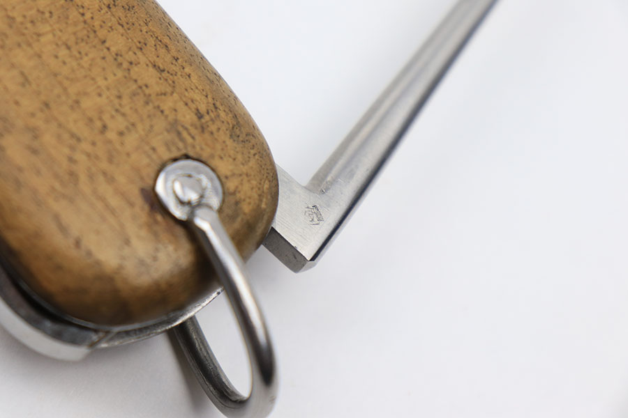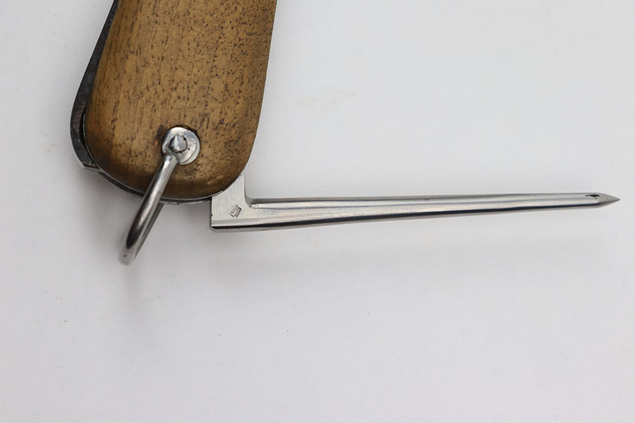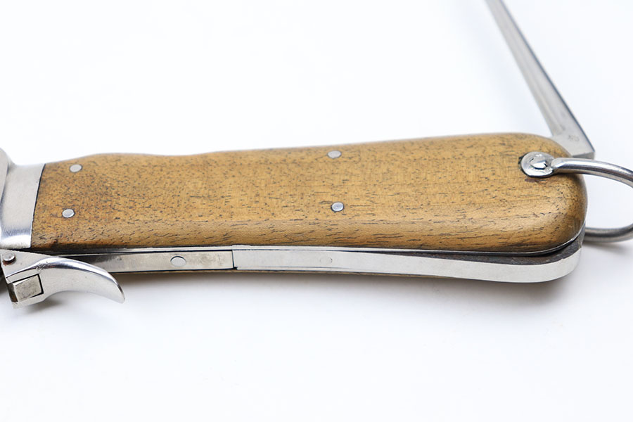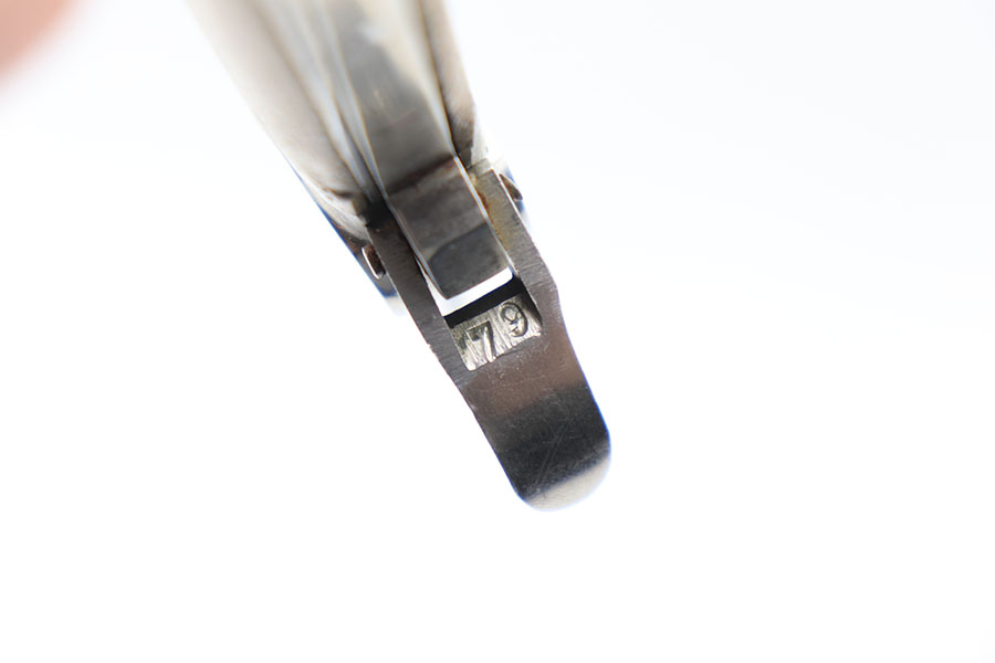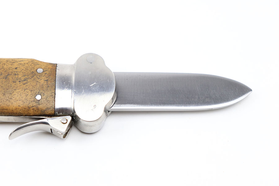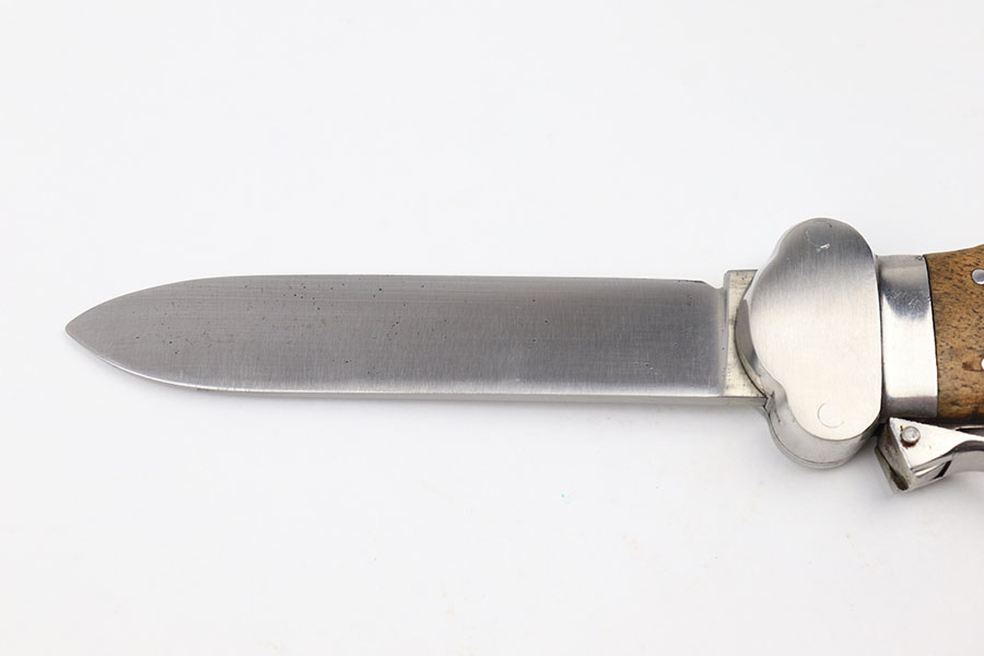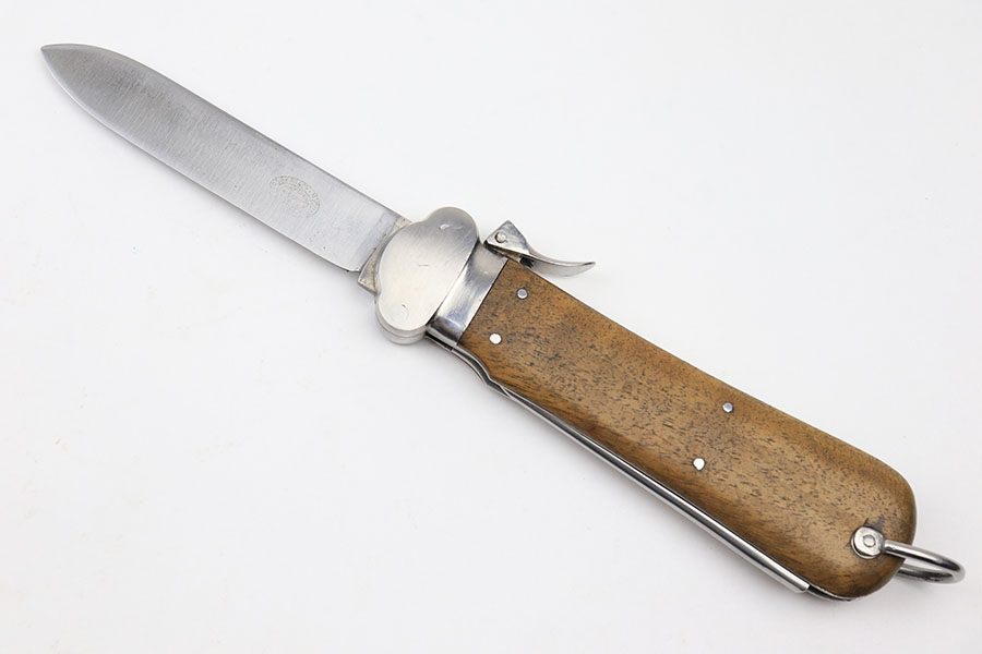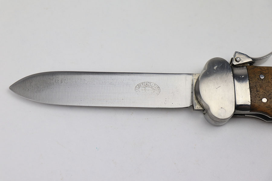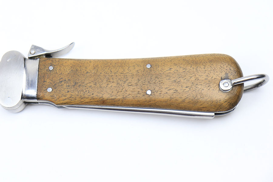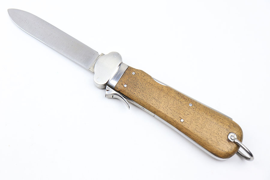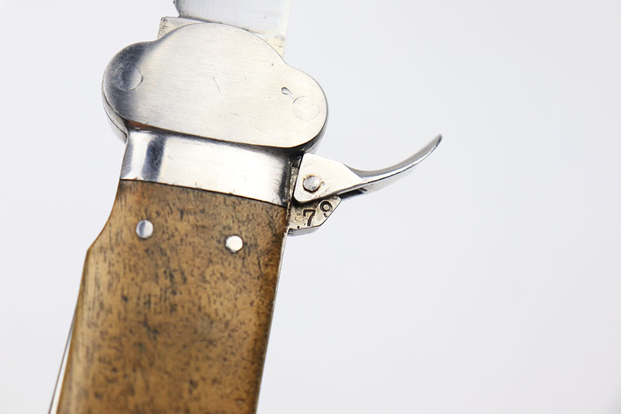 5/6/21 – This is an original WW2 production Luftwaffe Gravity Knife. The blade is in excellent condition with no signs of sharpening and is maker marked by Paul Weyersberg & Co. The maker marking is a little faint but still visible. The wood handle has no cracks or chips. There’s a luftwaffe eagle/5 proof stamp on the base of the spike. The handle and side bar are both matching numbered 76. The only takeaway from this piece is the blade falls out slightly even when in the locked position. See the last photo for just how much it comes out on its’ own. When fully extended, the blade does stay out and locked properly however.
