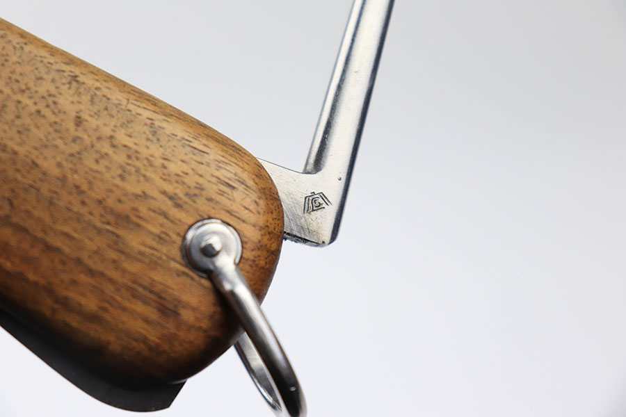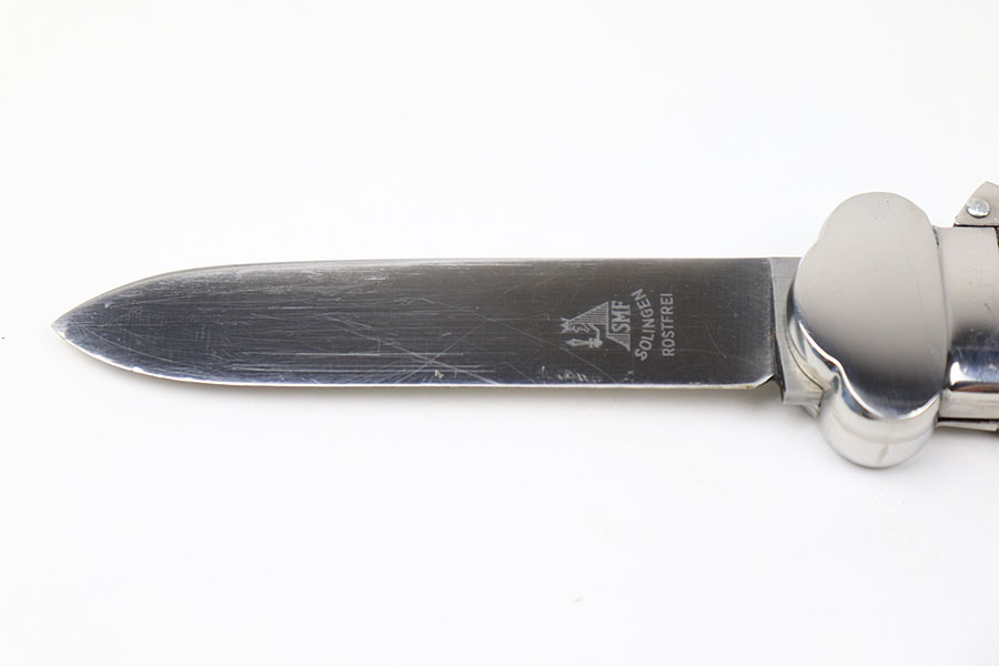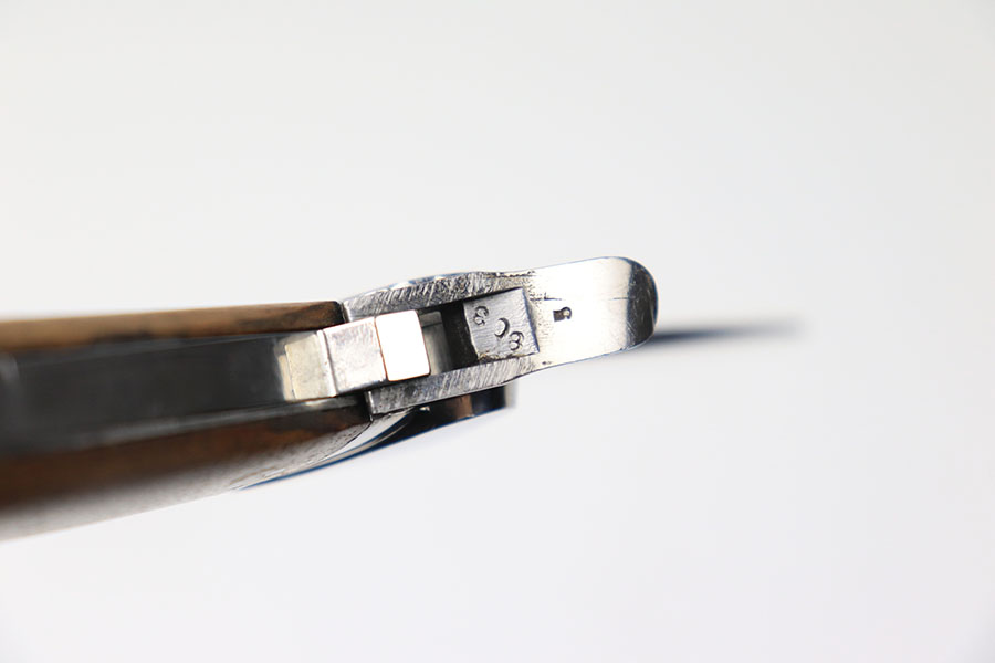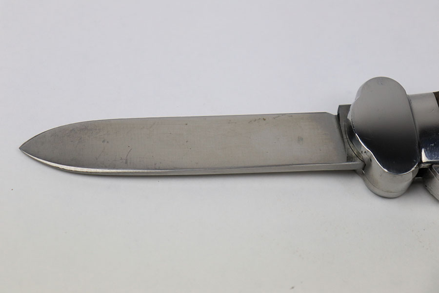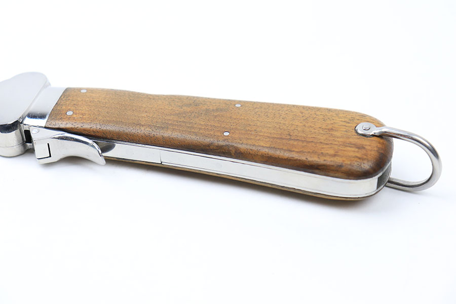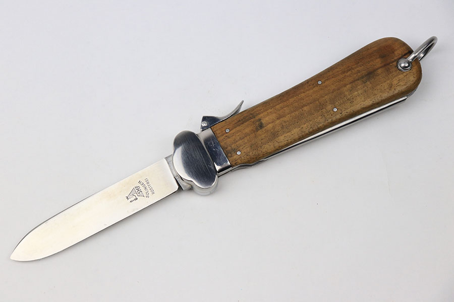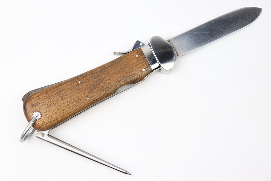 6/24/21 – This is an original Luftwaffe Gravity knife from WW2. The blade is in excellent condition with a Rostfrei maker marking on one side. The release lever functions without issue. The wood handle has no cracks or chips. The spike is Luftwaffe proof stamped on the base. A very nice example. The price is reduced due to the spring lever pivot not being numbered, and the rivet on the release lever is replaced. This is likely a post-war repaired knife.