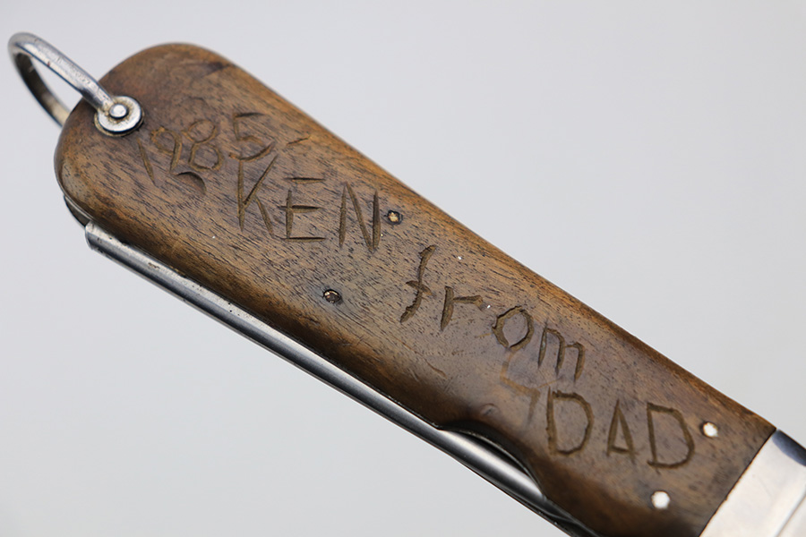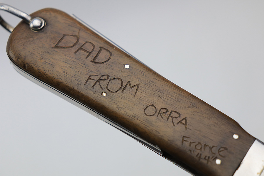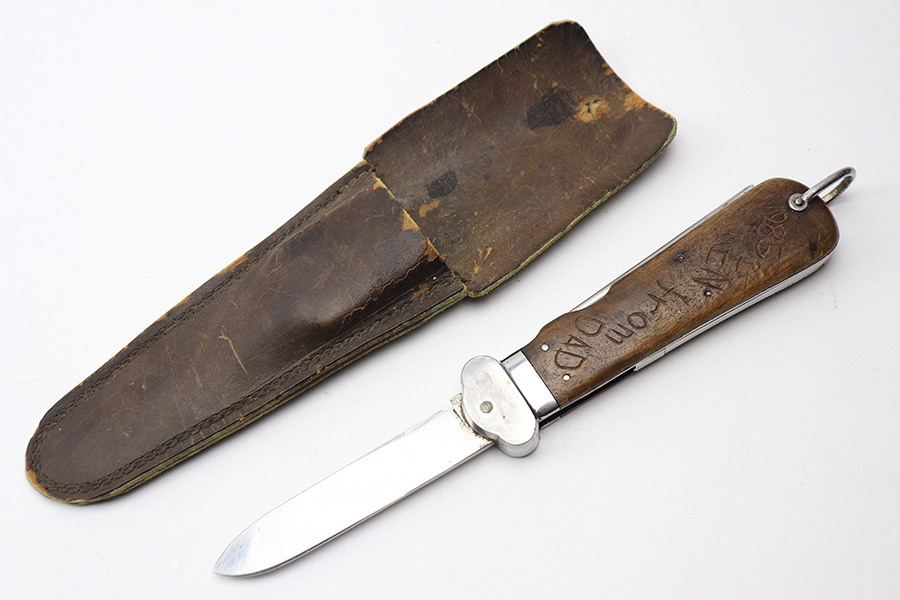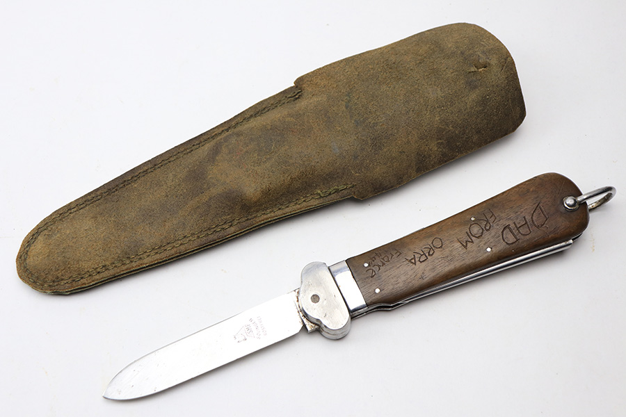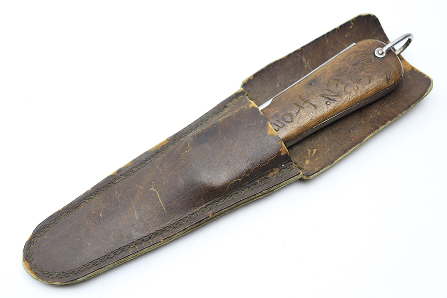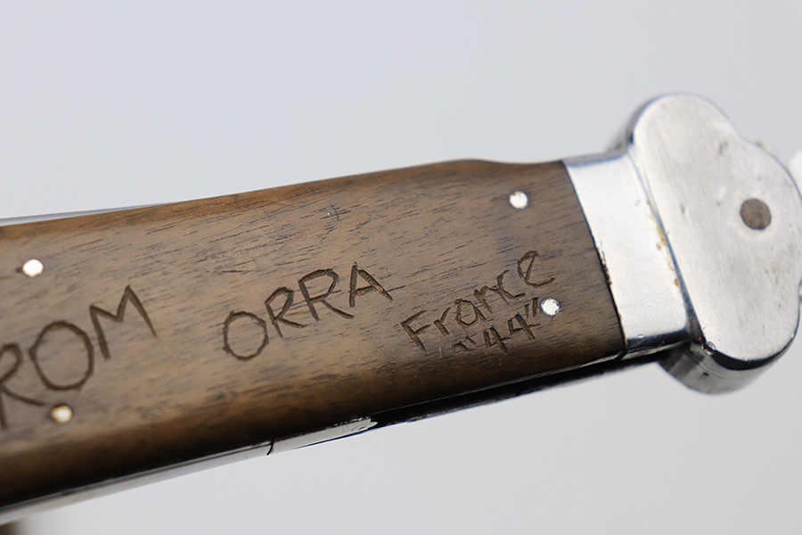 2/4/22 – This is an interesting piece of WW2 history. We have a Luftwaffe gravity knife that appears to have been passed down a few generations after initially being captured in France during 1944. We assume this due to the inscriptions on the handle, which on one sides reads, “Dad From Orra, France ’44”. So our guess is the Vet either bought, traded, or captured this as a souvenir for his father. The other side of the handle shows that later on, in 1985, this blade was gifted again in similar fashion. The other side has a similar style carving in the grip which reads “1985 Ken from Dad”. The blade has been fixed to the open position by a post-factory pin installed in the base. Further, the release lever is missing and broken. See photos. The spike still releases and returns without issue, and is Luftwaffe eagle stamped on the base.