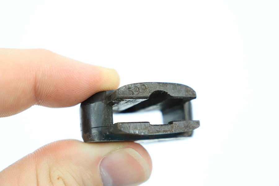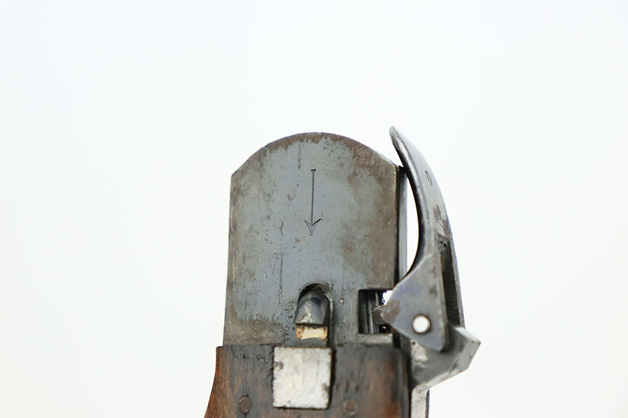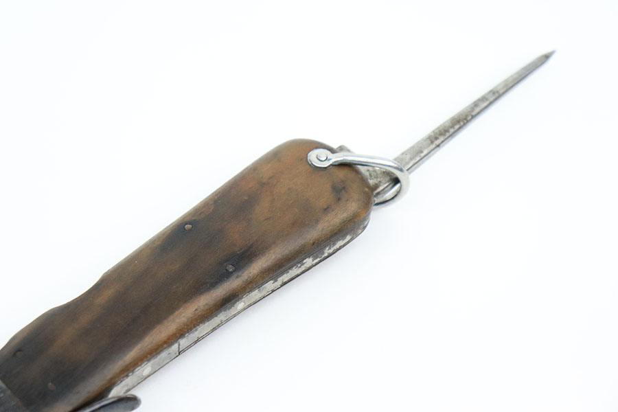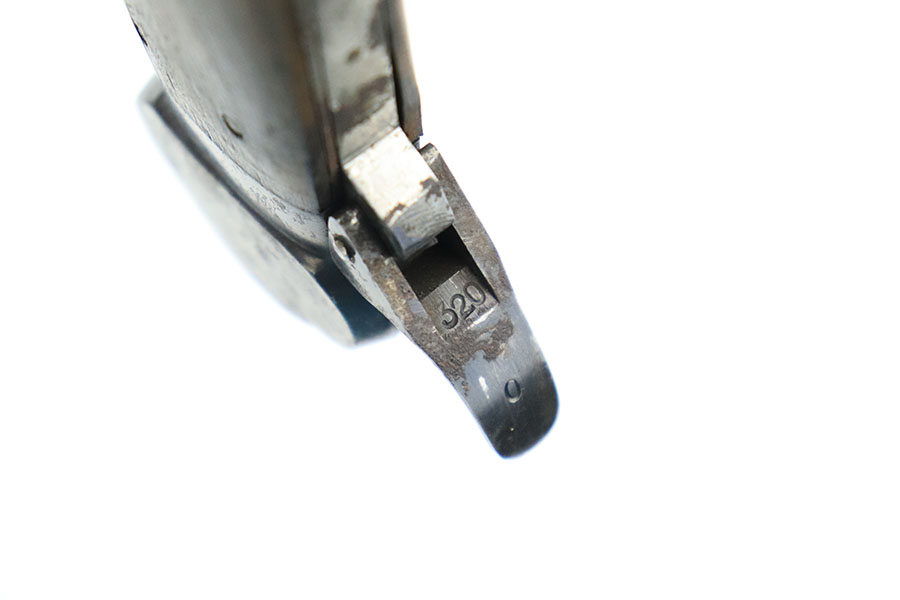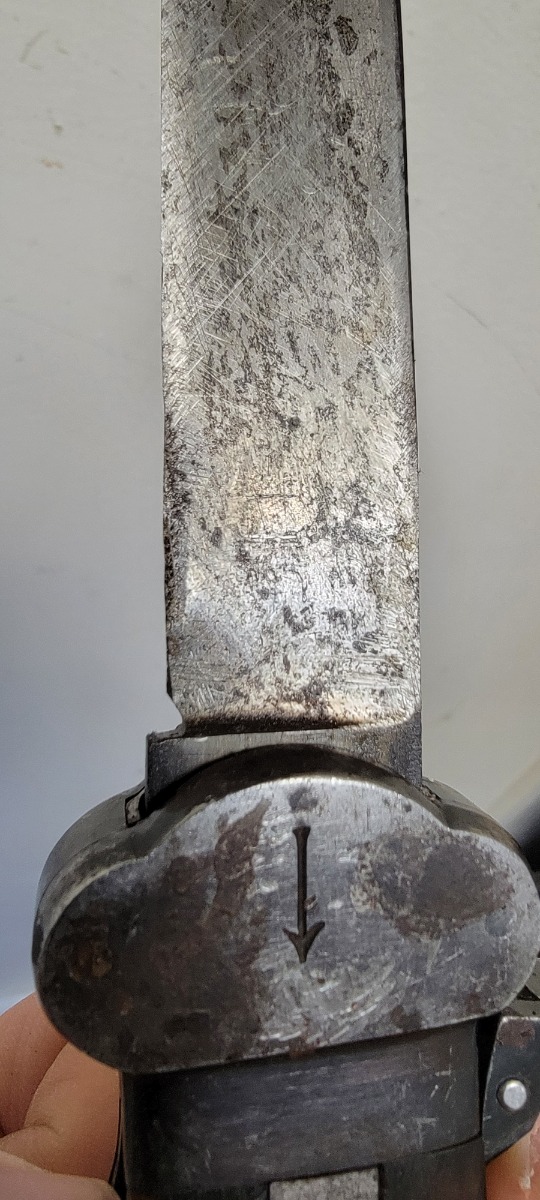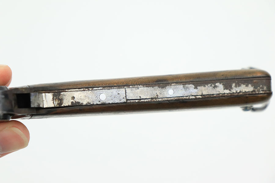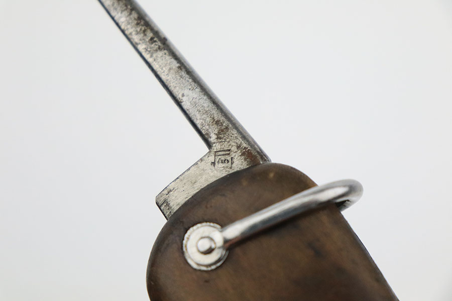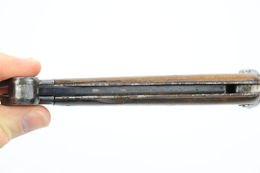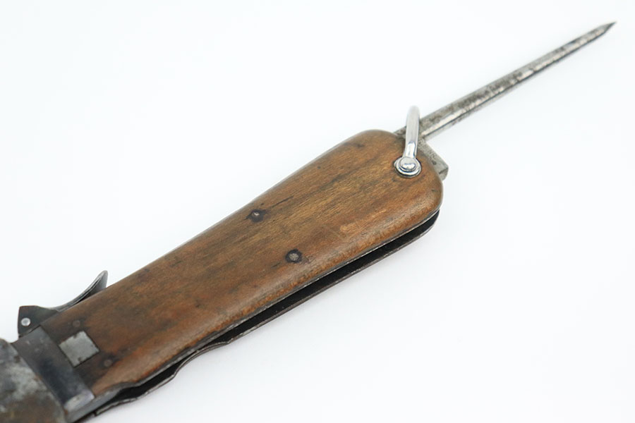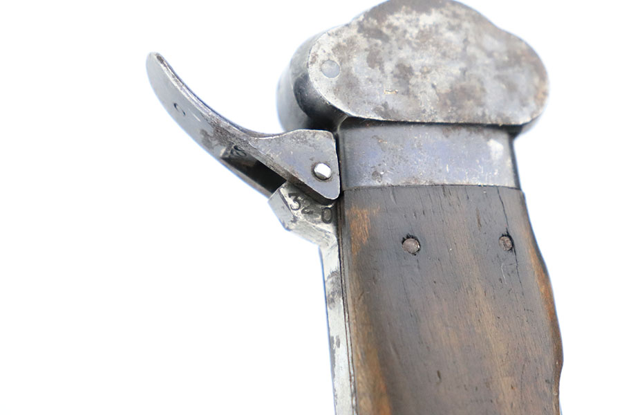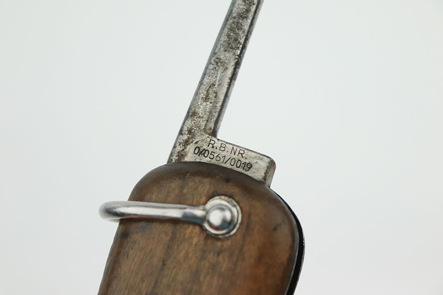10/10/22 – This is an original Takedown style Luftwaffe Gravity Knife. The takedown style knives are the earlier wartime variation of Gravity knife and feature a square button for easily disassembly and repair. The knife is fully functional with properly locking pick and blade. The blade shows signs of use and sharpening along the edge. There’s surface oxidation and aging patina throughout the blade and pommel. The blade is maker stamped by Alexander Coppel, but only part of the logo is visible. The pommel still shows some traces of original finish, and more of the blued finish is found on the sides and on the release lever. The side pick is RB Nr. Numbered, as shown. There’s some spotty surface rust and patina throughout the metal portions of pick and sides of the wood handles. The wood is in great condition with some mild surface wear. The internal parts are not matching numbered.