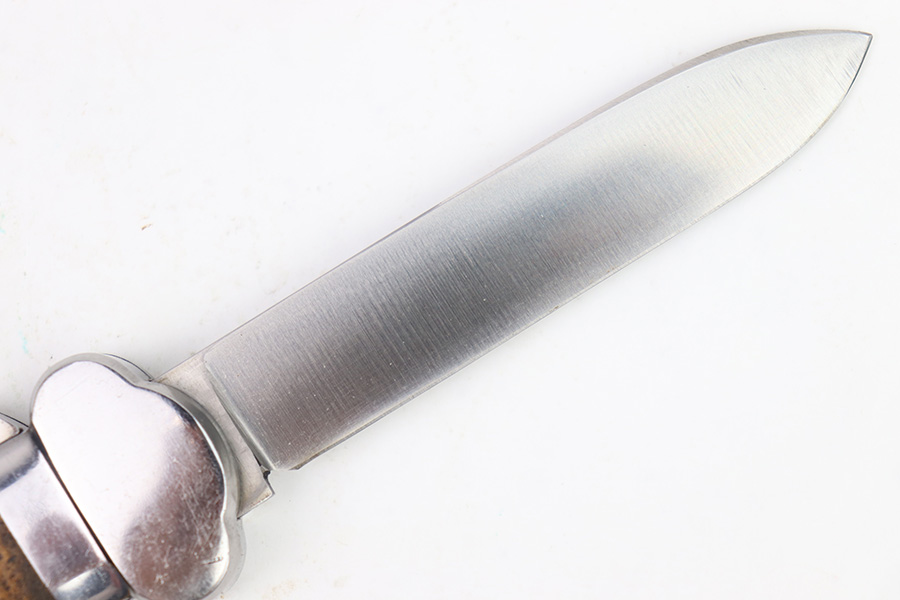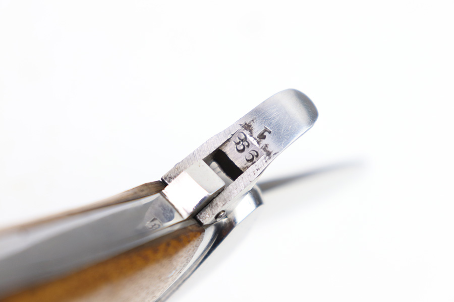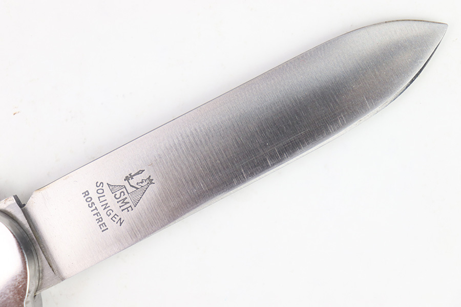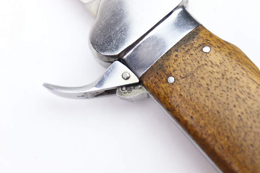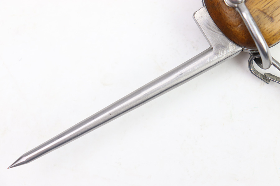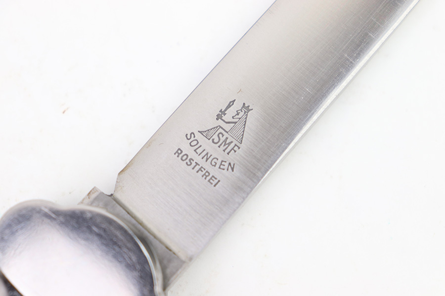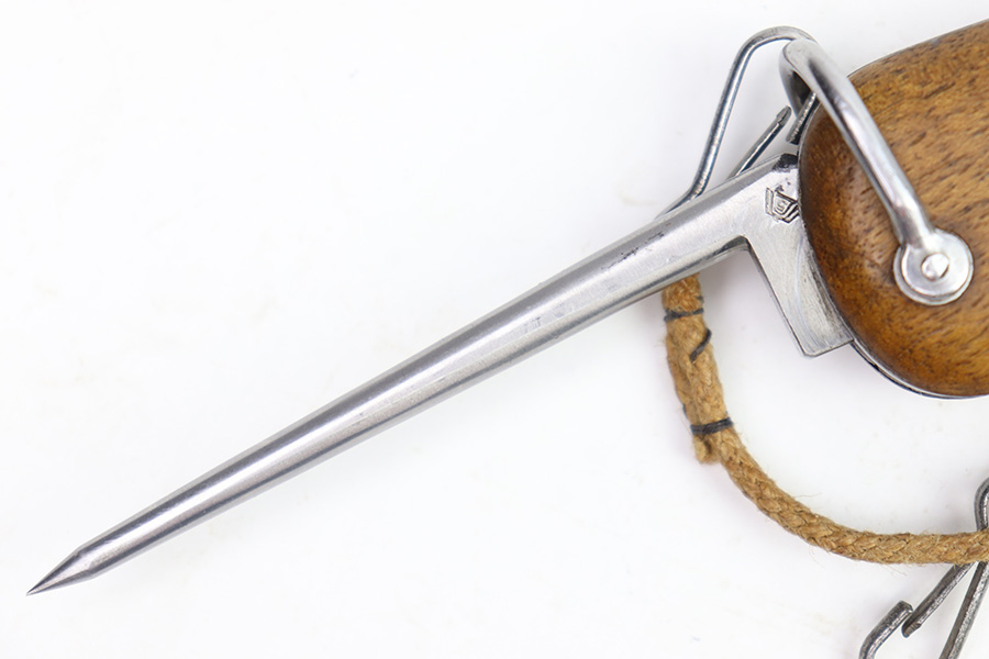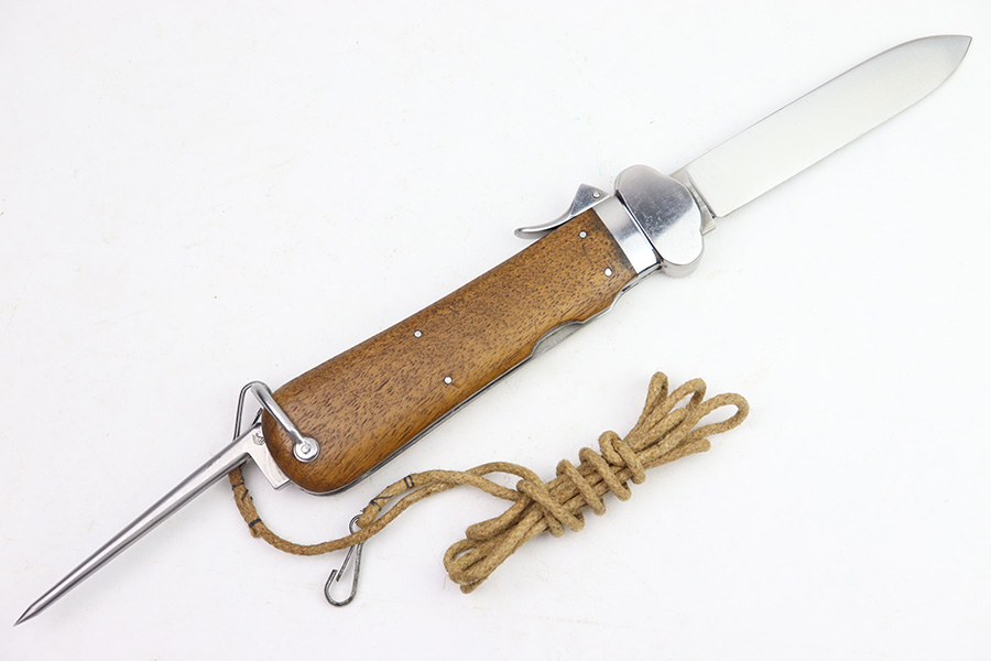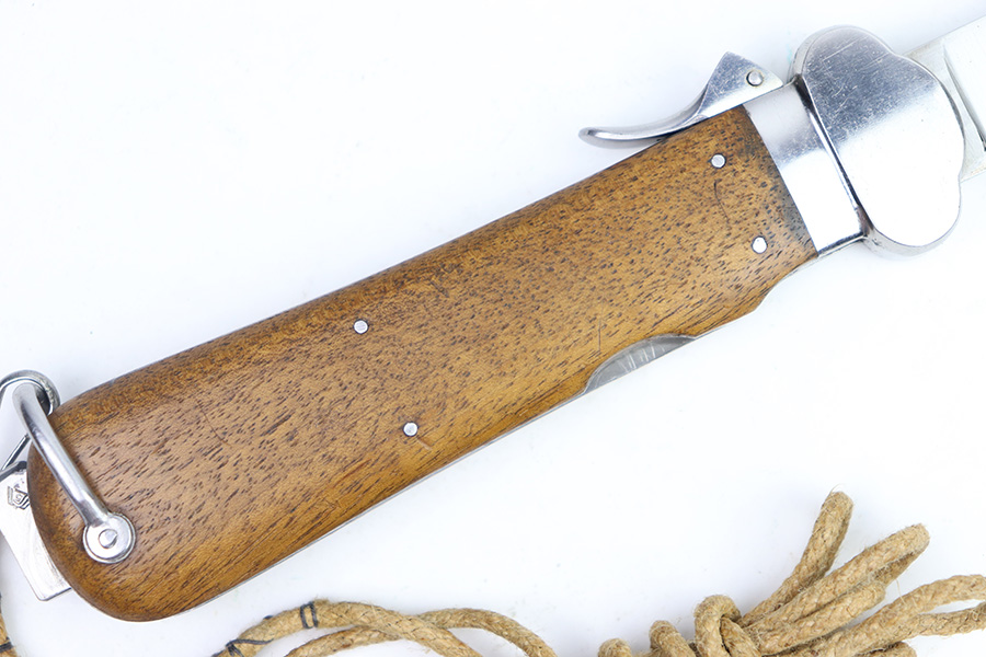 9/17/22 – This is an original Luftwaffe Gravity knife from WW2. The knife is in excellent condition with a very clean blade maker stamped by SMF. The blade is clean with no signs of sharpening and strong cross-graining. The locking mechanism is functional and tight. The spike is proof stamped at the base with an eagle/5 proof. The wood handle has some mild surface wear but no cracks or chips. The metal hilt and small parts have some mild surface patina but no rust or pitting and all the numbered parts match. Comes with an unmarked tan colored lanyard. The lanyard is unmarked but looks to be original WW2 German.