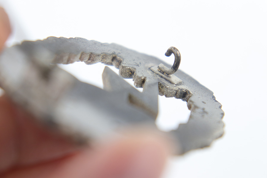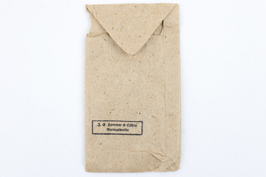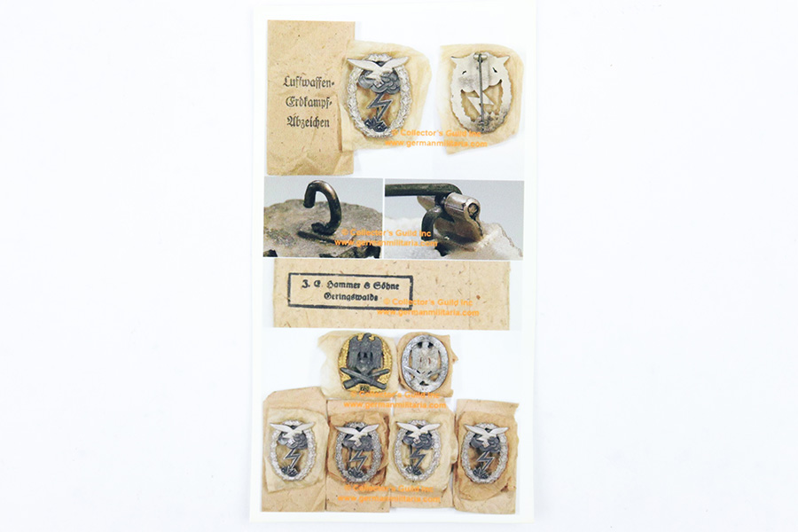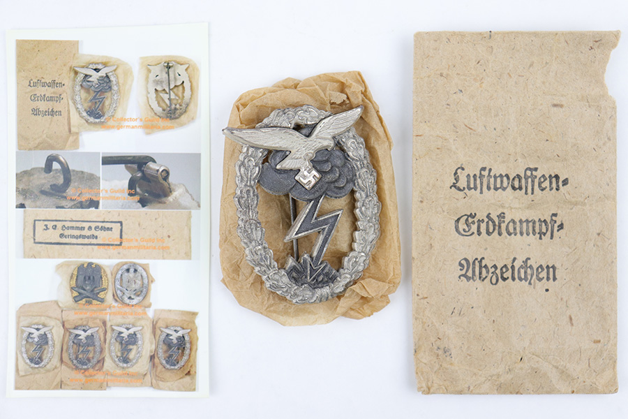 7/14/23 – This is an original Luftwaffe Ground Assault Badge from WW2. The badge comes with an original envelope and wax storage paper. There’s also an included photo of the medal alongside other examples from “Collector’s Guild Inc.”. Although there isn’t proof this badge is shown anywhere in the photo, it’s likely the badge was originally purchased from Collector’s Guild, which helps authenticate this as an original. The badge features a singular, flush rivet attaching the stamped nickel eagle to the outline / frame of the badge. The eagle and outer wreath show high edge wear and typical surface patina, but a significant amount of the original finish is still intact. The reverse retains the original fastening pin and hook, and has no maker markings or stamps. The medal is non-magnetic except for the closure pin. The wreath measures 56mm x 43mm and the eagle wingspan is 41.5mm. Weighs 38 grams.