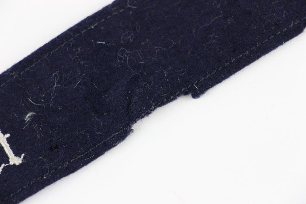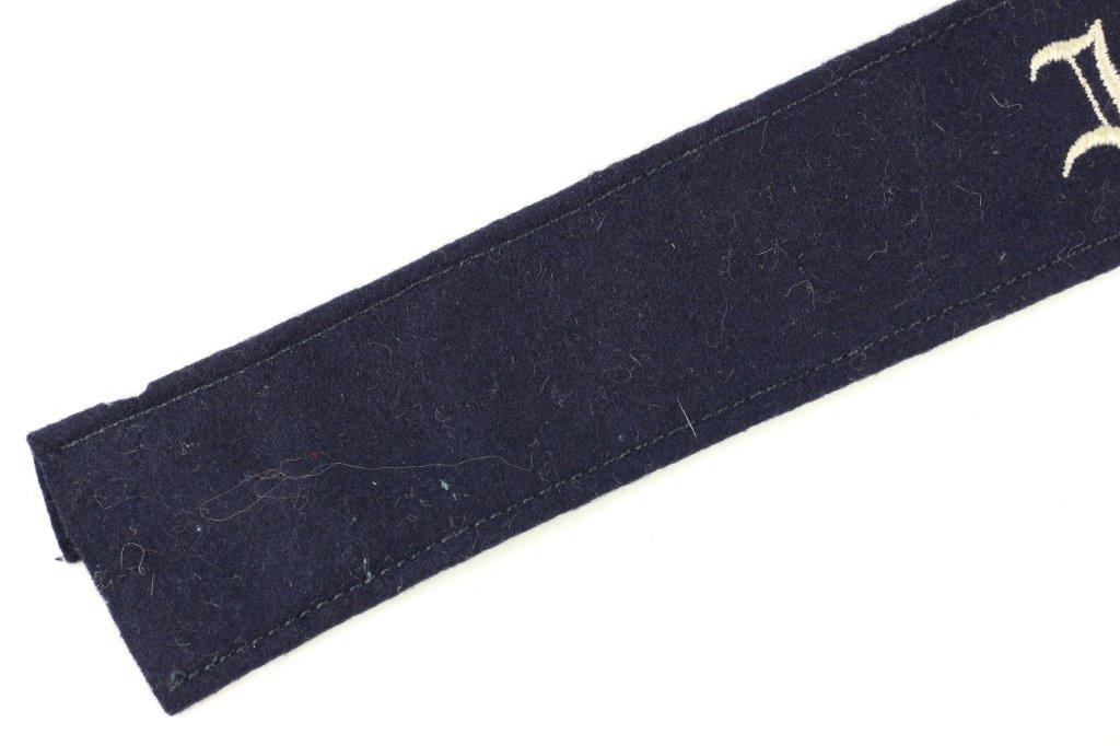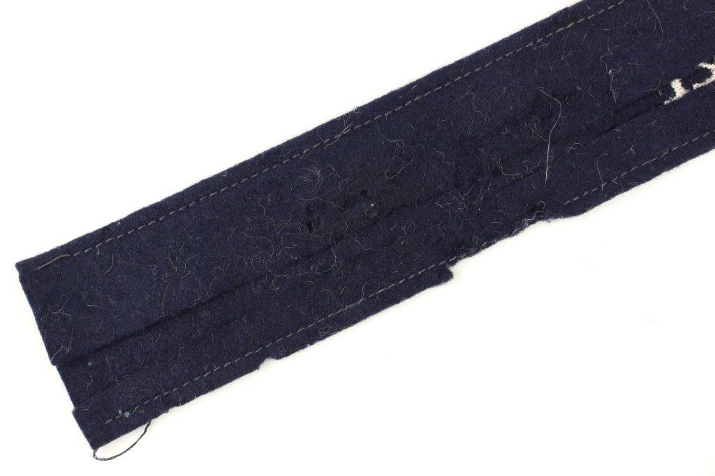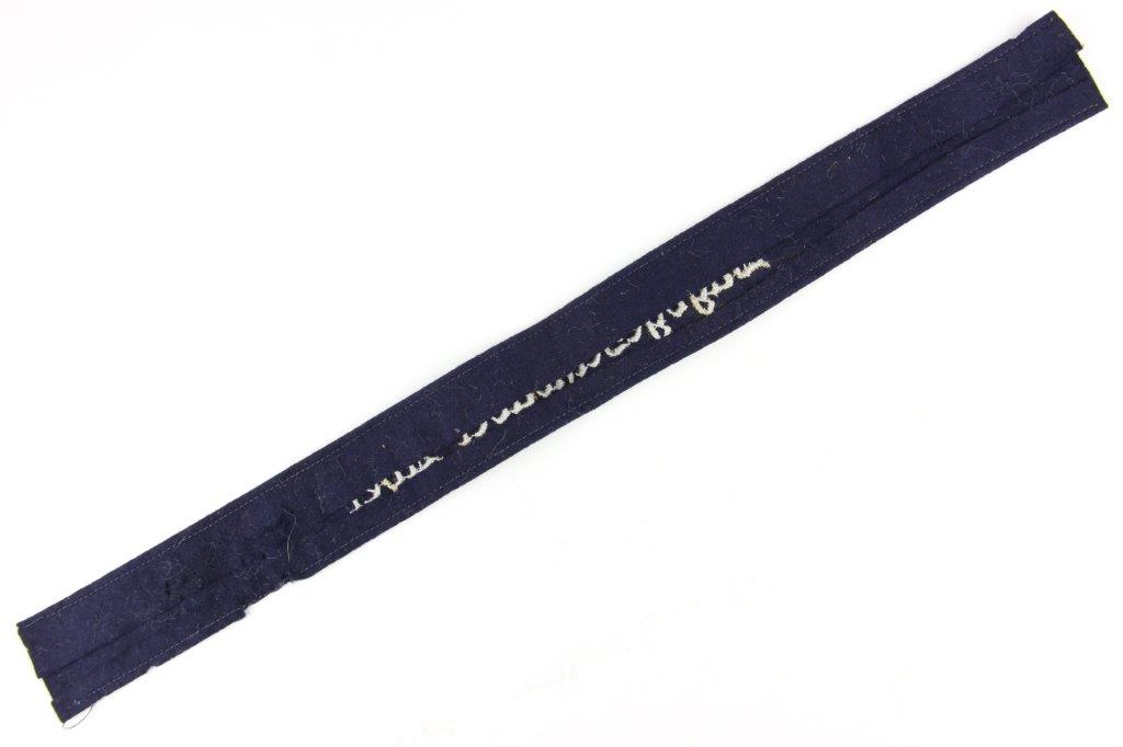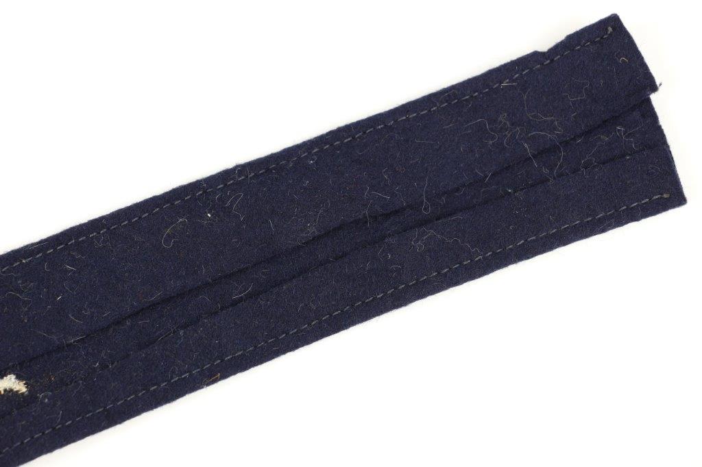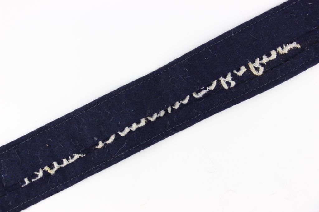 7/16/24 – This is an original WW2 Luftwaffe Jagdgeschwader Udet EM/NCO Cuff Title. Dark blue wool construction with embroidered silver-grey inscription, “JAGDGESCHWADER UDET” in German script. Measures about 44.2cm long and about 3.5cm wide. Verified as original and in very good overall condition. There’s some minor mothing and light surface wear as shown in photos.