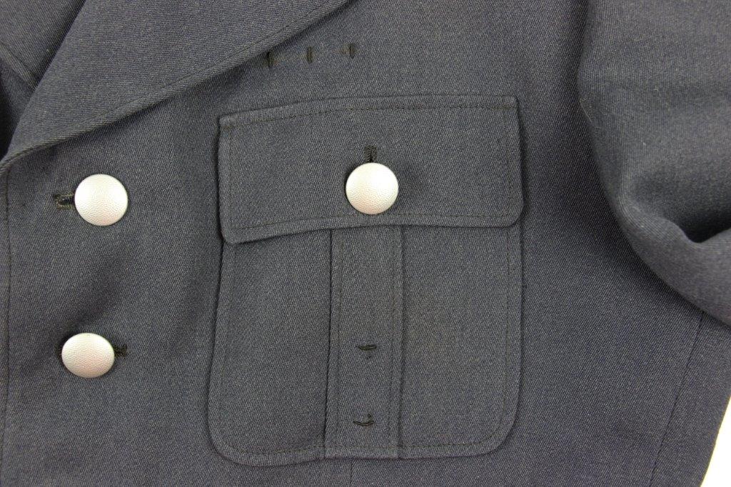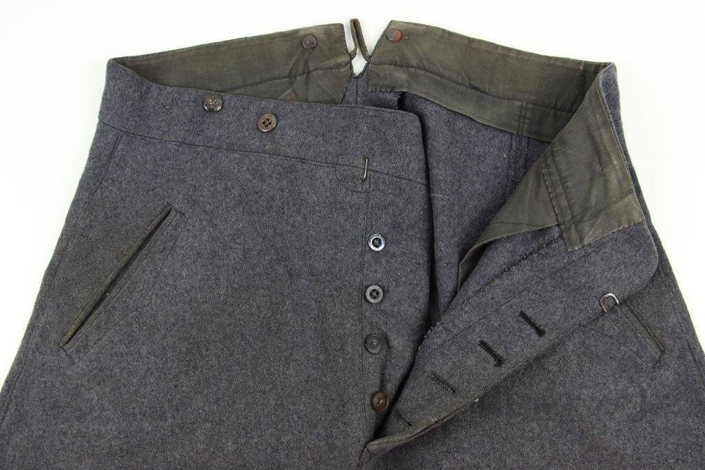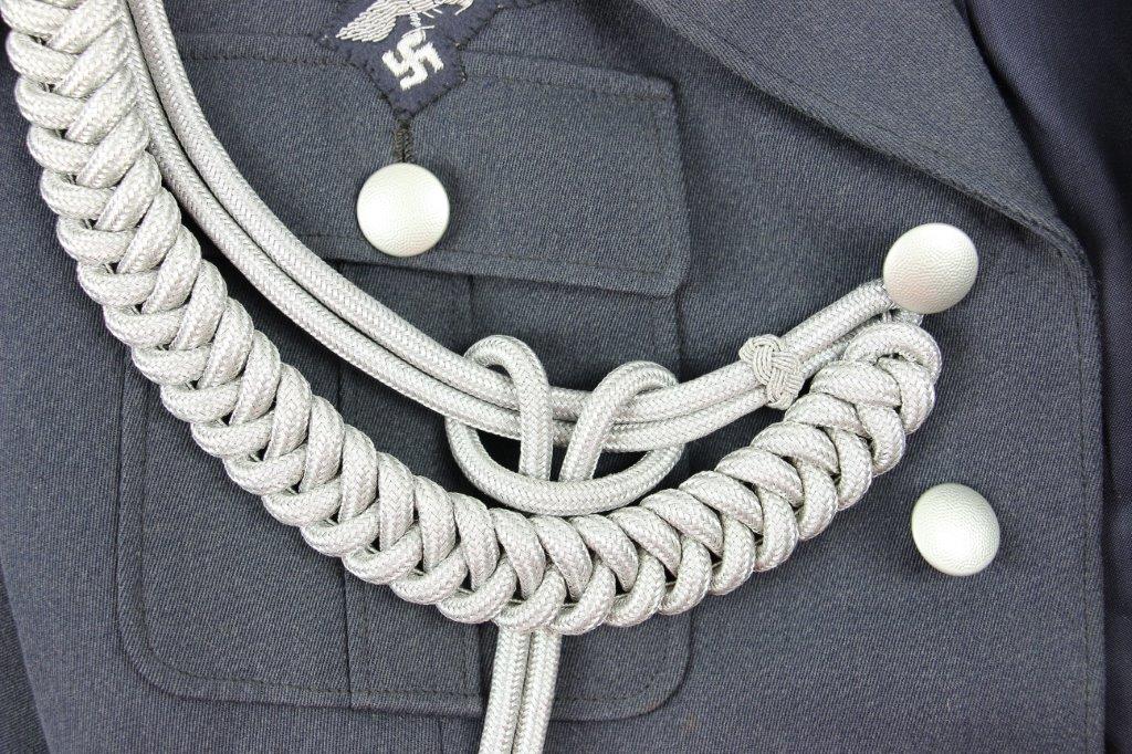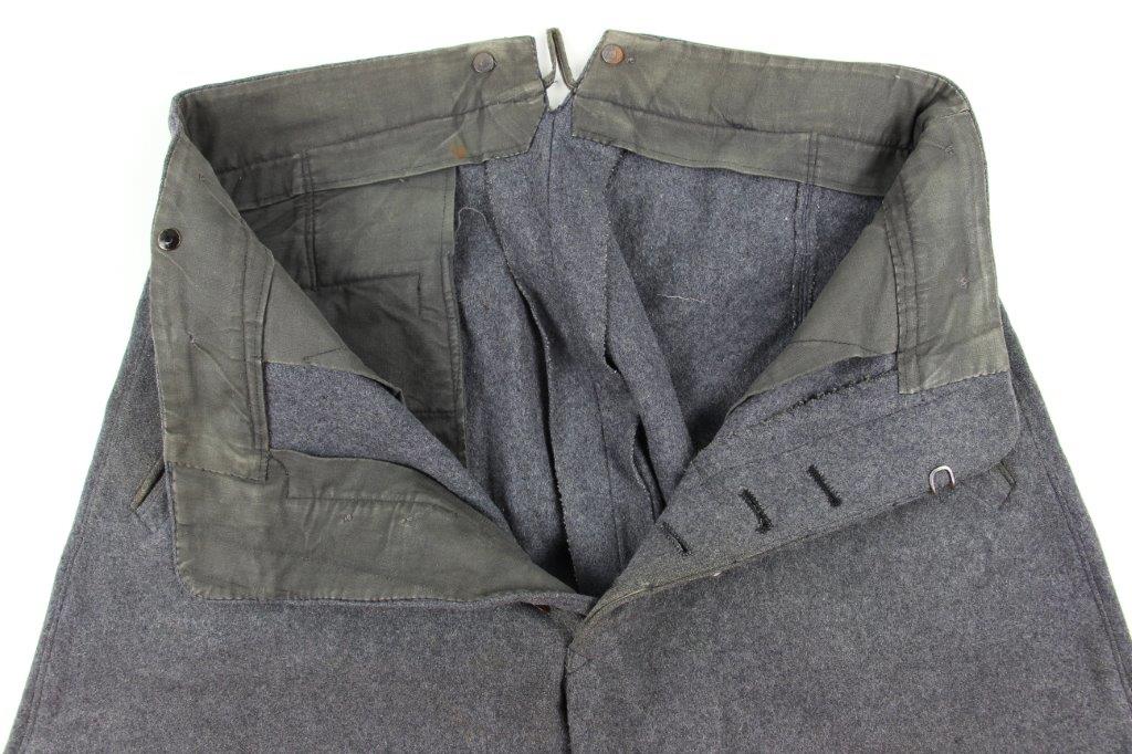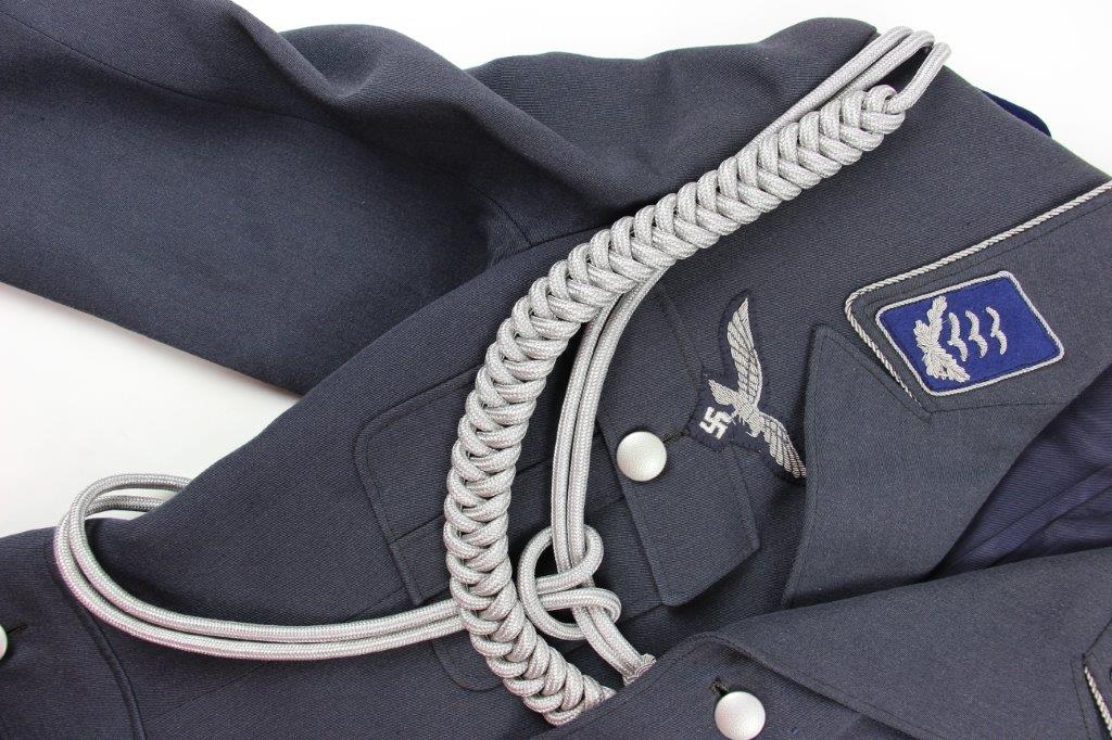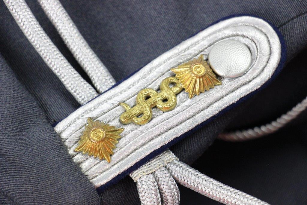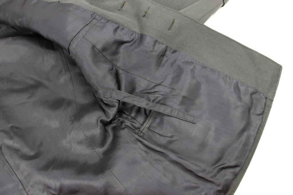 3/26/24 – This is an original WW2 Luftwaffe Medical Tunic. The tunic comes with a pair of period correct wool pants and a 2nd set of Medical Luftwaffe Collar Tabs. These tabs are excellent and original with silver bullion, and is a different rank than the tabs presently attached to the tunic. The tunic has authentic collar tabs, shoulder chord (silver and tight throughout), collar tabs with attached pips, and Luftwaffe uniform eagle sewn on. The silver bullion present on all pieces throughout the tunic is in excellent condition. The tunic overall is in minty condition with no notable stains, stitching issues, or flaws. Very clean and crisp throughout. Clean interior with all original and intact lining. The pants are equally excellent with no holes, rips, or frayed ends. The fastening buttons along the waistband display some surface patina but this is minor wear on an otherwise mint grouping.