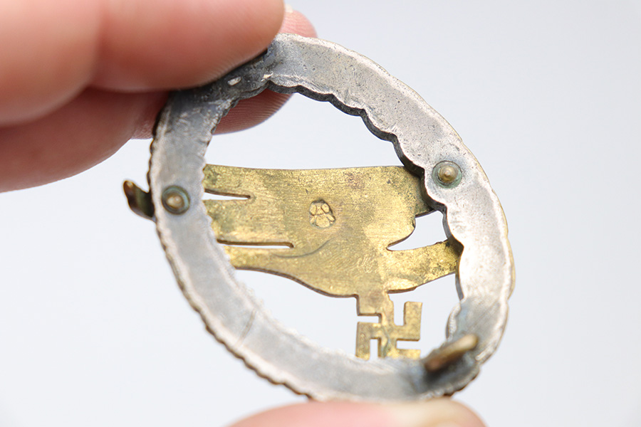 10/22/21 – This is an original WW2 Luftwaffe Paratrooper badge. The medal is two-piece construction, made out of Tombac (early ww2 variation). The reverse is Assmann maker stamped. The closure pin is in great shape and original. The front of the medal shows typical patina, and the back tip of the eagle wing is bent slightly over the wreath.