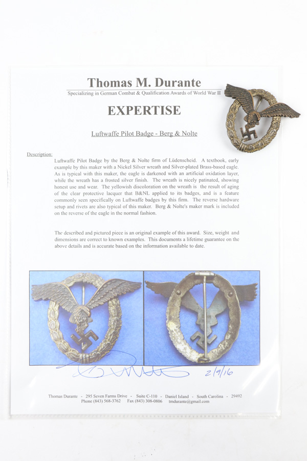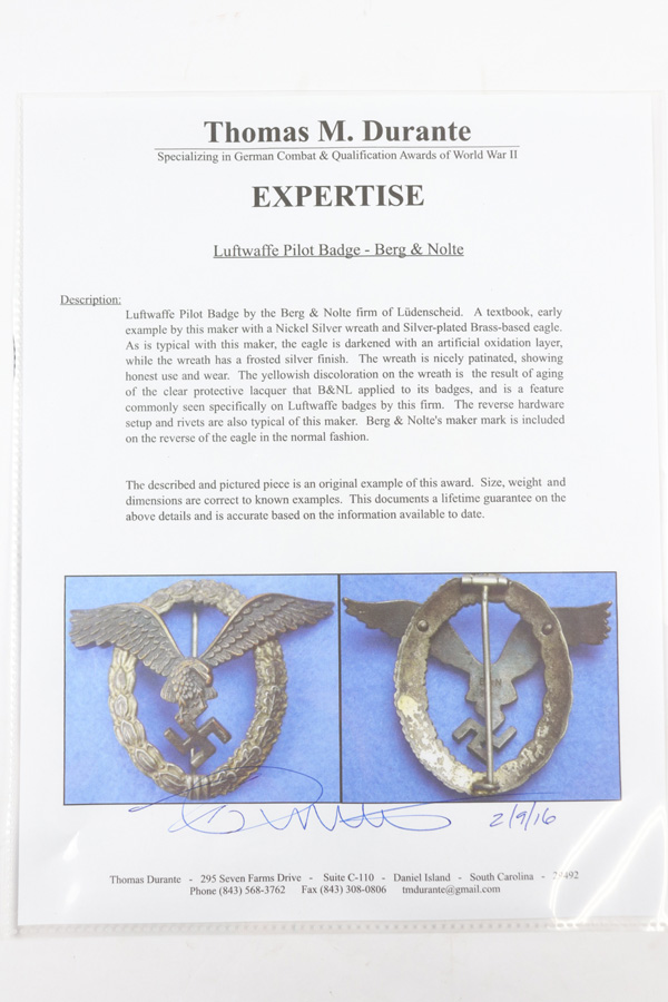 10/23/18 – This is an original early WW2 example of a Luftwaffe Pilot Badge made by Berg & Nolte. Nickel Silver wreath and Silver plated Brass-based eagle. The eagle is purposefully darkened by the manufacturer with an artificial oxidation layer, while the wreath has a frosted silver finish. The wreath has some honest wear. Maker stamped on the reverse side. Comes with a lifetime guarantee and letter of authenticity by Thomas Durante. Signed and dated 2/9/2016. Guaranteed original and authentic.