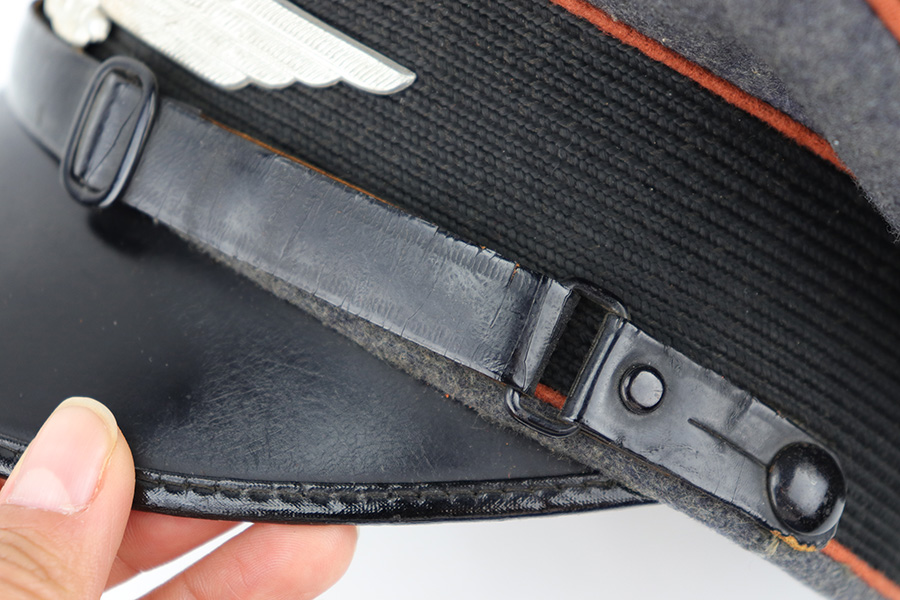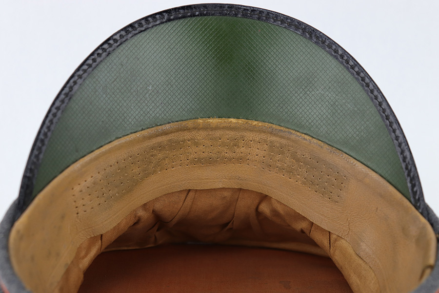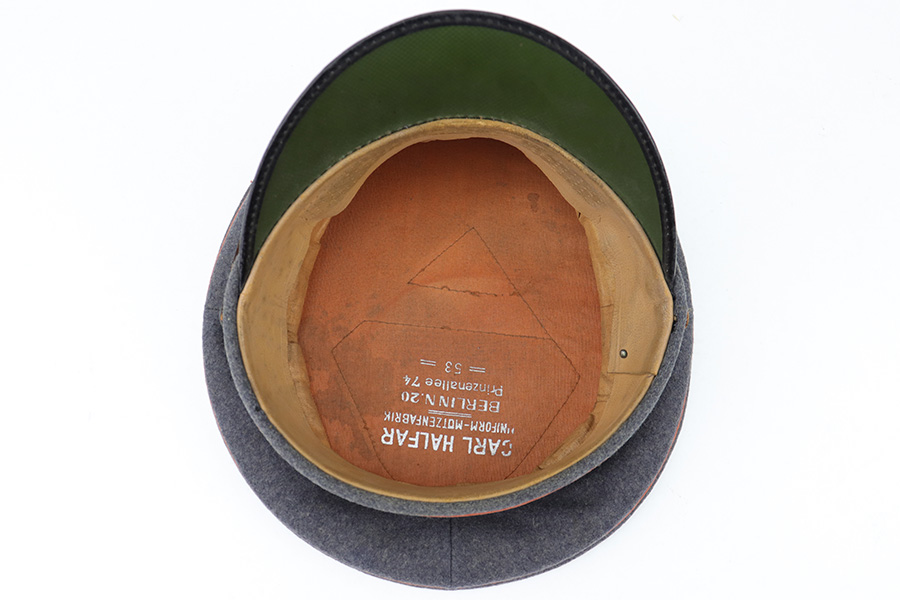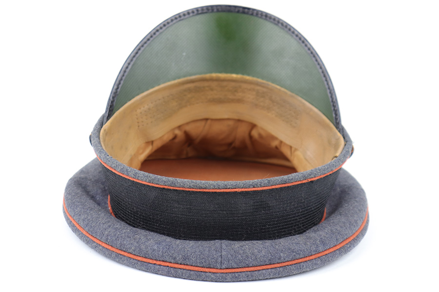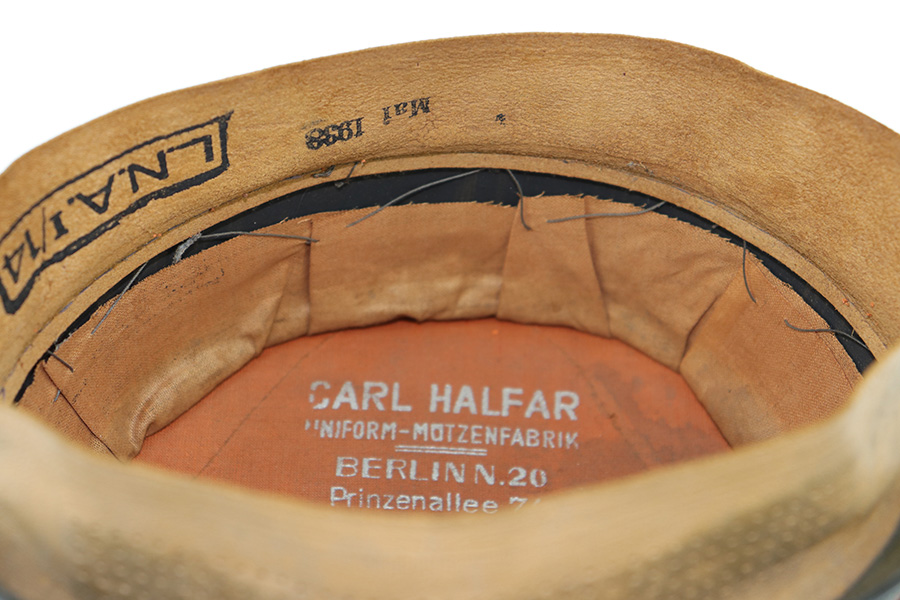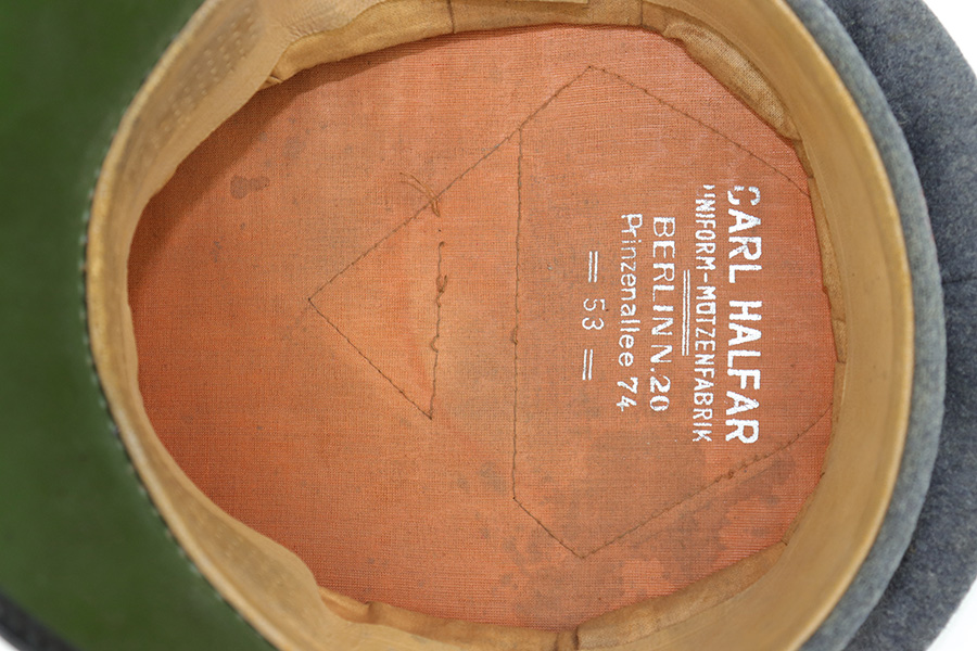 6/15/23 – This is an original Luftwaffe Signal Corps Visor Cap. The blue-grey wool exterior is in great condition with one small hole in the crown and some light areas of surface aging. The brown piping throughout the visor exterior is excellent and clean. The exterior visor band is clean and tight, with an attached aluminum cockade wrapped in an oak leaf wreath with wings. The Luftwaffe eagle is aluminum as well, in excellent condition. The high peak crown is structurally sound and holds shape nicely. The original chinstrap and visor show minimal surface wear and have a shiny black lacquered finish. The interior visor is green with a diamond shaped pattern in excellent condition. The interior leather headband is clean and securely intact. There’s a 1938 date and ink stamp on the interior of this leather headband (shown in photos). The light brown interior is clean, although the celluloid moisture shield is missing. The size, “53” stamp is still visible, as is the maker marking. A very nice example overall.