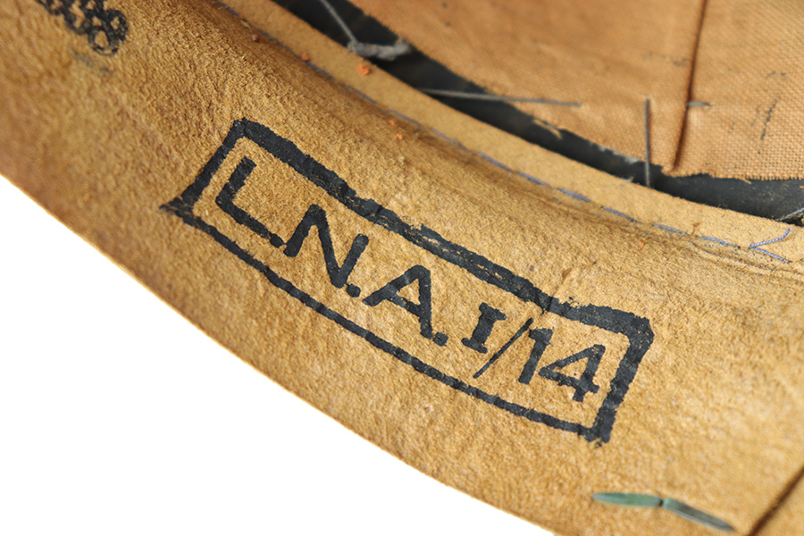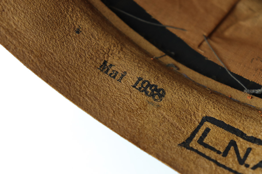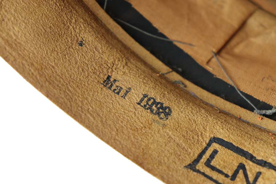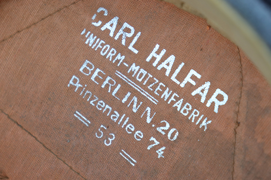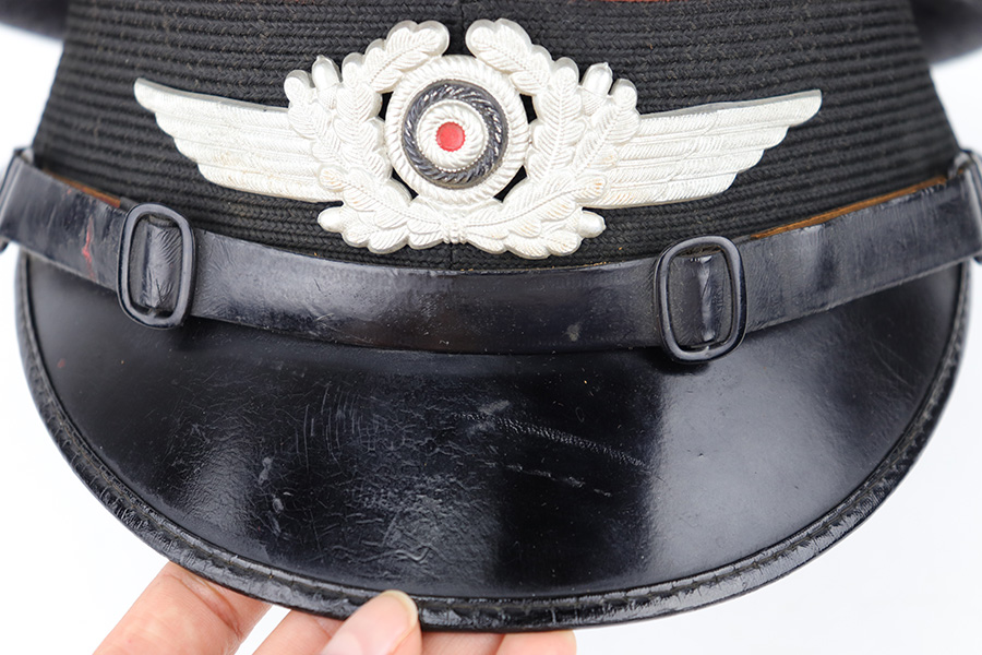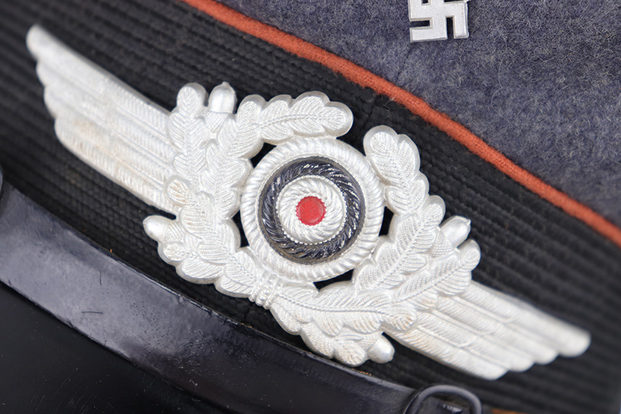 6/15/23 – This is an original Luftwaffe Signal Corps Visor Cap. The blue-grey wool exterior is in great condition with one small hole in the crown and some light areas of surface aging. The brown piping throughout the visor exterior is excellent and clean. The exterior visor band is clean and tight, with an attached aluminum cockade wrapped in an oak leaf wreath with wings. The Luftwaffe eagle is aluminum as well, in excellent condition. The high peak crown is structurally sound and holds shape nicely. The original chinstrap and visor show minimal surface wear and have a shiny black lacquered finish. The interior visor is green with a diamond shaped pattern in excellent condition. The interior leather headband is clean and securely intact. There’s a 1938 date and ink stamp on the interior of this leather headband (shown in photos). The light brown interior is clean, although the celluloid moisture shield is missing. The size, “53” stamp is still visible, as is the maker marking. A very nice example overall.