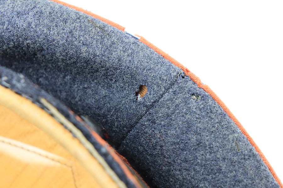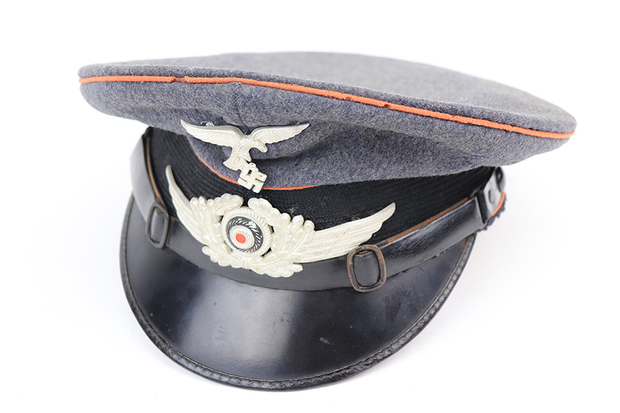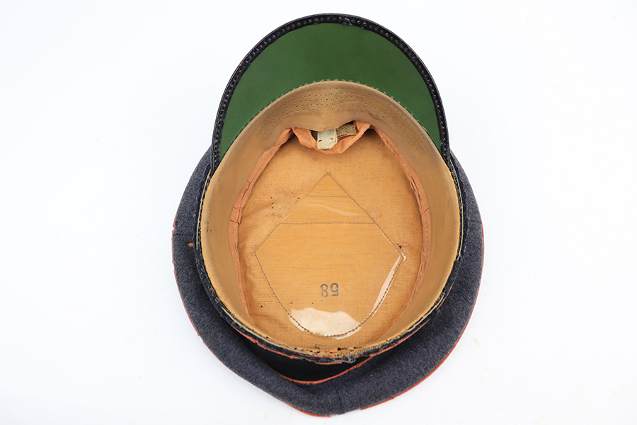 1/11/22 – This is an original WW2 Luftwaffe wool cap. The cap has copper brown piping, which indicates a signal unit. The wool has some small moth holes but is in great overall condition. The piping also has some mild tattering in a few small areas, but is mostly in tact. There’s more tattering around the base of the cap, where the leather liner meets the edge. The interior liner is in good condition but there is some normal aging wear as shown. Size stamped “58”. The front interior is frayed and the piece that holds the shape up is coming out slightly on the interior. The decals on the front of the cap shown some mild patina, and the left wing of the Luftwaffe eagle is not attached.