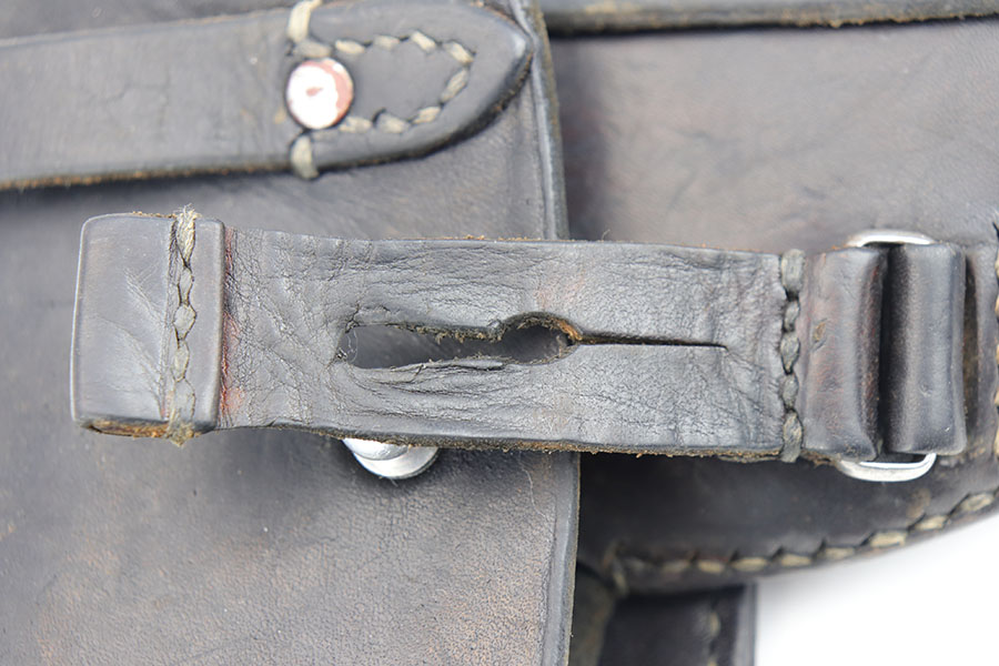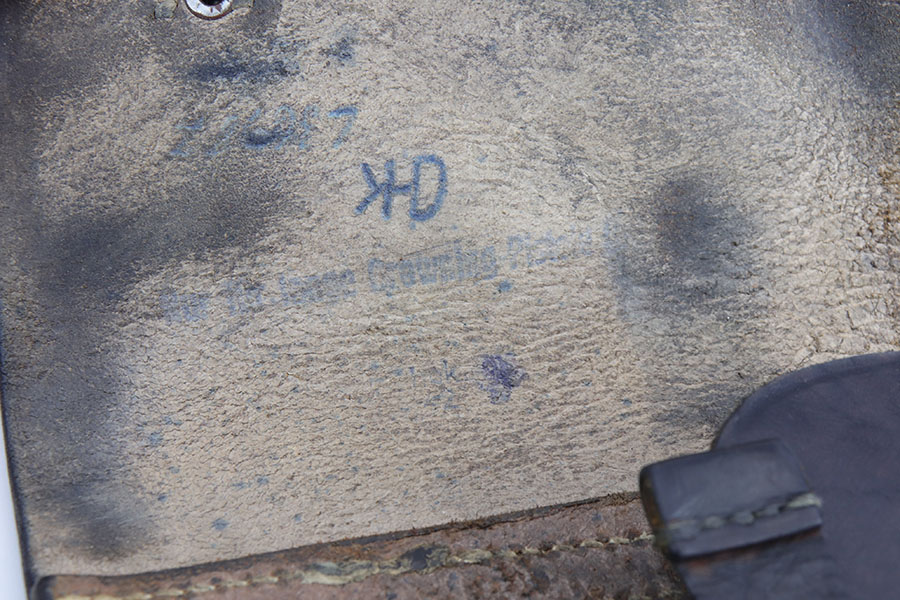 8/15/19 – This is a WW2 style FN model 1922 / Femaru M37 holster. The holster is luftwaffe stamped on the interior leather, as well as ink stamped with a pistol designation, but the ink stamp is too faded and faint to determine which is designated. The luftwaffe eagle is underneath this ink stamp, and is hard to see in photos but evident on the interior leather. There are no other markings. The black leather has normal wear / pliability and someone modified the closure strap by cutting a slit in it to make it larger – see photos. All original stitching in tact.