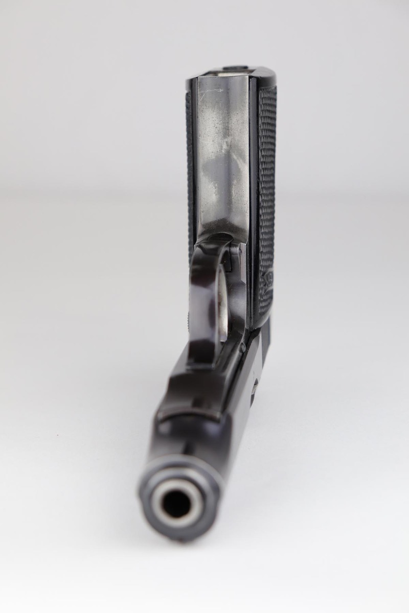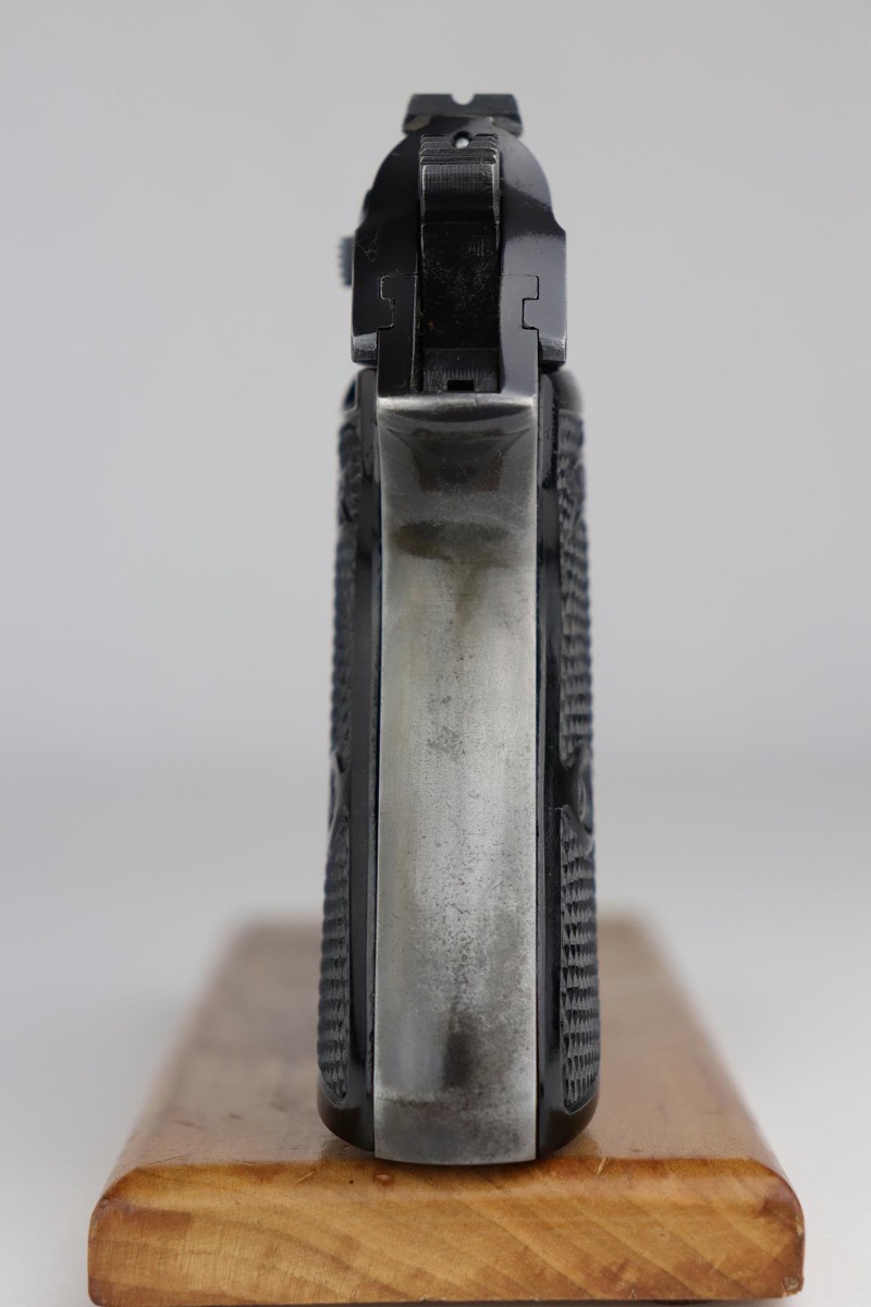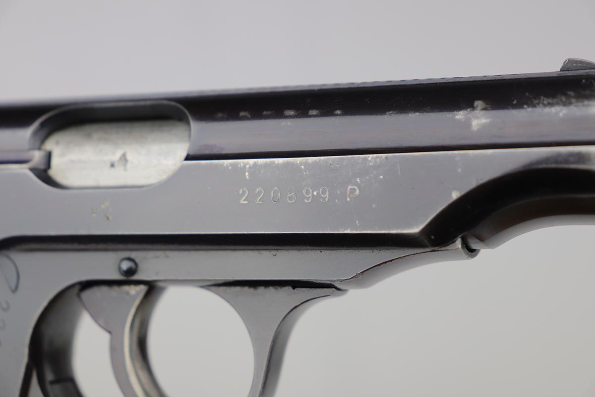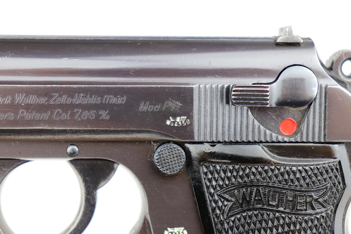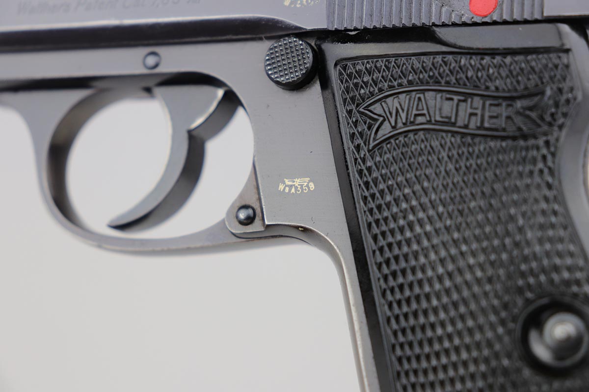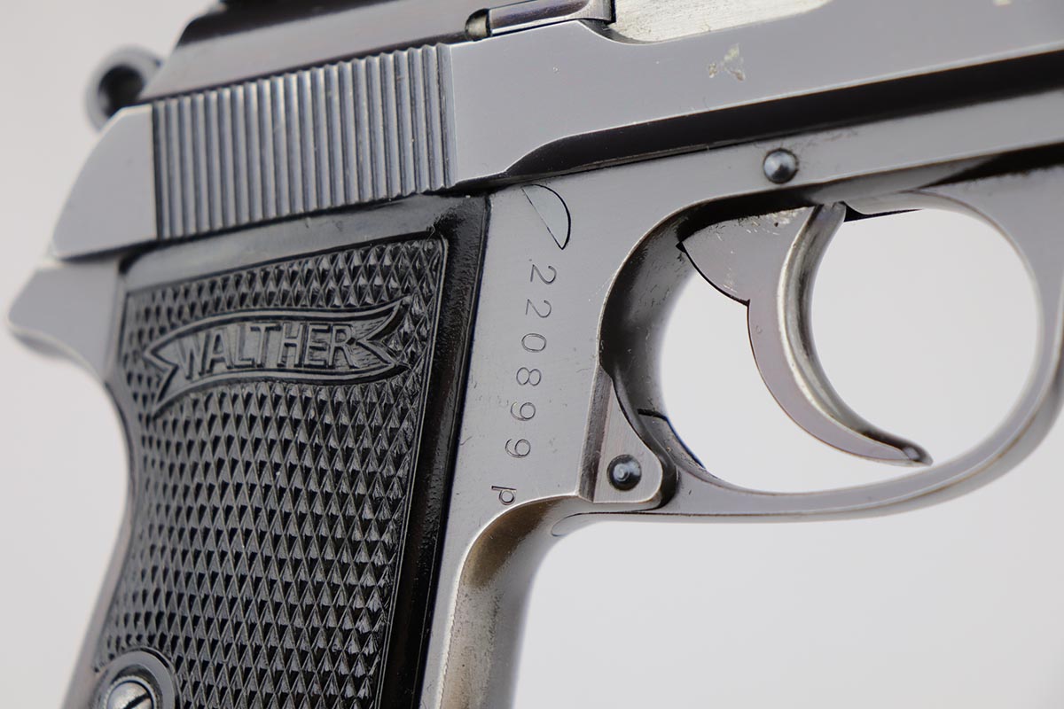 5/29/19 – This is a Luftwaffe contract Walther PP from 1941-42, with the original matching magazine. These are distinct in that they are in that they are waffen proofed on the slide and frame, feature high-polish blue and their magazines are numbered on the base plate. They were issued with two numbered magazines, but this one comes with one matching magazine. The original finish covers about 70-80% of the gun with some standard slide wear, but majority of finish loss on the straps. The gun has matching frame and slide with eagle/N proofs on the slide, barrel and ejection port. Mechanically it is in good condition and has an excellent, shiny bore.
