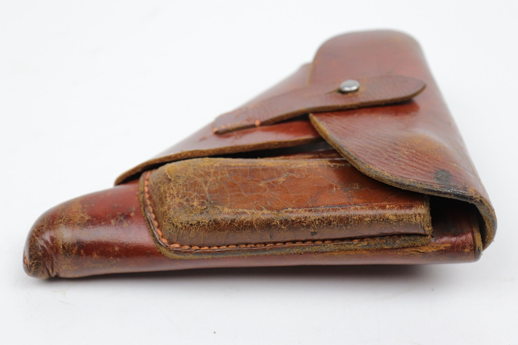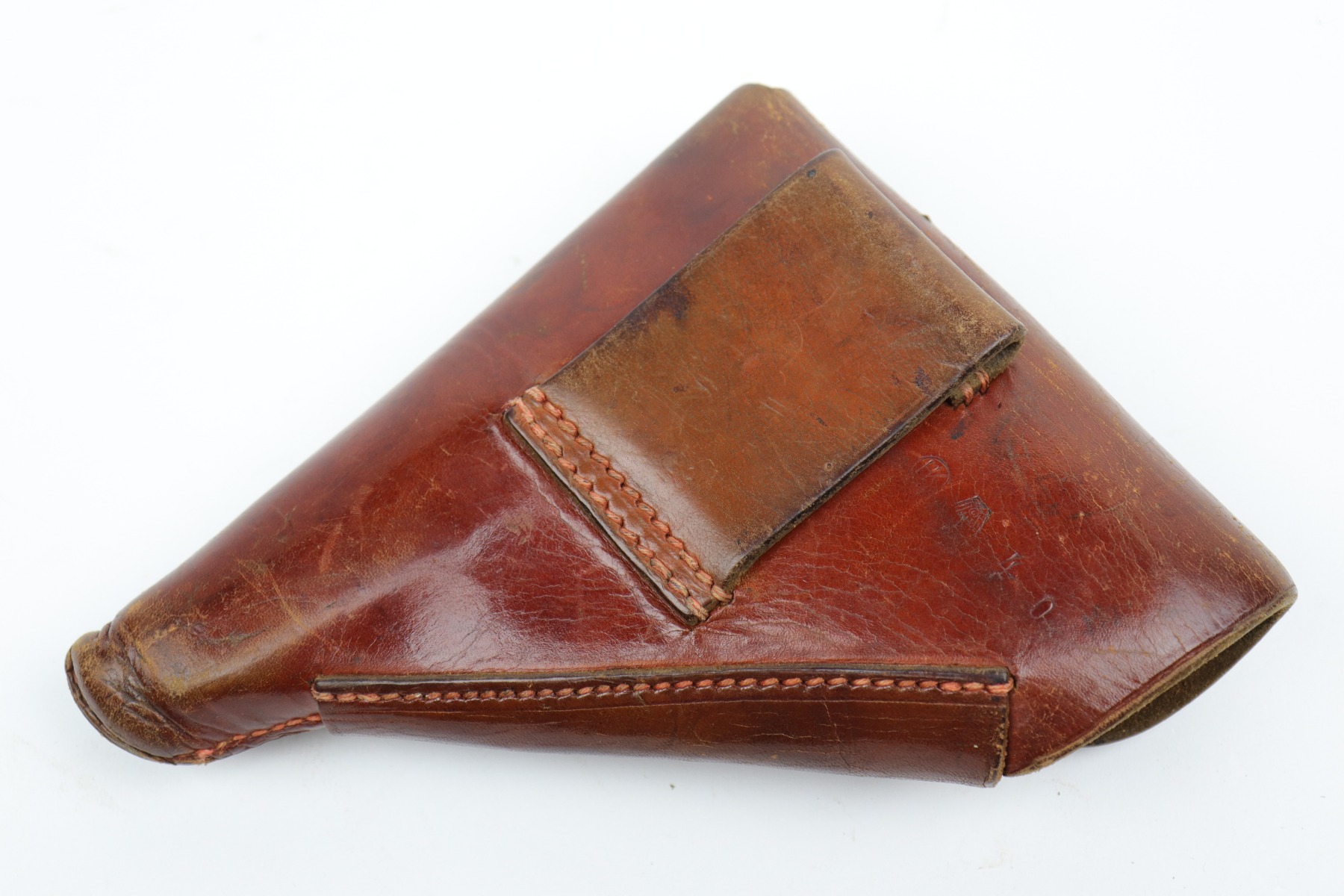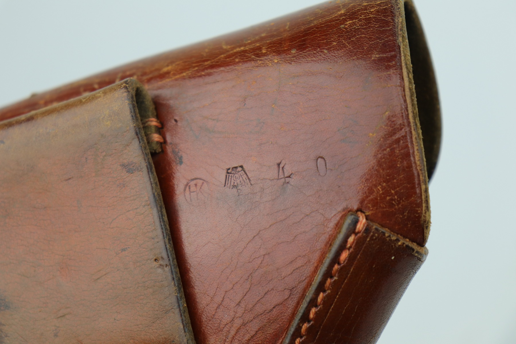 10/14/20 – This is nice example of a Luftwaffe-marked brown leather holster for a Walther PP or PPK. The back has a Luftwaffe proof, HK makers mark, and seems to be dated 1940. The holster is nice except for surface cracking most noticeable on the magazine pouch and top flap. Some wrinkling in the toe.