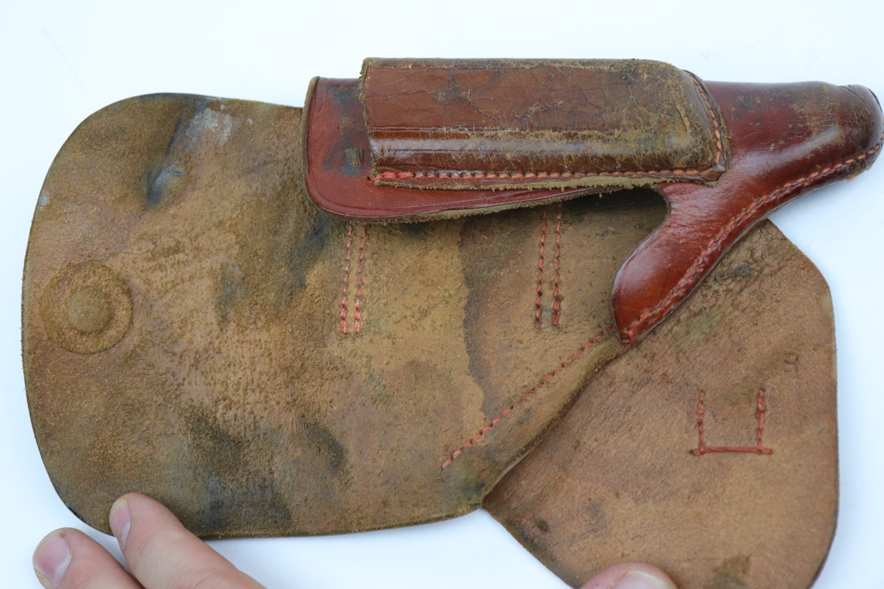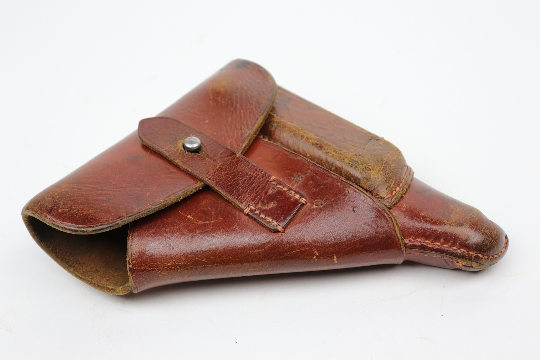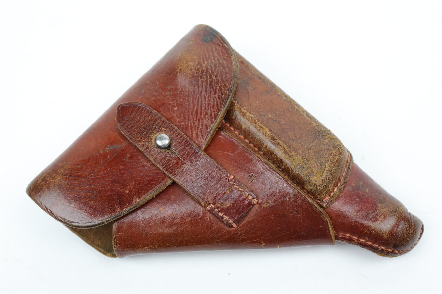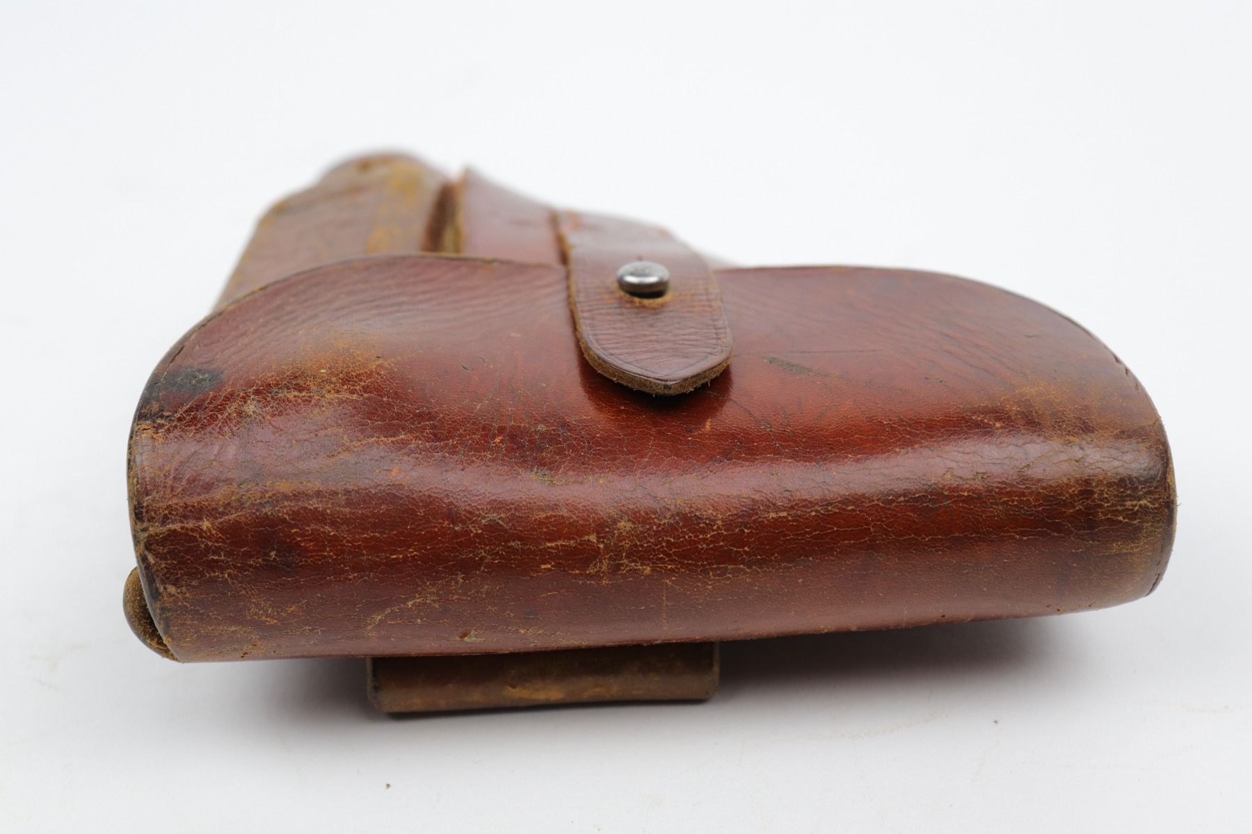 10/14/20 – This is nice example of a Luftwaffe-marked brown leather holster for a Walther PP or PPK. The back has a Luftwaffe proof, HK makers mark, and seems to be dated 1940. The holster is nice except for surface cracking most noticeable on the magazine pouch and top flap. Some wrinkling in the toe.