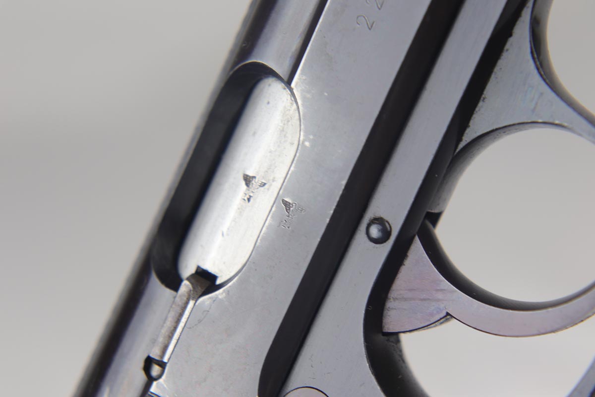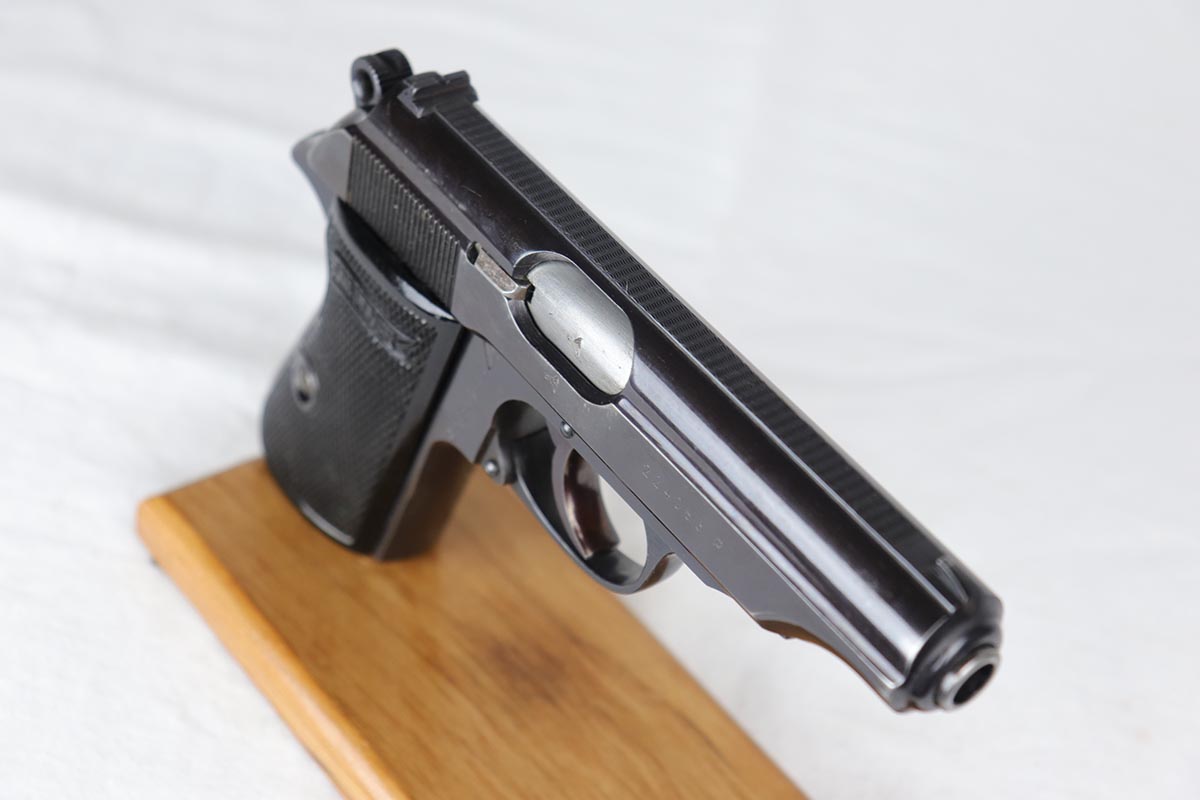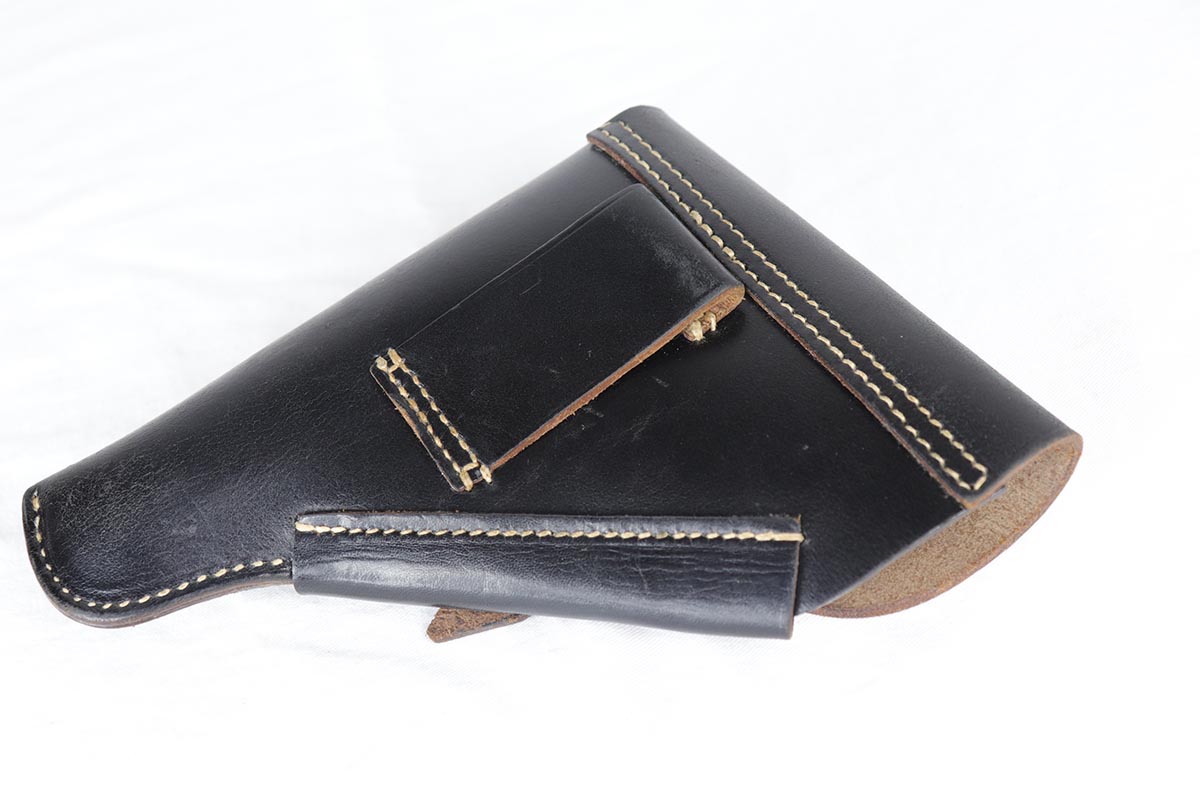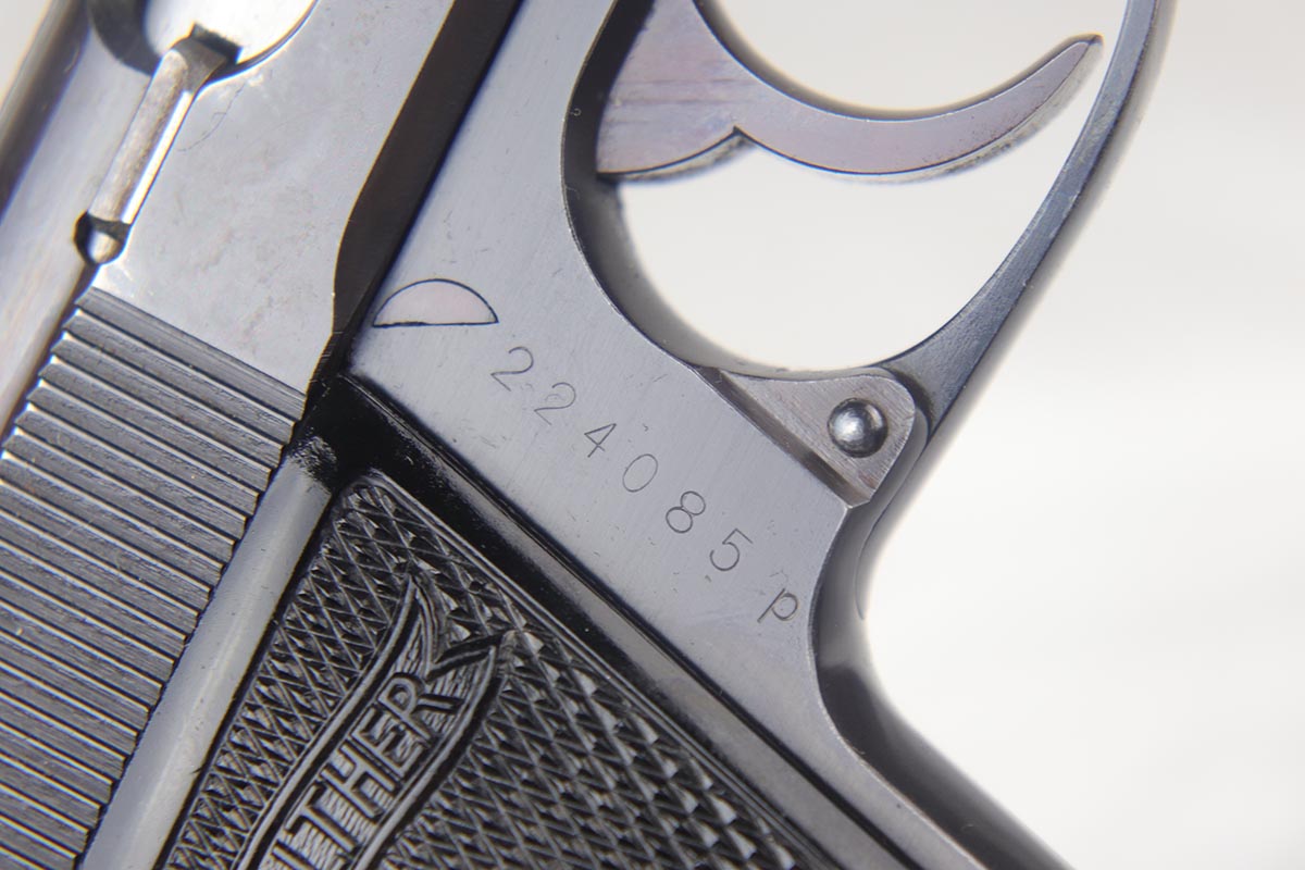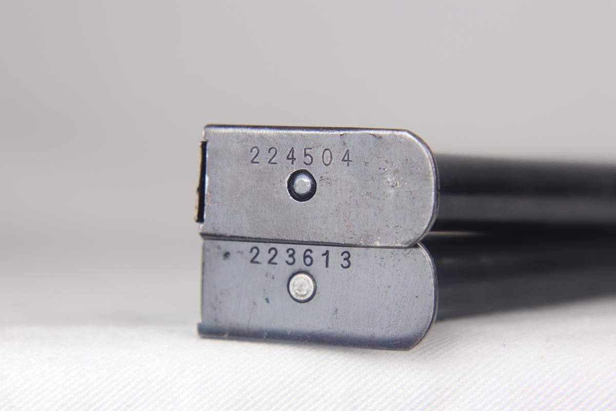 7/24/18 – This is a Luftwaffe contract Walther PP rig from 1942. These are distinct in that they are in that they are waffen proofed on the slide and frame and their magazines are numbered on the base plate. They were issued with two numbered magazines, and this one comes with two near match original magazines. The pistol serial is 224xxx and the magazines are 224xxx and 223xxx. The original finish covers about 95% of the gun with most of the wear found on the left side of the slide and bottom of the back strap. The gun has matching frame and slide with eagle/N proofs on the slide, barrel and ejection port. Mechanically it is in good condition and has an excellent, shiny bore. Comes with a period correct but unmarked holster in excellent condition.