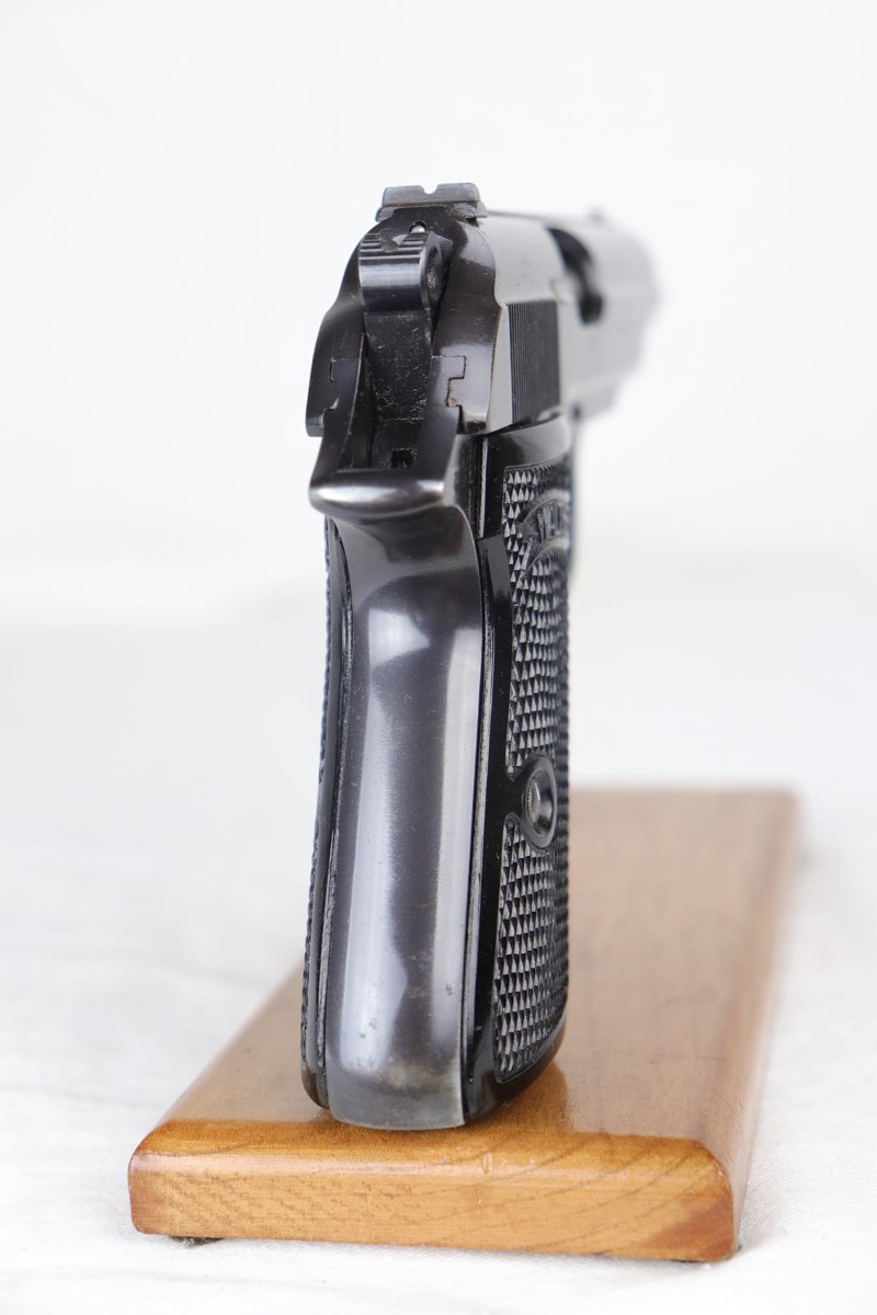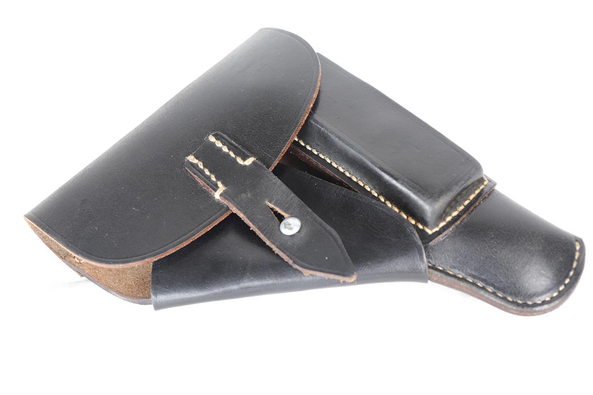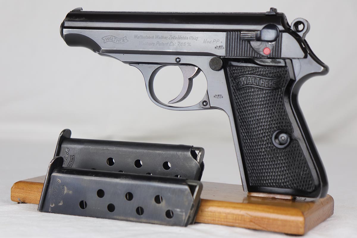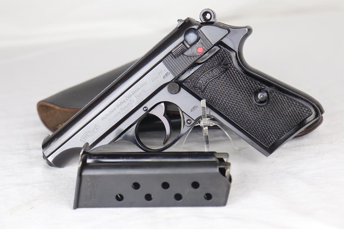 7/24/18 – This is a Luftwaffe contract Walther PP rig from 1942. These are distinct in that they are in that they are waffen proofed on the slide and frame and their magazines are numbered on the base plate. They were issued with two numbered magazines, and this one comes with two near match original magazines. The pistol serial is 224xxx and the magazines are 224xxx and 223xxx. The original finish covers about 95% of the gun with most of the wear found on the left side of the slide and bottom of the back strap. The gun has matching frame and slide with eagle/N proofs on the slide, barrel and ejection port. Mechanically it is in good condition and has an excellent, shiny bore. Comes with a period correct but unmarked holster in excellent condition.