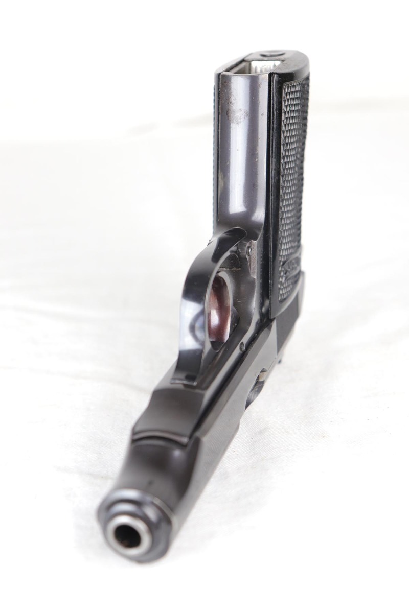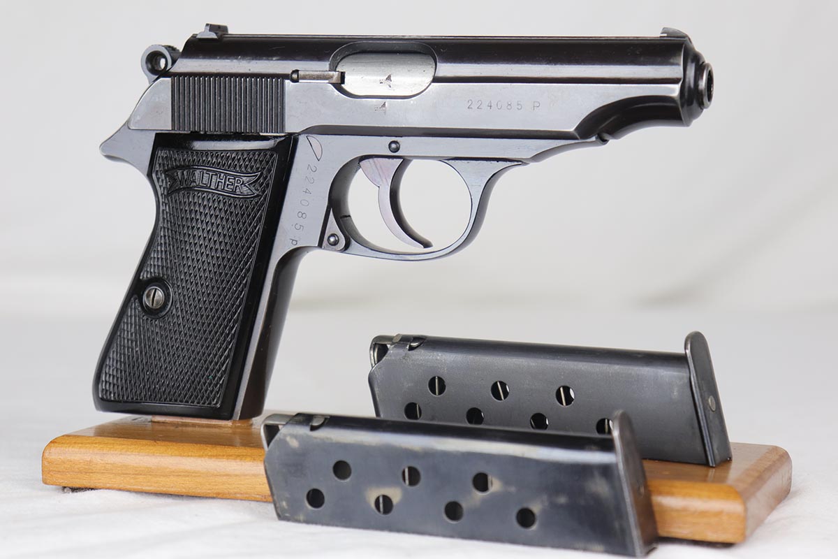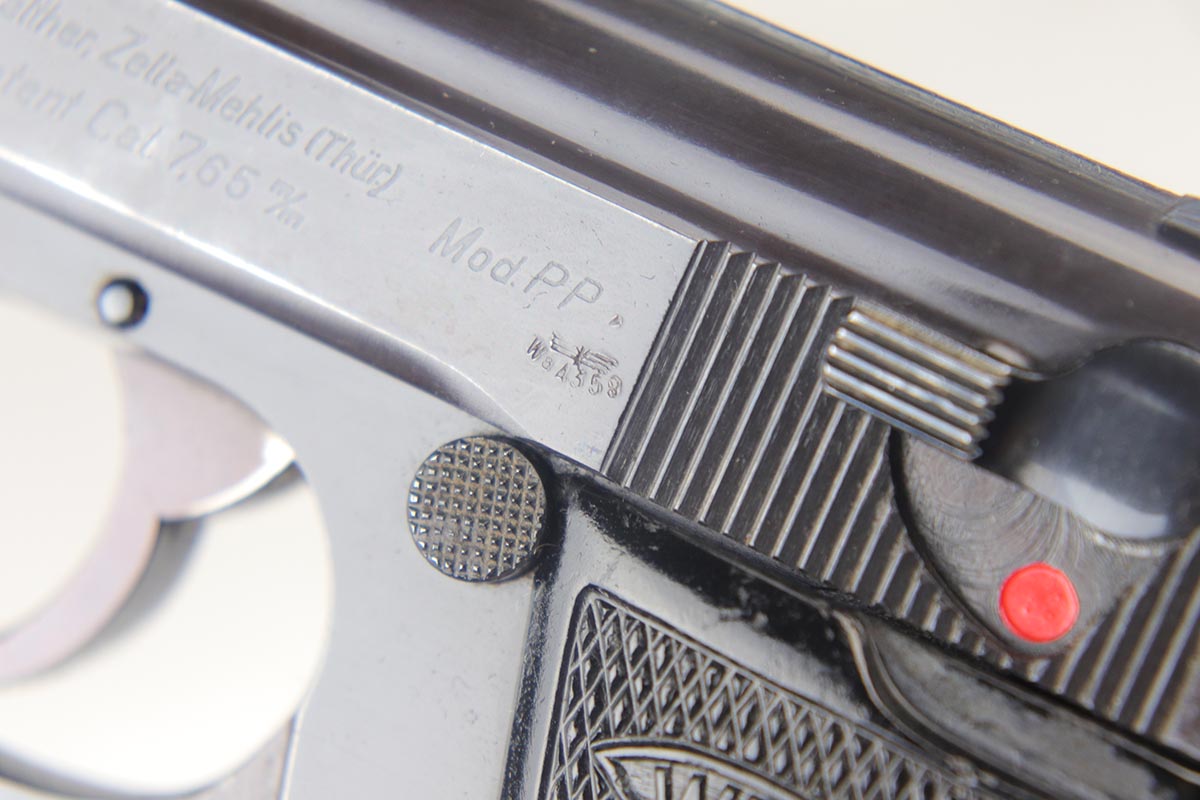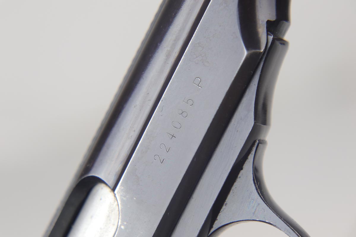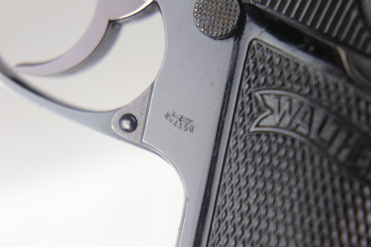 7/24/18 – This is a Luftwaffe contract Walther PP rig from 1942. These are distinct in that they are in that they are waffen proofed on the slide and frame and their magazines are numbered on the base plate. They were issued with two numbered magazines, and this one comes with two near match original magazines. The pistol serial is 224xxx and the magazines are 224xxx and 223xxx. The original finish covers about 95% of the gun with most of the wear found on the left side of the slide and bottom of the back strap. The gun has matching frame and slide with eagle/N proofs on the slide, barrel and ejection port. Mechanically it is in good condition and has an excellent, shiny bore. Comes with a period correct but unmarked holster in excellent condition.