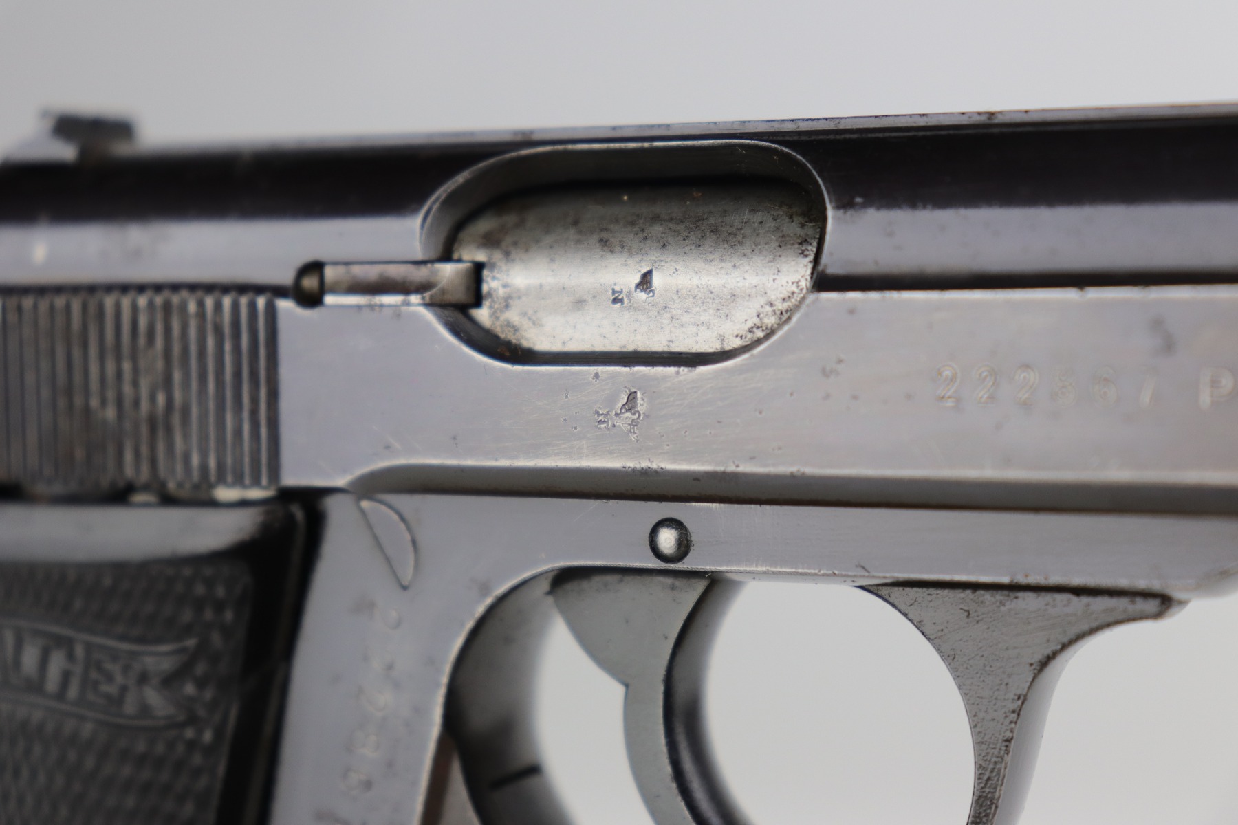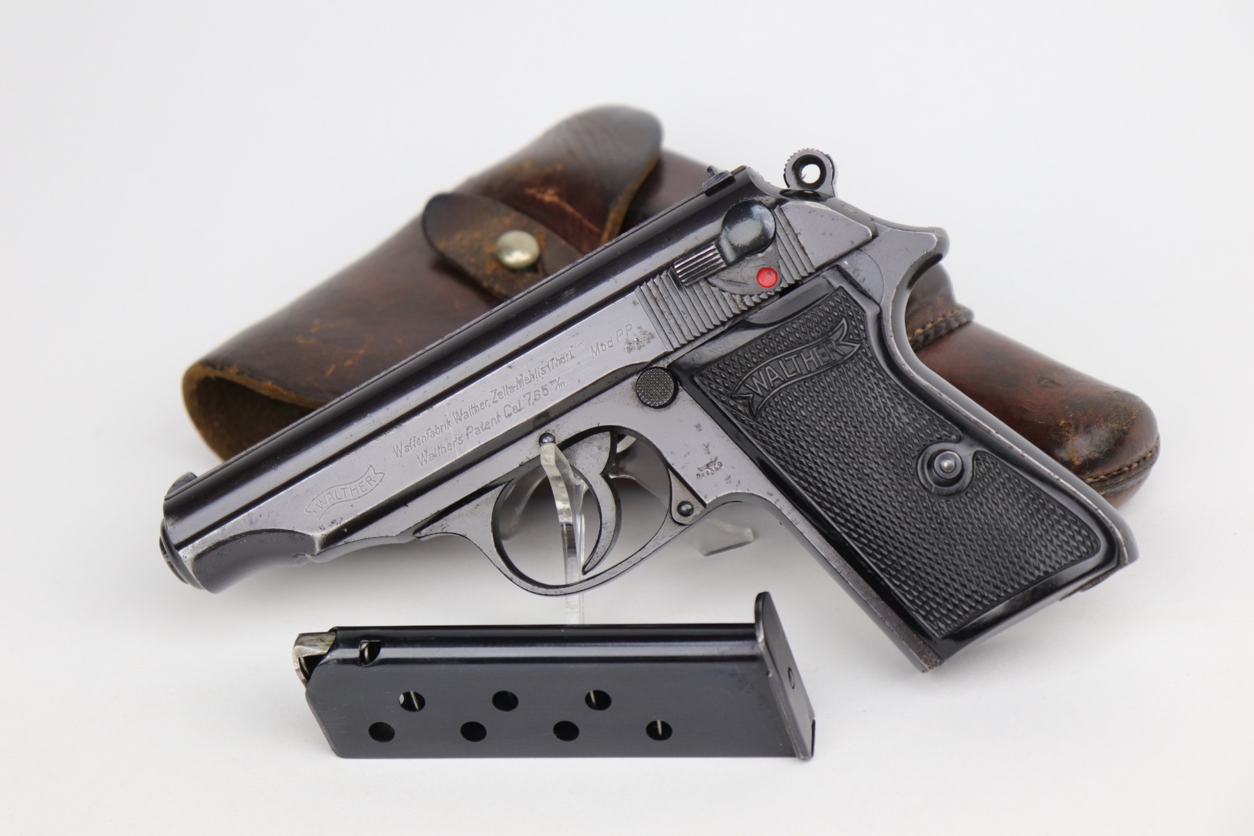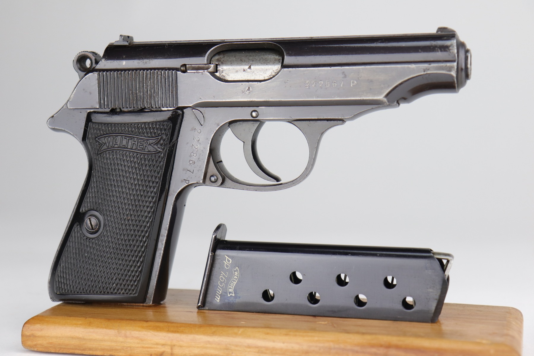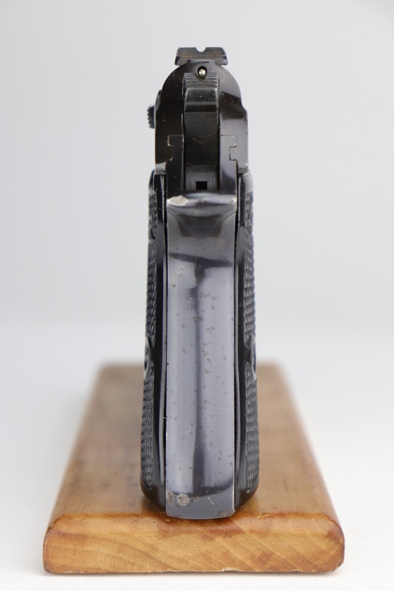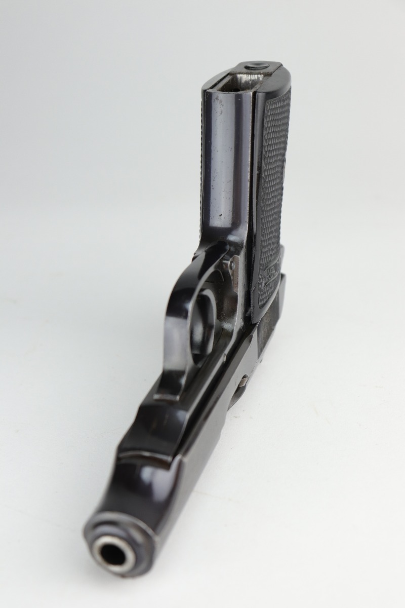 10/29/20 – This is a very nice example of Walther PP rig issued to the Luftwaffe in 1941. This gun is matching, has the proper “Waffen 359” military proofs, and is in the correct serial range to have been issued to a pilot or flight crew in the Luftwaffe. The bluing rates about 90%. There isn’t much actual finish loss, but there is minor freckling and spotty oxidation throughout. There is minor muzzle wear, wear on the high edges, and an area of wear on the right side of the slide. There are a few small dings, most noticeable on the tang and base of the back strap. It comes with excellent Walther grips, one post-war magazine, and a nice Akah-marked brown leather holster. The bore is excellent – shiny with strong rifling.