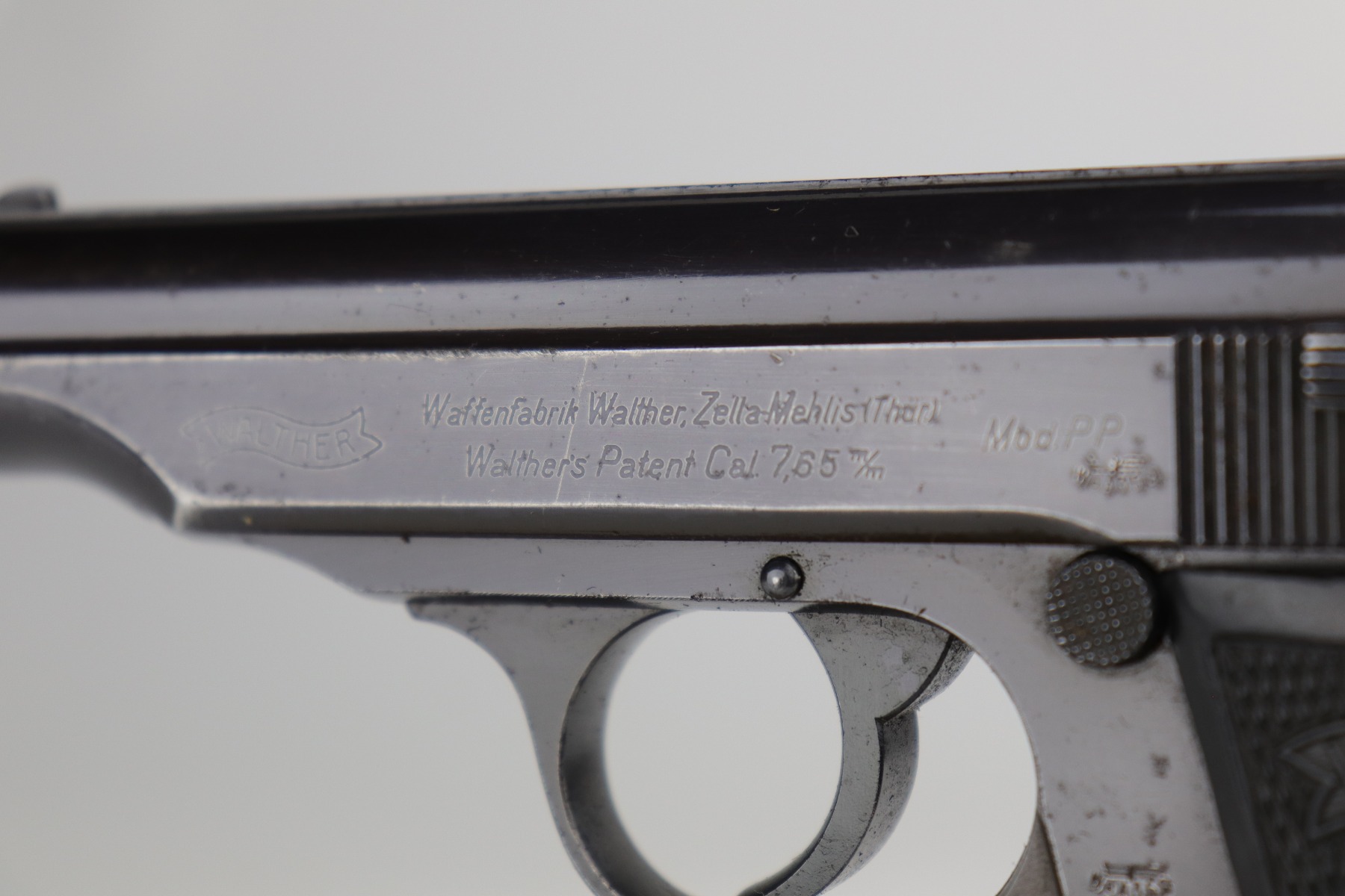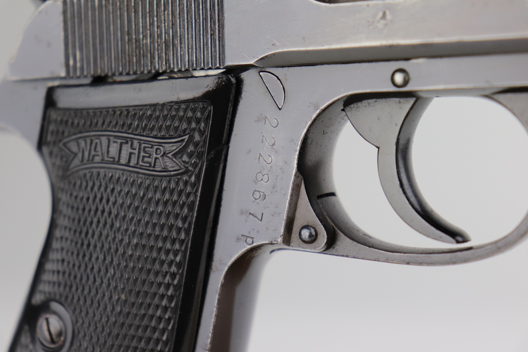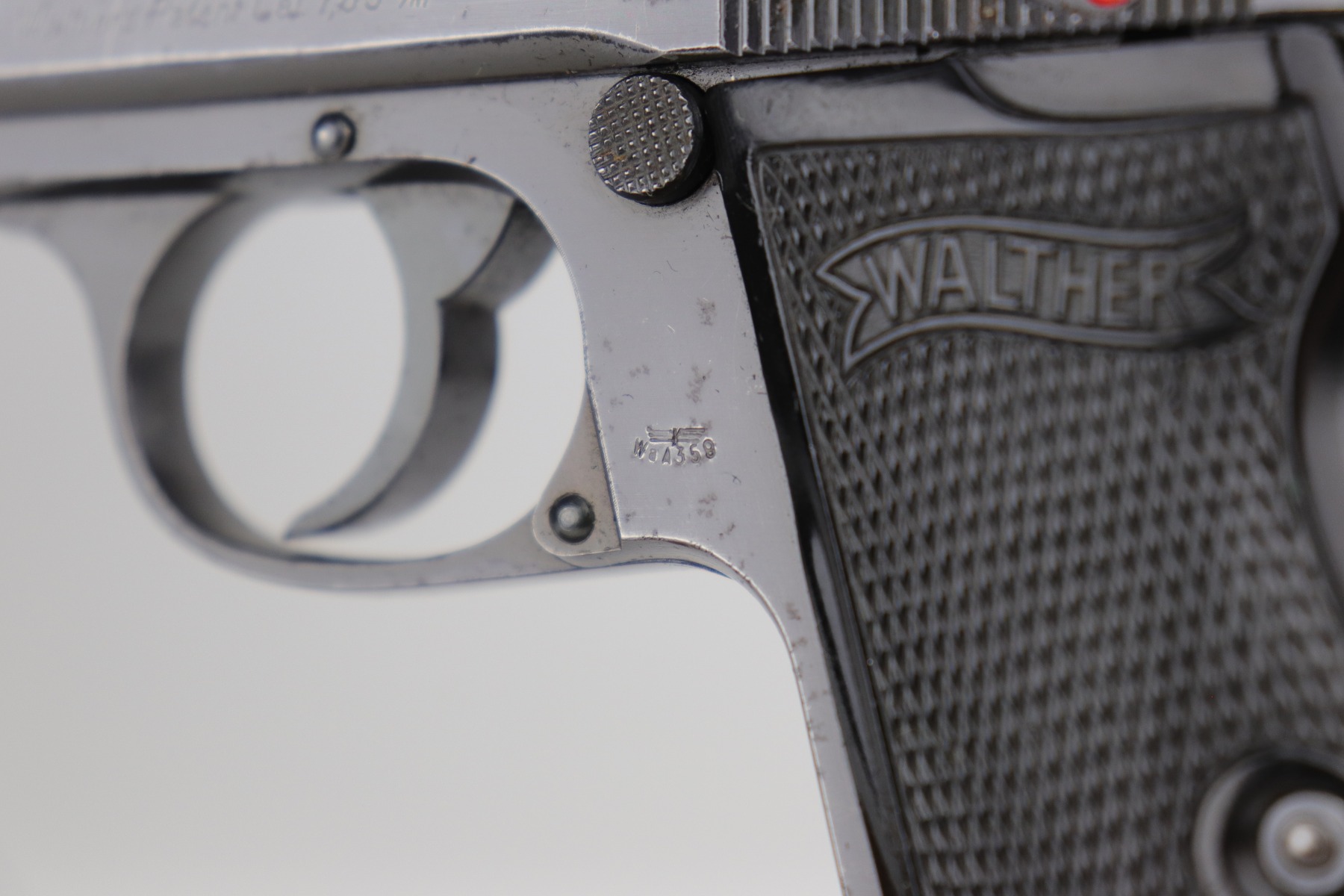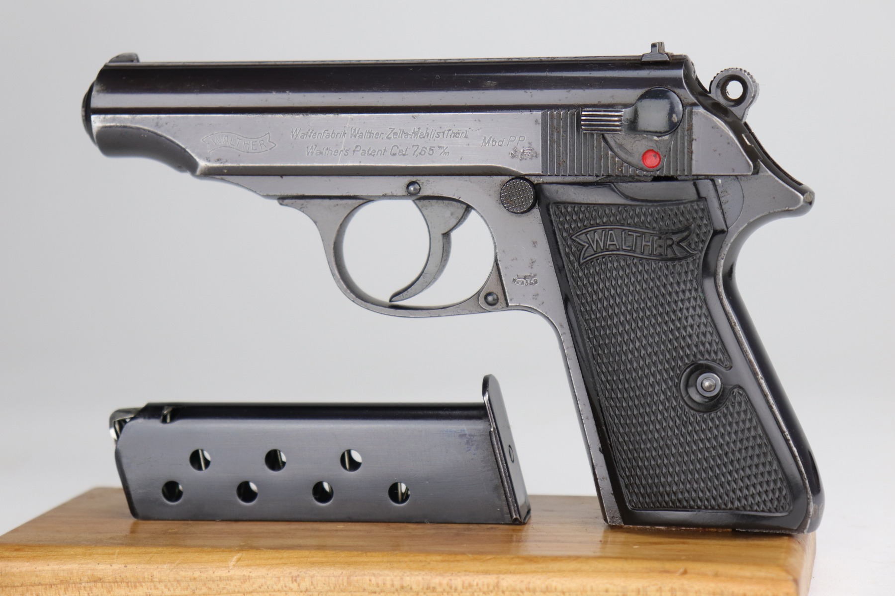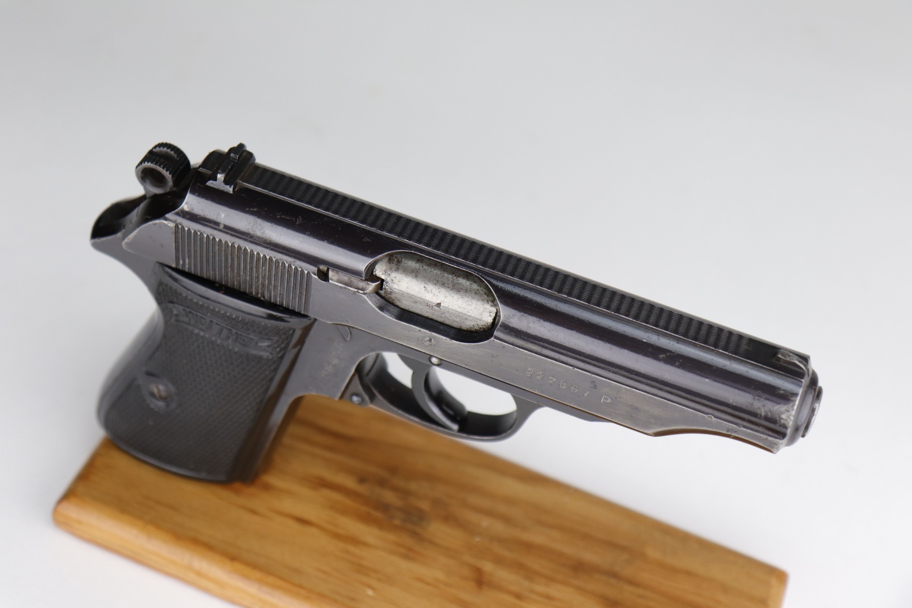 10/29/20 – This is a very nice example of Walther PP rig issued to the Luftwaffe in 1941. This gun is matching, has the proper “Waffen 359” military proofs, and is in the correct serial range to have been issued to a pilot or flight crew in the Luftwaffe. The bluing rates about 90%. There isn’t much actual finish loss, but there is minor freckling and spotty oxidation throughout. There is minor muzzle wear, wear on the high edges, and an area of wear on the right side of the slide. There are a few small dings, most noticeable on the tang and base of the back strap. It comes with excellent Walther grips, one post-war magazine, and a nice Akah-marked brown leather holster. The bore is excellent – shiny with strong rifling.