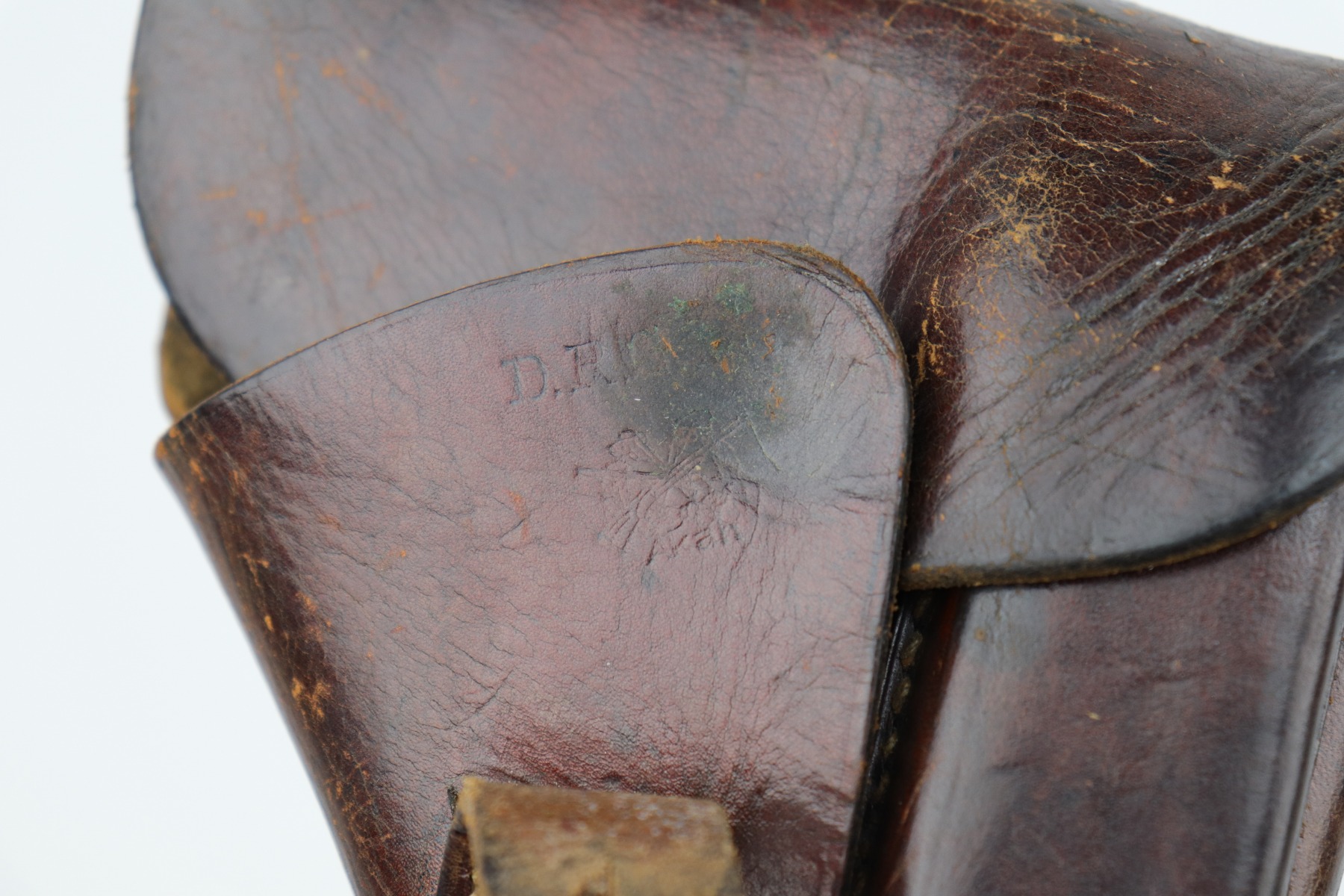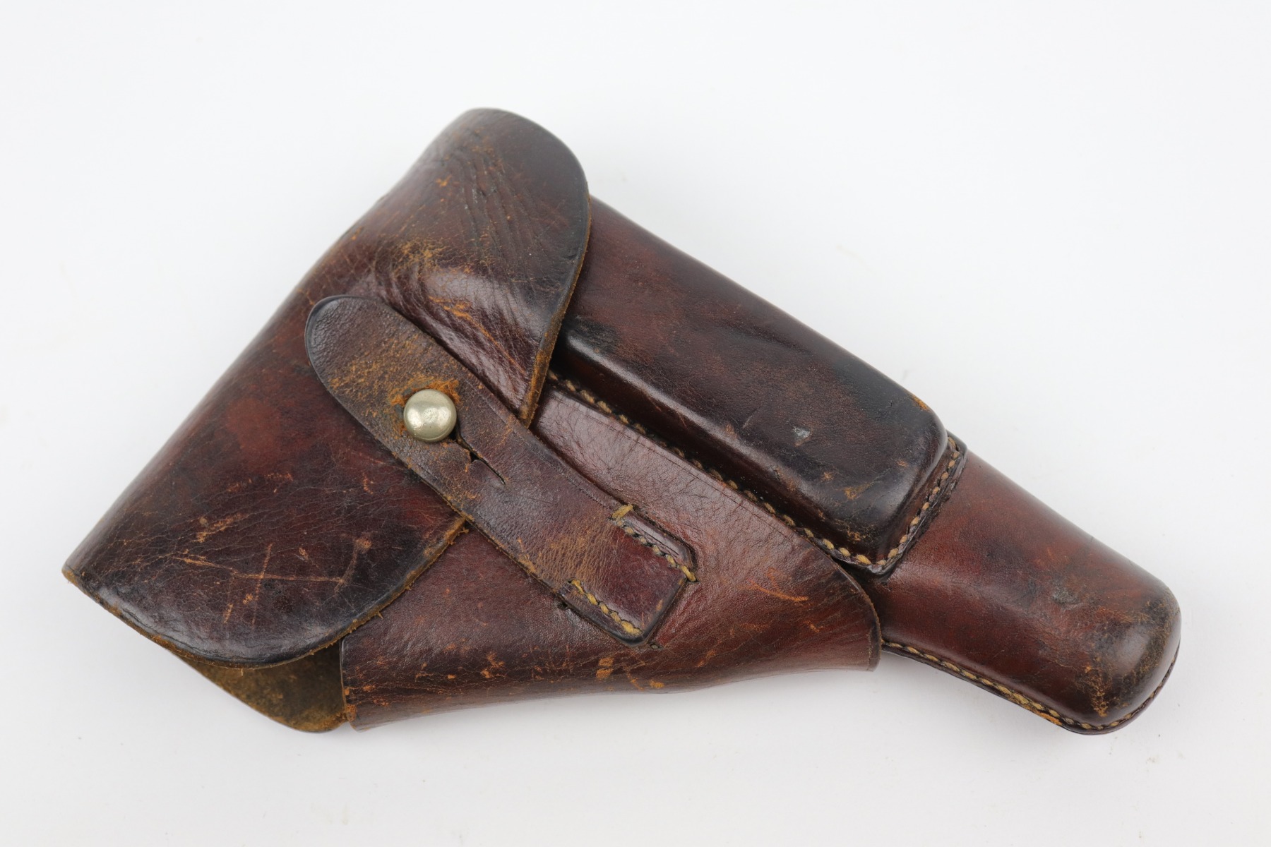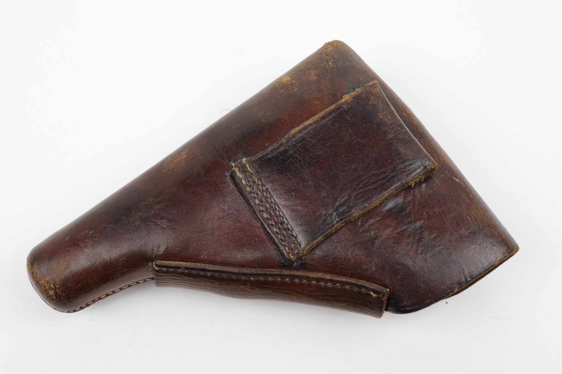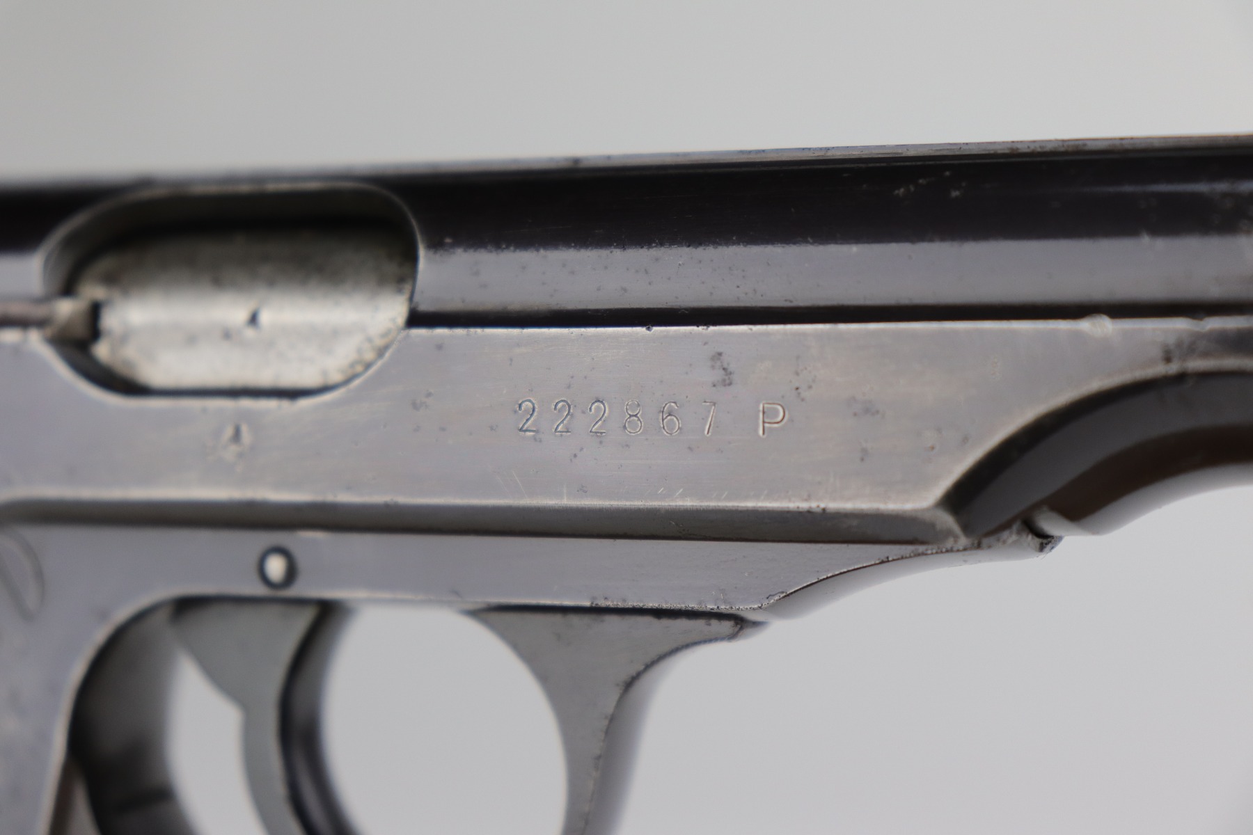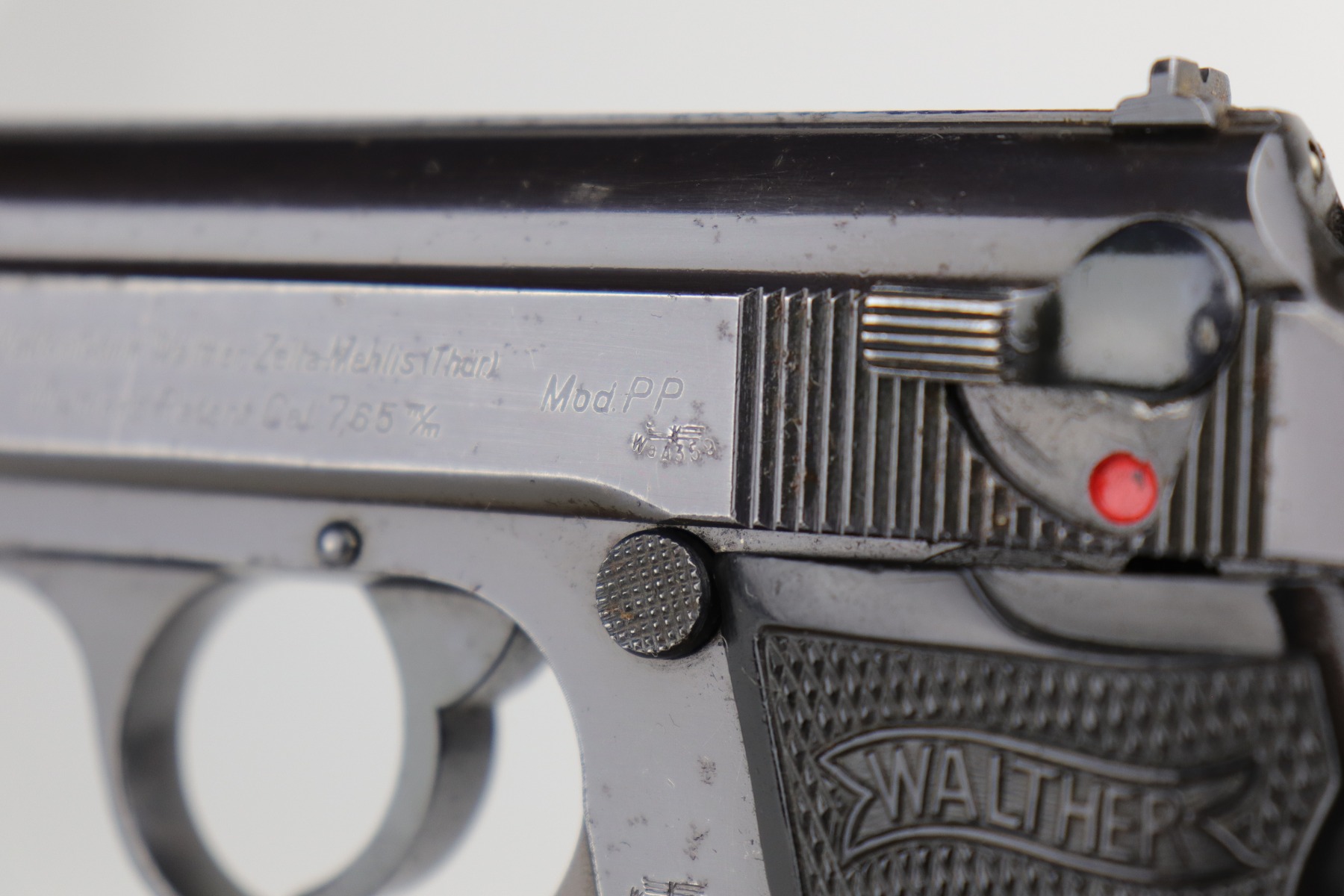 10/29/20 – This is a very nice example of Walther PP rig issued to the Luftwaffe in 1941. This gun is matching, has the proper “Waffen 359” military proofs, and is in the correct serial range to have been issued to a pilot or flight crew in the Luftwaffe. The bluing rates about 90%. There isn’t much actual finish loss, but there is minor freckling and spotty oxidation throughout. There is minor muzzle wear, wear on the high edges, and an area of wear on the right side of the slide. There are a few small dings, most noticeable on the tang and base of the back strap. It comes with excellent Walther grips, one post-war magazine, and a nice Akah-marked brown leather holster. The bore is excellent – shiny with strong rifling.