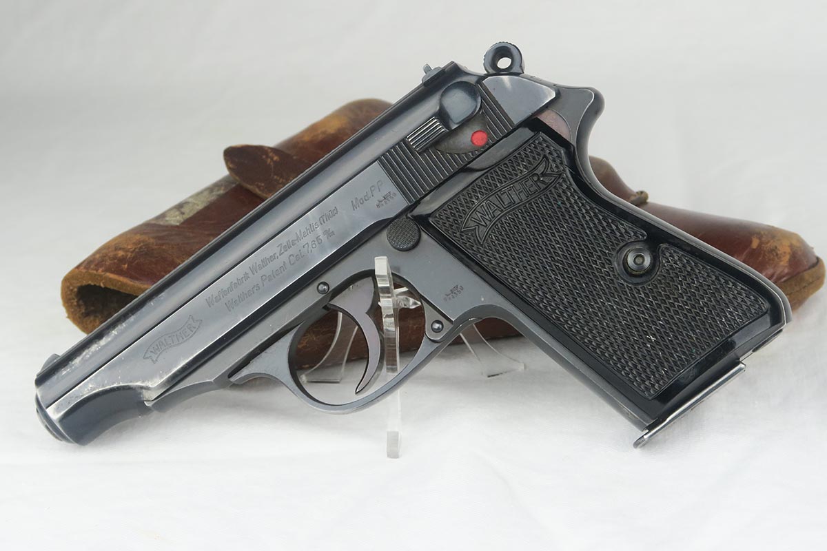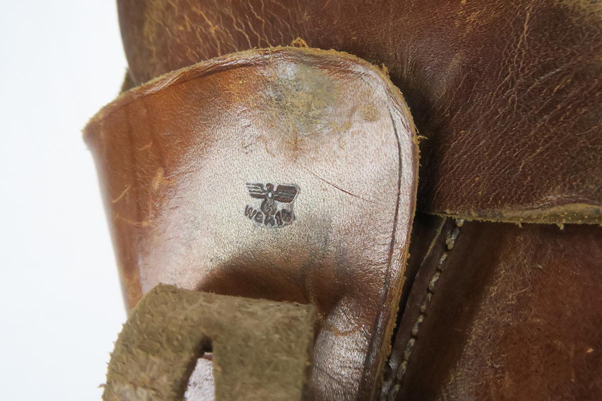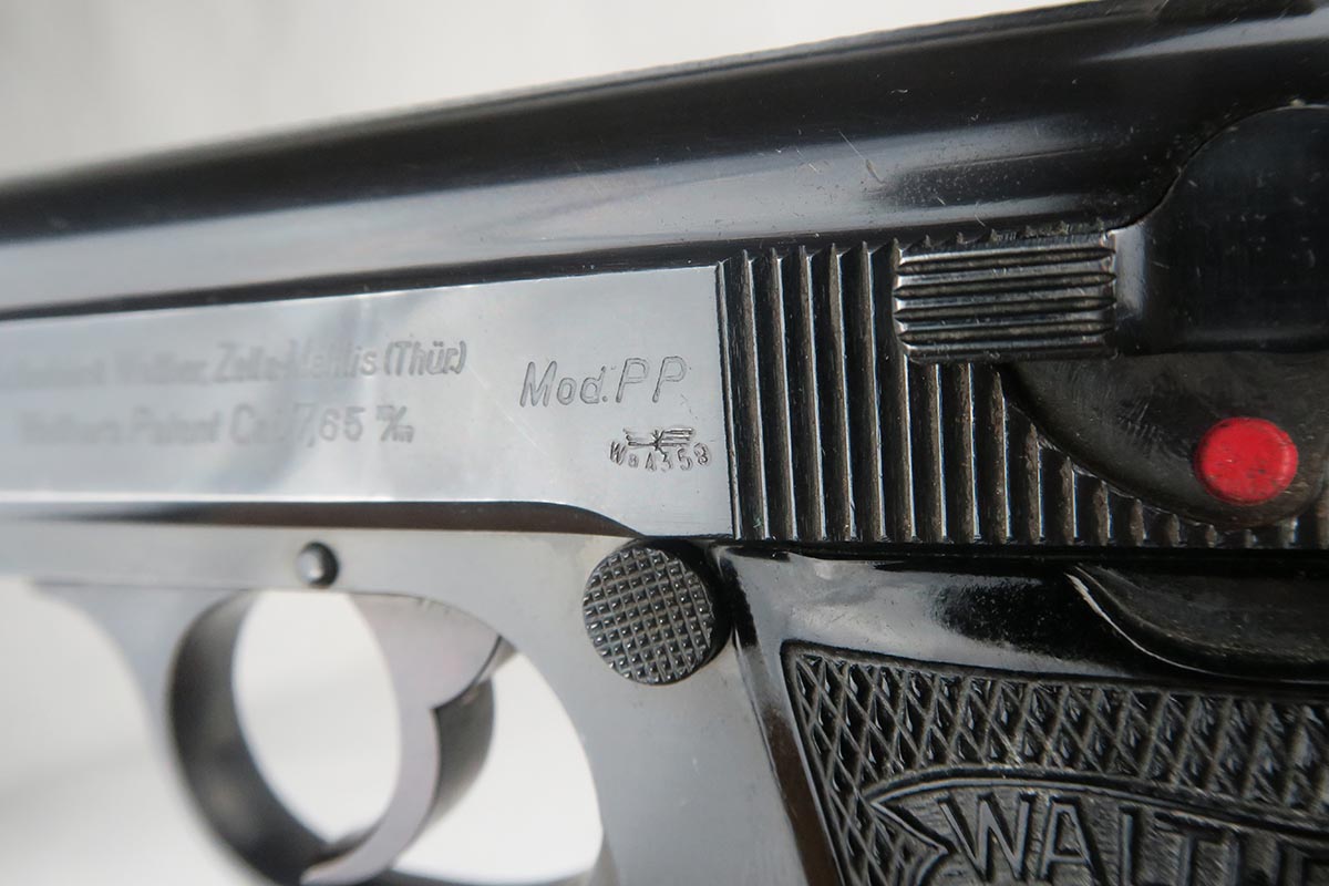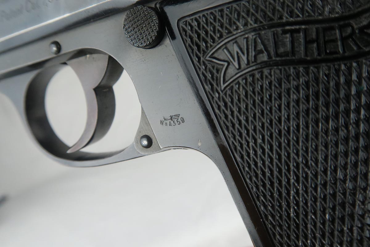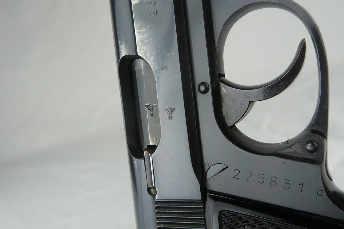 11/29/17 – This is an early waffen proofed PP made in 1941/42 with the early high polish finish.   The slide and frame are both numbered indicating it was most likely a Luftwaffe contract gun.  Also, the Luftwaffe PP’s are the only ones that came with numbered magazines (found on the bottom of the magazine).  This gun HAS such a numbered magazine but it is off by about 250 numbers. The finish and parts are all original and the grips are correct to the gun.  Finish rates in the low 90’s with holster wear on both sides of the slide.  The gun comes with a waffen 100 proofed holster, which is rare and desirable.  Inside the flap is the name of the Steglitz and a number.   This could be the officer who carried the rig in WW2 or the area where he was stationed as Steglitz is an area just outside of Berlin. My search seems to indicate there was a small Luftwaffe base in the Steglitz area.  Regardless of the meaning, the PP and PPk’s were favored among the pilots and officers.   A little bit of research could produce interesting results.