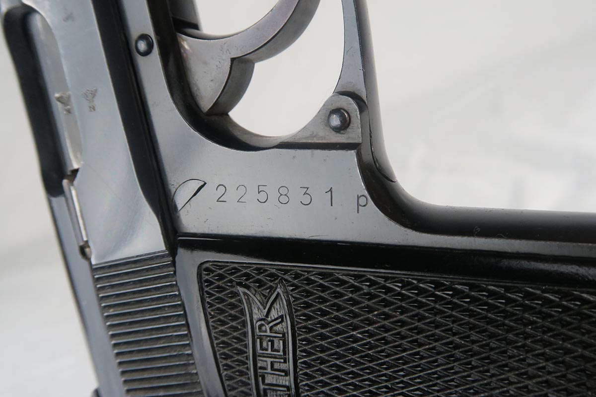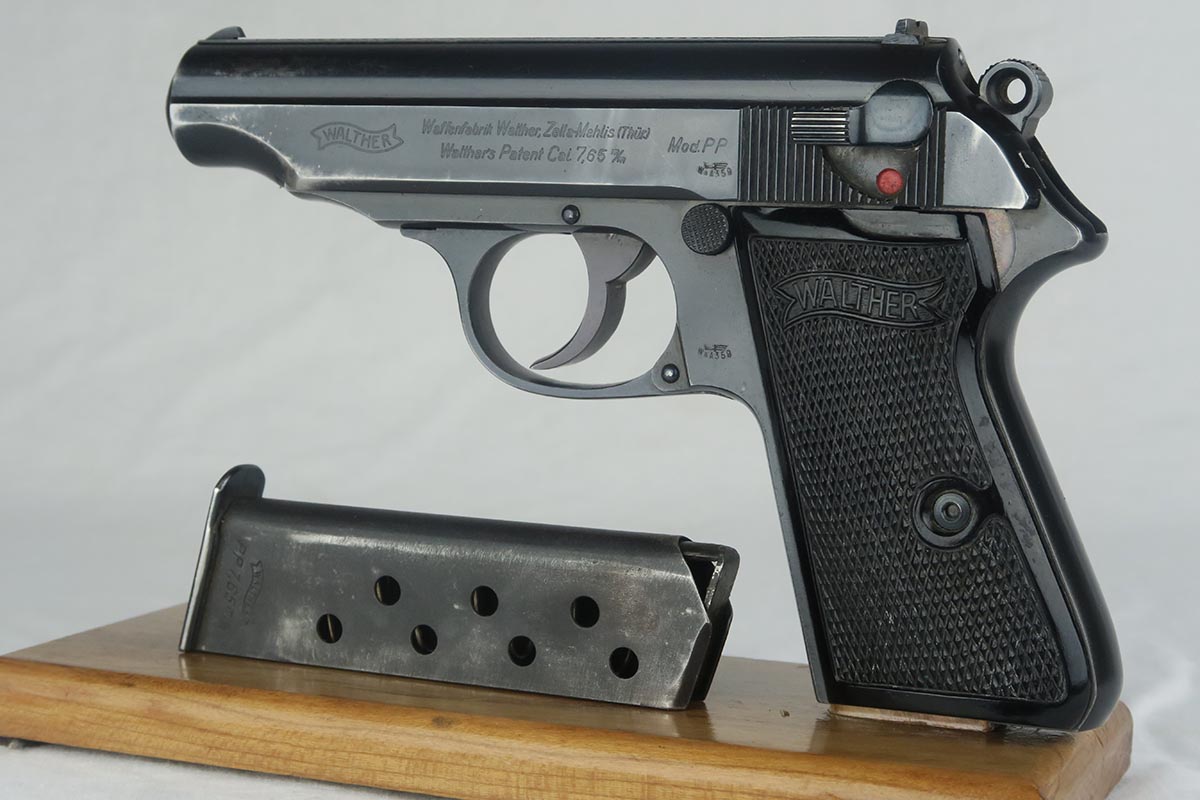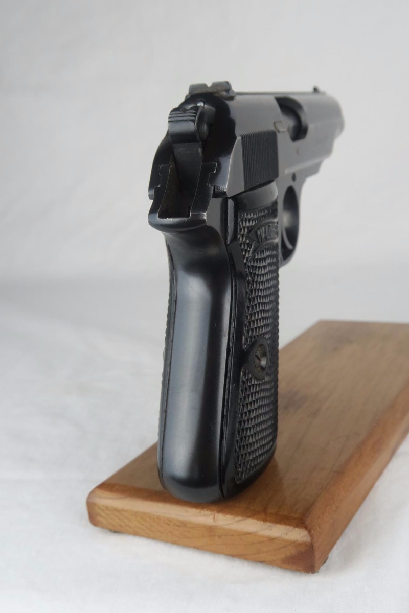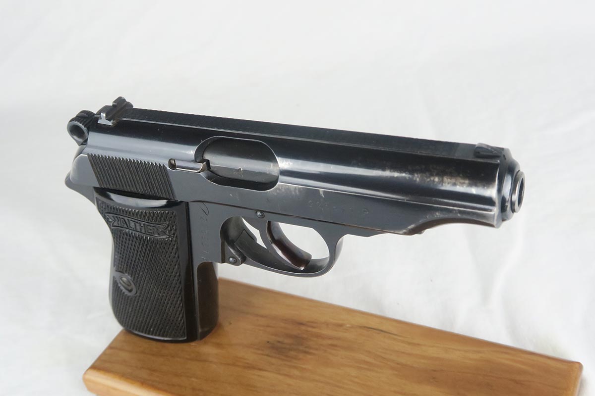 11/29/17 – This is an early waffen proofed PP made in 1941/42 with the early high polish finish.   The slide and frame are both numbered indicating it was most likely a Luftwaffe contract gun.  Also, the Luftwaffe PP’s are the only ones that came with numbered magazines (found on the bottom of the magazine).  This gun HAS such a numbered magazine but it is off by about 250 numbers. The finish and parts are all original and the grips are correct to the gun.  Finish rates in the low 90’s with holster wear on both sides of the slide.  The gun comes with a waffen 100 proofed holster, which is rare and desirable.  Inside the flap is the name of the Steglitz and a number.   This could be the officer who carried the rig in WW2 or the area where he was stationed as Steglitz is an area just outside of Berlin. My search seems to indicate there was a small Luftwaffe base in the Steglitz area.  Regardless of the meaning, the PP and PPk’s were favored among the pilots and officers.   A little bit of research could produce interesting results.
