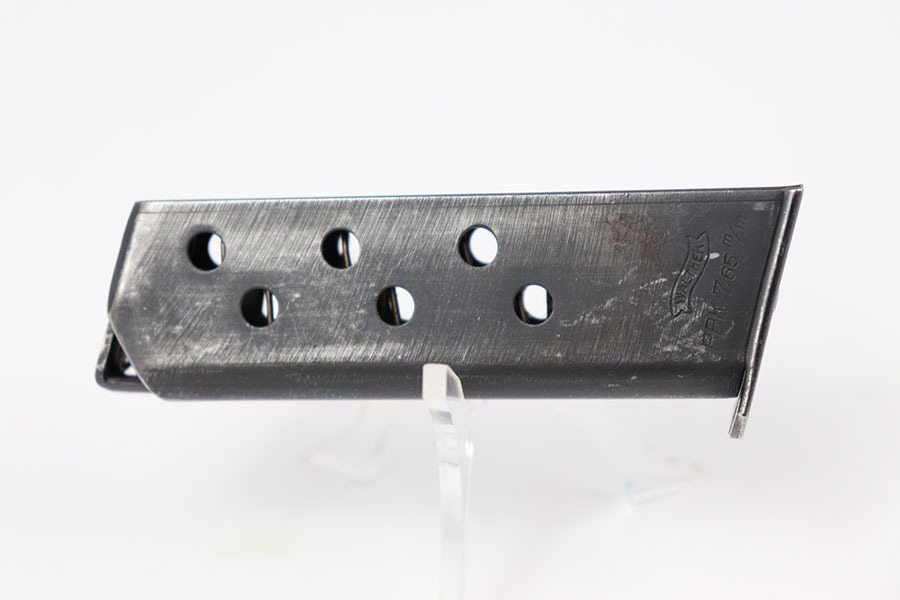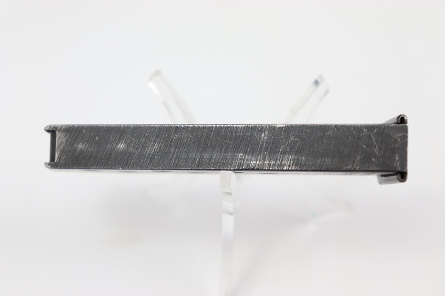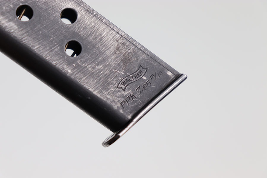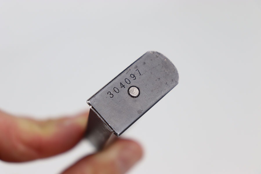 10/16/24 – This is an original numbered Walther PPK magazine. The magazine is a wartime production with serial number 304097 stamped on the base. This number is in the known range of Luftwaffe PPK pistols. The finish is great throughout this example with some mild wear to its original wartime dull blued finish but no major issues. This example has some heavier machining marks but this does not affect its value as it’s from the factory. Strong, functional spring.
