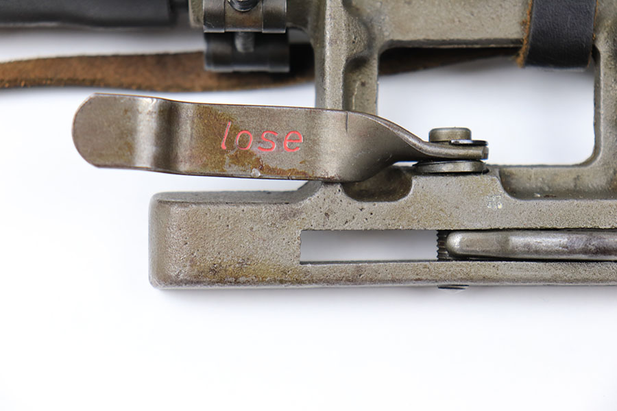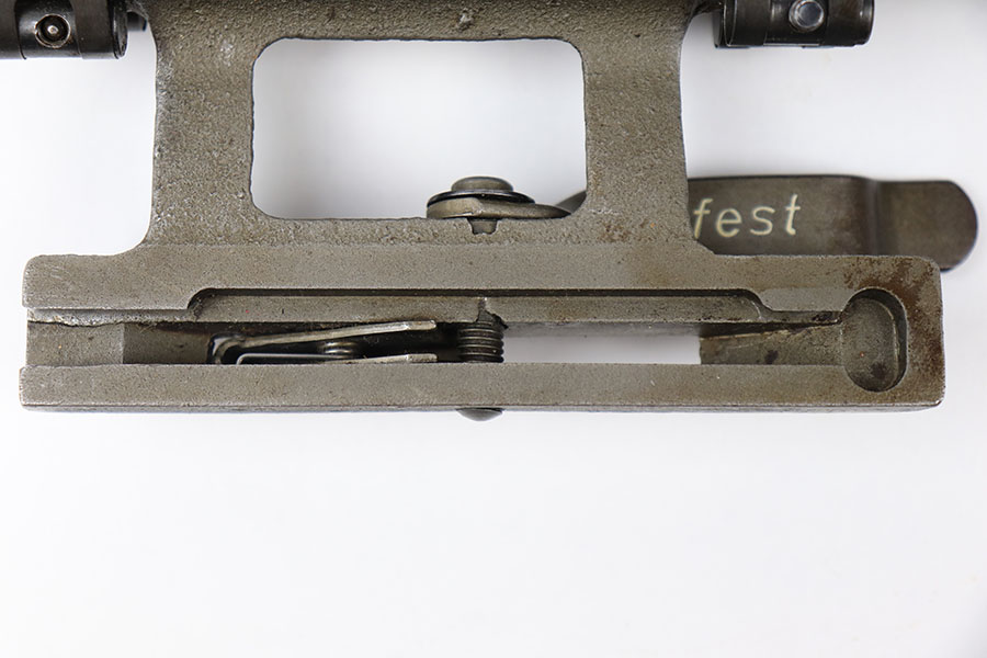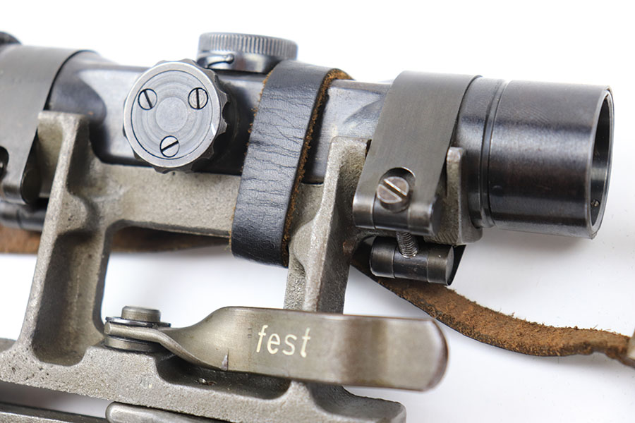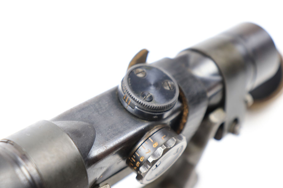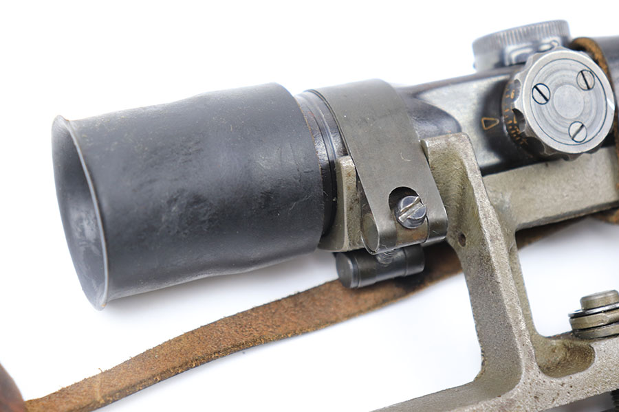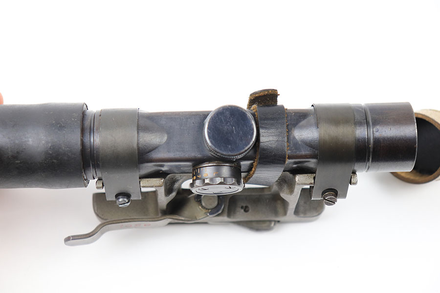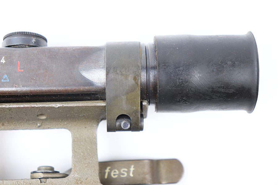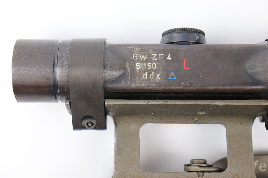 6/30/21 – This is an original Luftwaffe stamped ZF 4 scope with an original mount. The scope is stamped with a large “L” for Luftwaffe, as well as a blue colored triangle. There is some light surface wear around this area from the leather eye cup straps, but generally this scope is in great condition. The optics are excellent and the top adjustment knob cap is still in place. The rubber eye cup is original as well with only some very small cracking around the edge. The most is phosphate and has eagle 359 proof stamps.