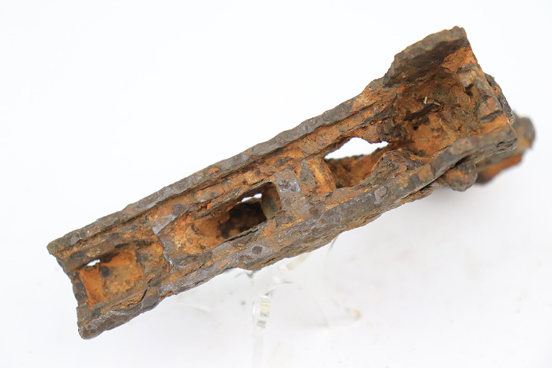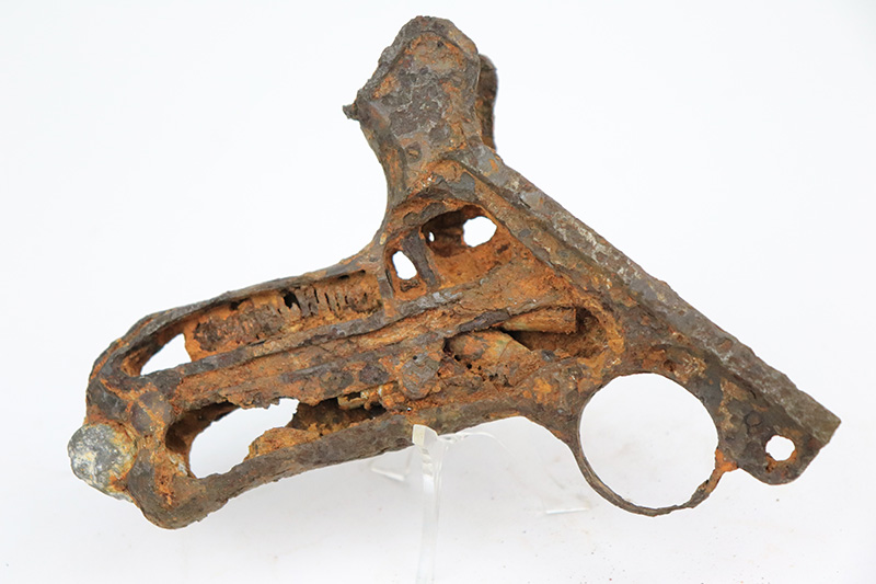 8/15/22 – This is a neat example of a Luger lower receiver dug up on a WW2 battlefield. This item comes to us as part of a collection of dug-up relics found across Eastern European WW2 battlefields. The receiver is in poor condition and non functional, but makes for an interesting display item.