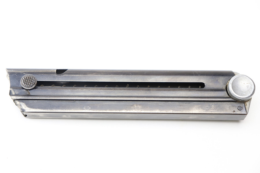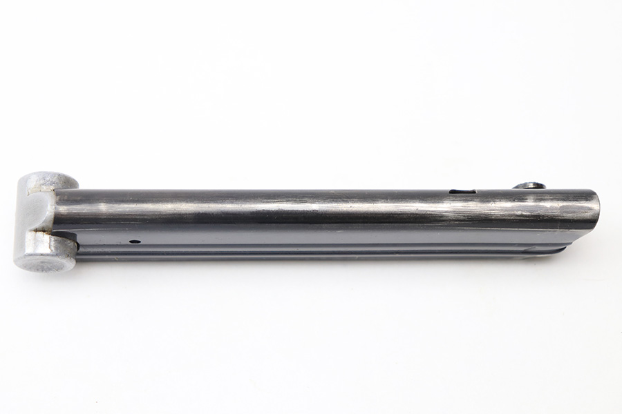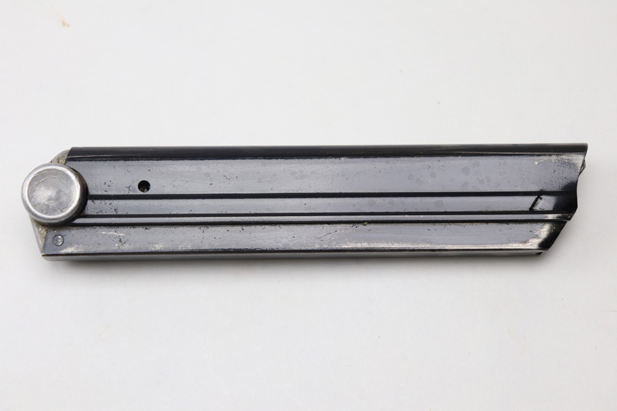 1/3/21 – This is a great example of a Luger magazine from WW2. The blued tube is in great condition with only minor use wear primarily isolated to the spines and edges of the magazine. The magazine’s bottom is marked with serial number “4775d”, a “+”, and a “E/63” proof. The spring and follower are strong and functional.