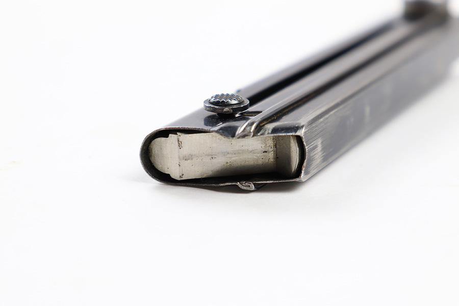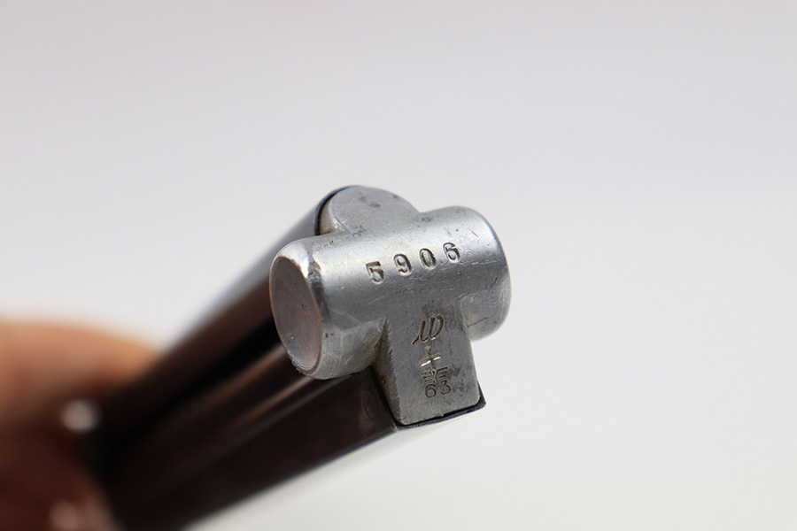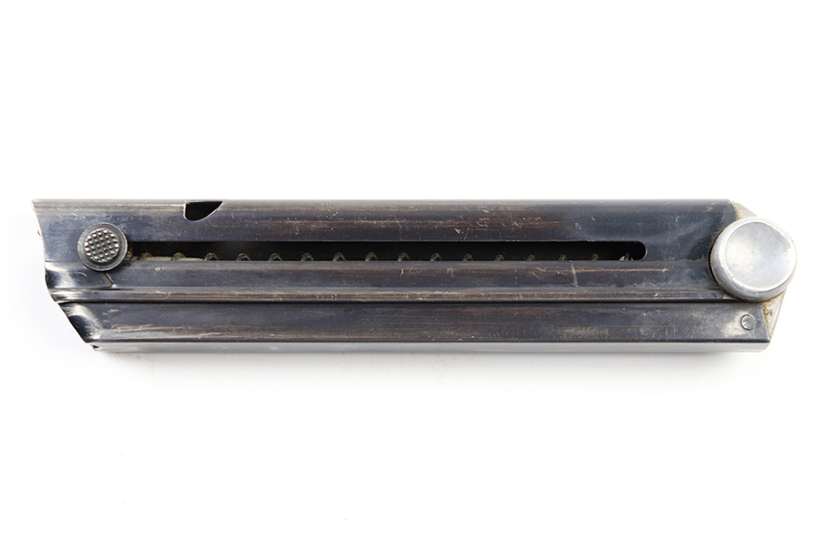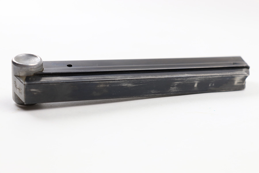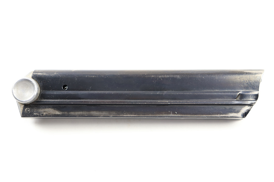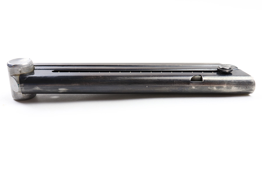 6/30/22 – This is an original Mauser eagle 63 proofed luger magazine. The magazine has a blued tube and aluminum base. The base is serial numbered and proof stamped with the larger style stick winged eagle 63 proof. The tube has some mild finish loss but no rust or pitting. Fully functional spring.