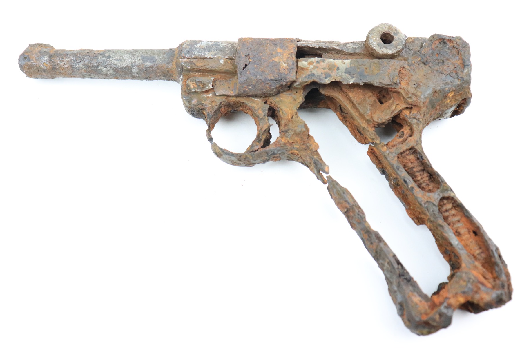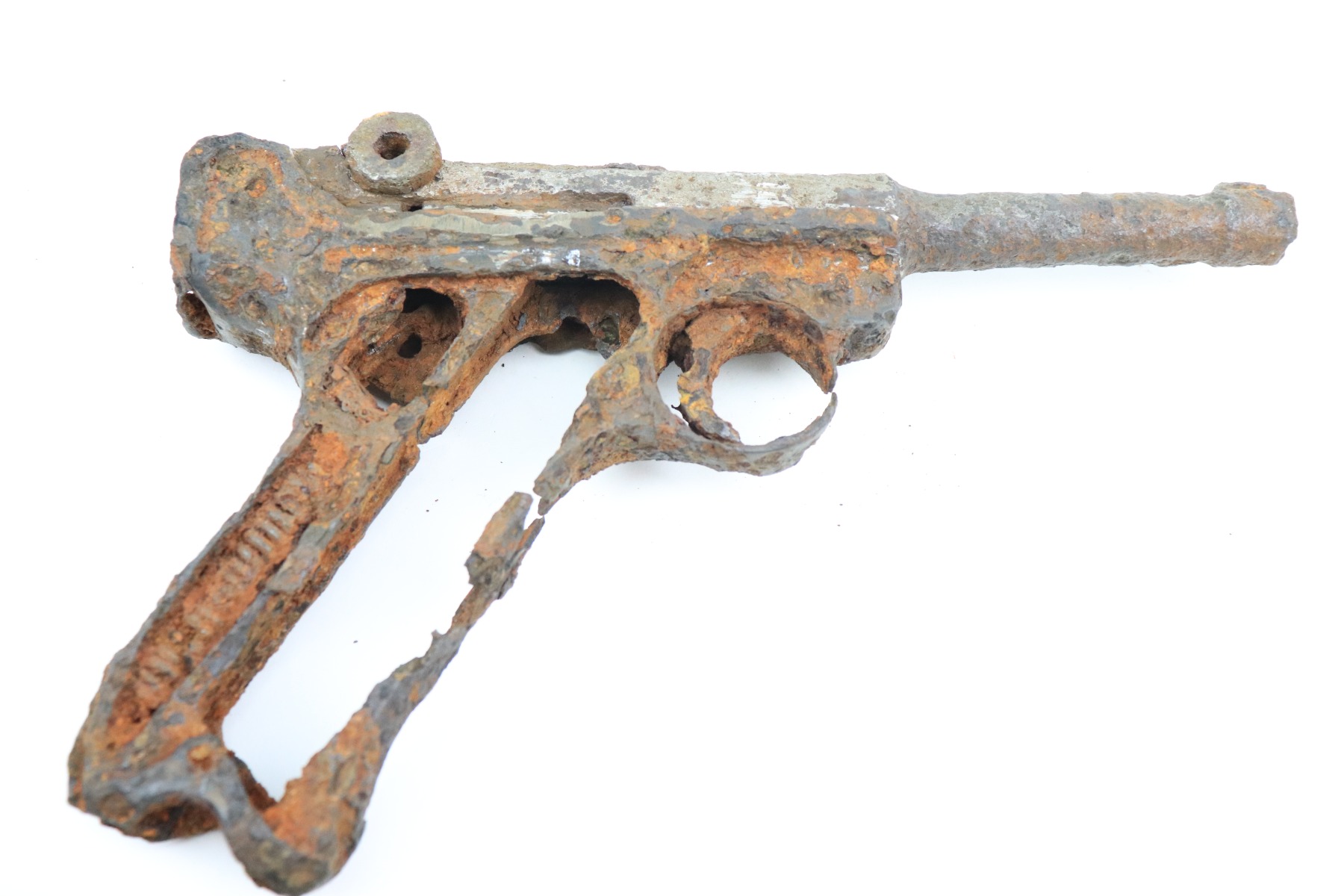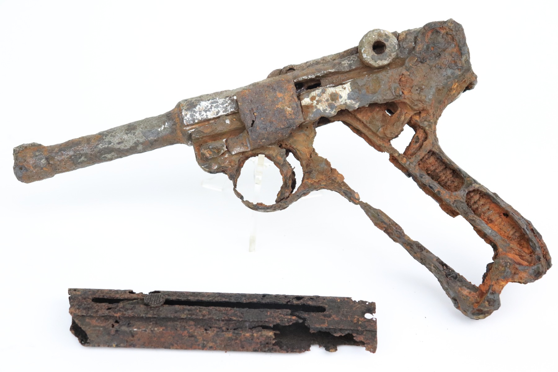 6/28/22 – This is a a really cool Luger relic dug up on a WW2 battlefield! This particular gun came to us as a part of a large collection of relics dug up on Eastern European WW2 battlefields. This one is a Luger and a magazine. The gun is in poor condition overall – heavily rusted and pitted throughout, and some areas have even completely rusted away. The wood grips have rotted away. It looks like someone tried to take a grinder to it on both sides of the slide. Comes with one magazine in the same condition. There are no moving parts on this gun (everything is rusted together) and the receiver is destroyed. So this is a non-gun and does not require an FFL.