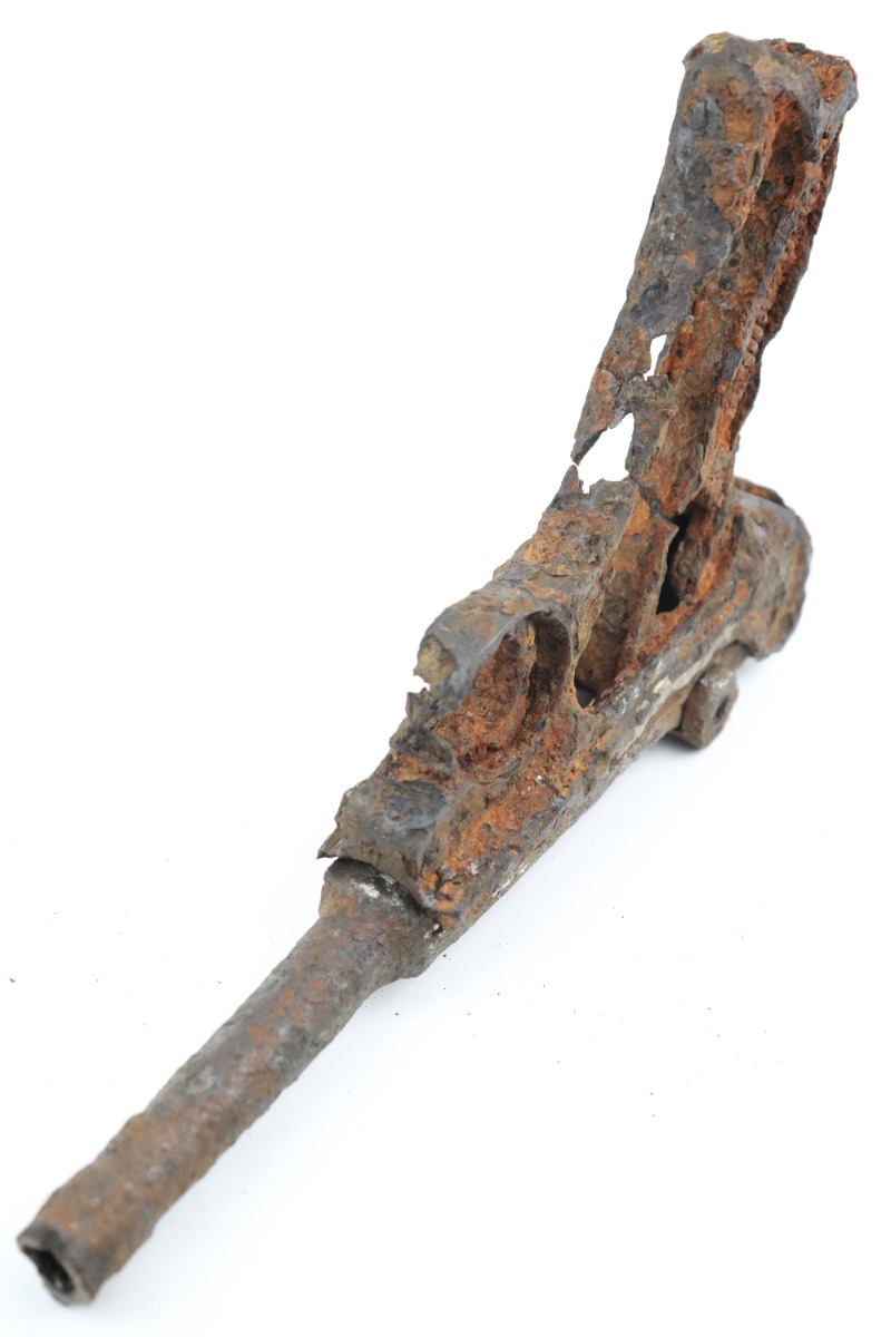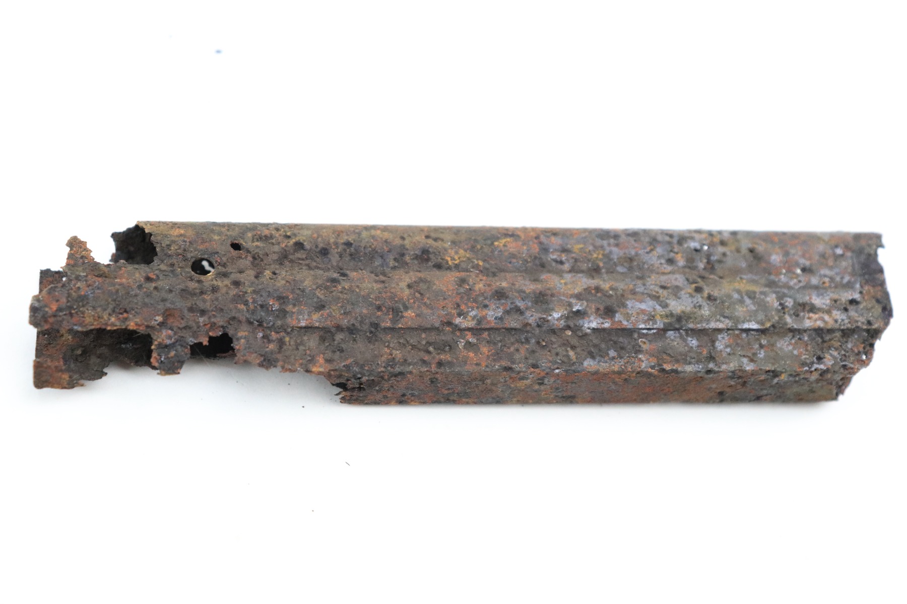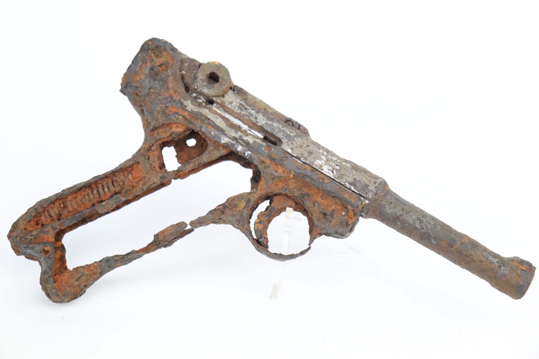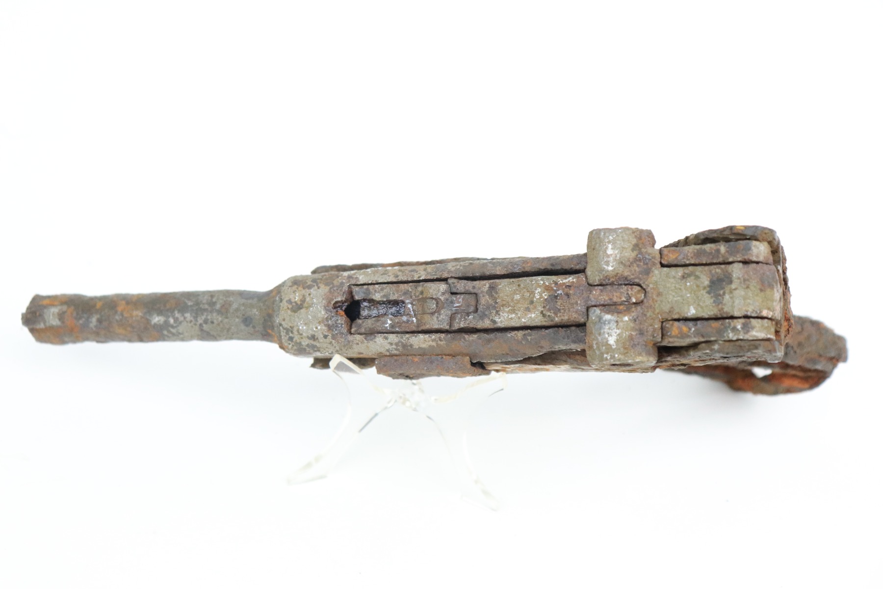 6/28/22 – This is a a really cool Luger relic dug up on a WW2 battlefield! This particular gun came to us as a part of a large collection of relics dug up on Eastern European WW2 battlefields. This one is a Luger and a magazine. The gun is in poor condition overall – heavily rusted and pitted throughout, and some areas have even completely rusted away. The wood grips have rotted away. It looks like someone tried to take a grinder to it on both sides of the slide. Comes with one magazine in the same condition. There are no moving parts on this gun (everything is rusted together) and the receiver is destroyed. So this is a non-gun and does not require an FFL.