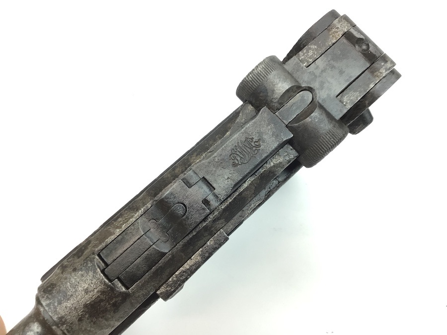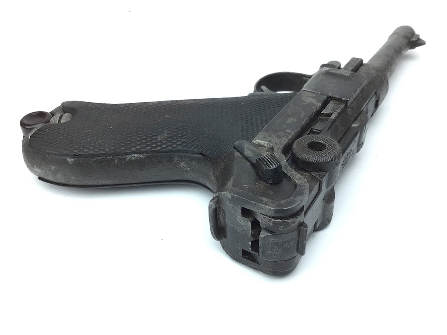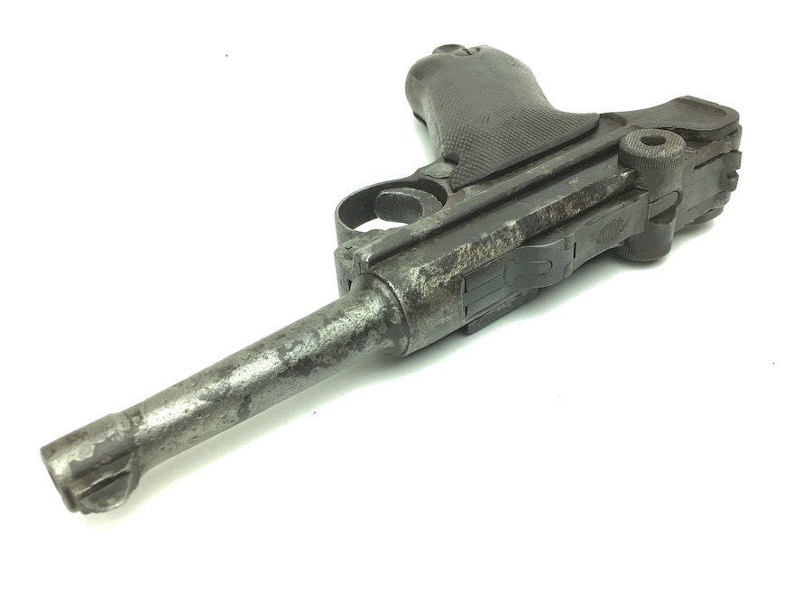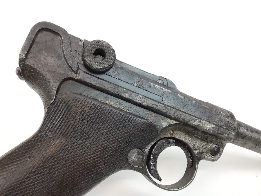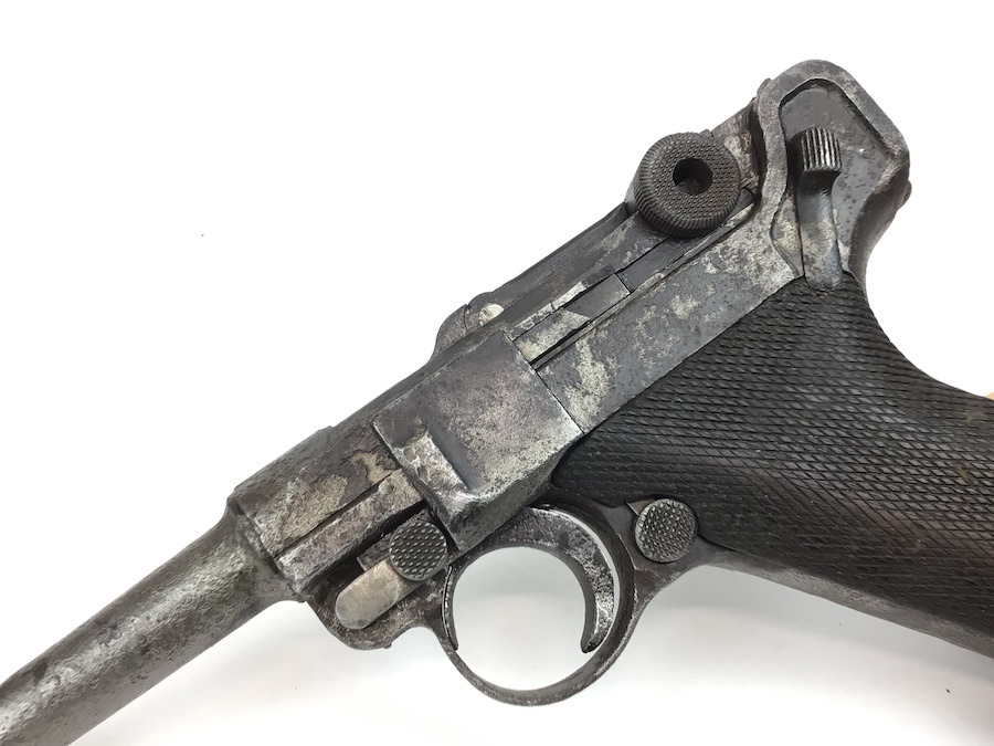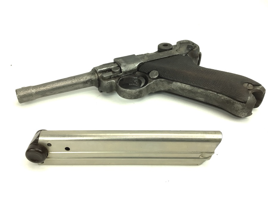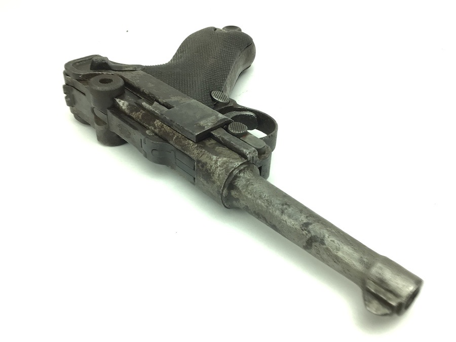 8/2/22 – This is a a really cool Luger relic dug up on a WW2 battlefield! This particular gun came to us as a part of a large collection of relics dug up on Eastern European WW2 battlefields. The gun and parts are in poor condition overall – heavily pitted throughout. This pistol was completely disassembled, cleaned, lubricated and reassembled. It is functional, but being sold as display piece only. This is not a shooter. The wood grips are correct. The post war magazine was added to make it complete. Requires a C&R or FFL.