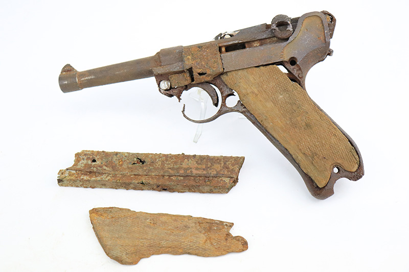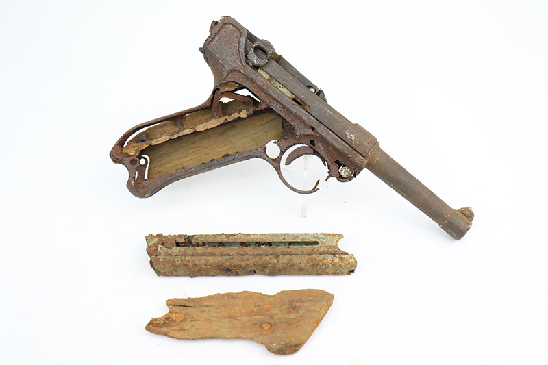 8/17/22 – This is a really neat Luger relic dug up on a WW2 battlefield! This particular gun came to us as a part of a large collection of relics dug up on Eastern European WW2 battlefields. The gun is either rusted away or together and is non-operational. This is a non-gun and does not require an FFL.
